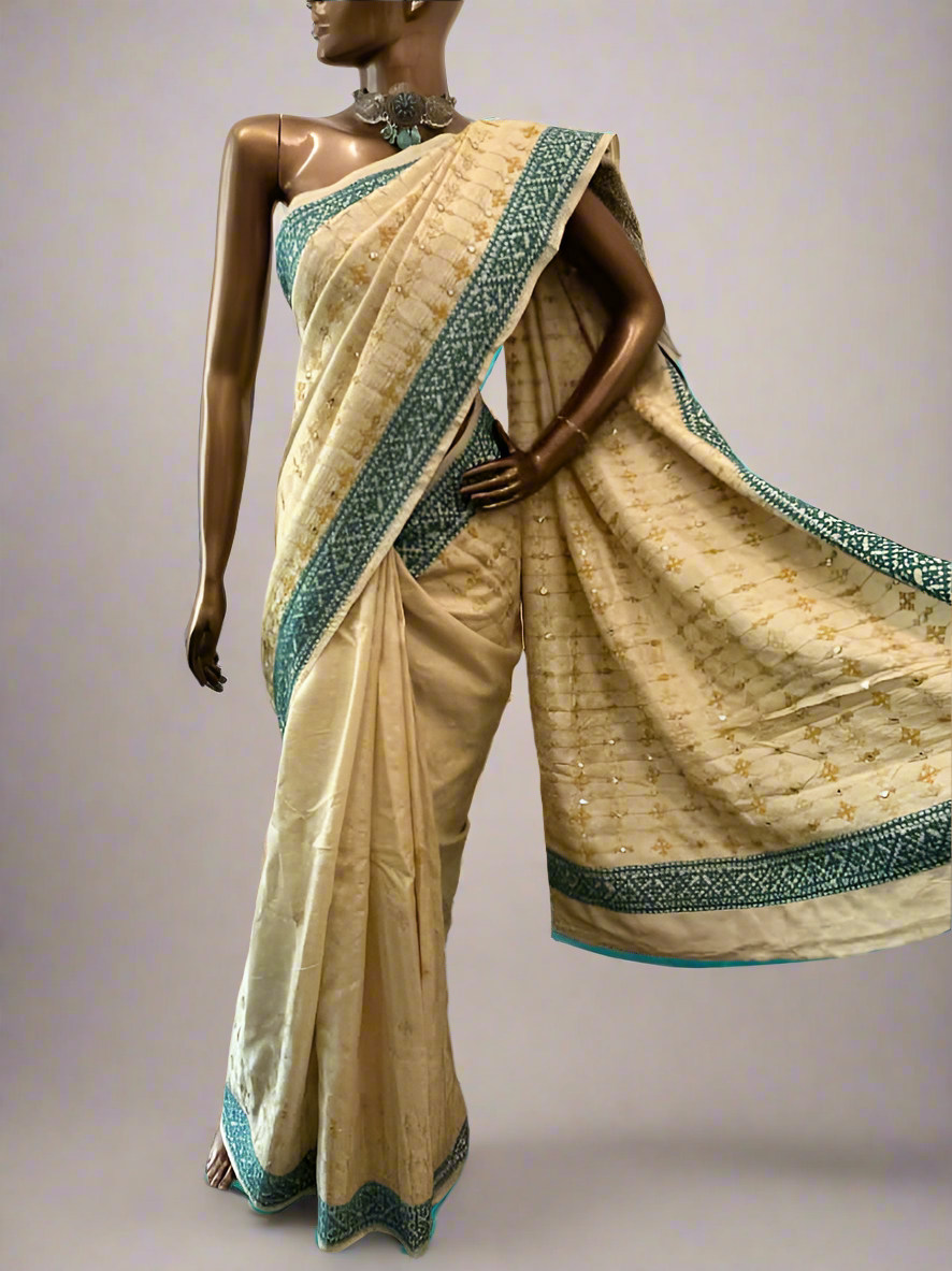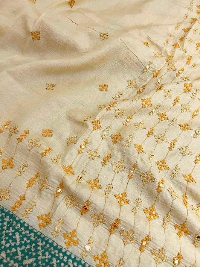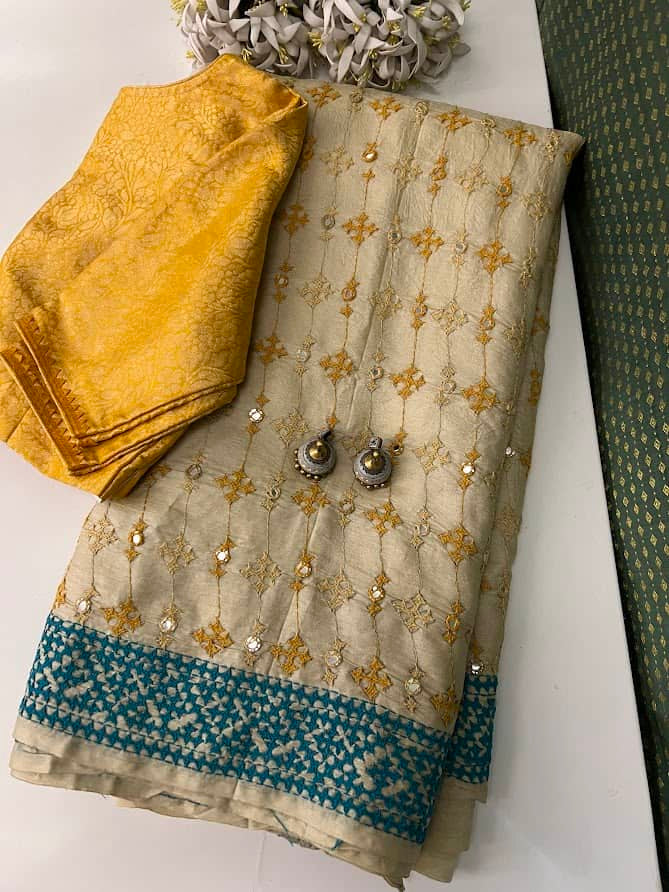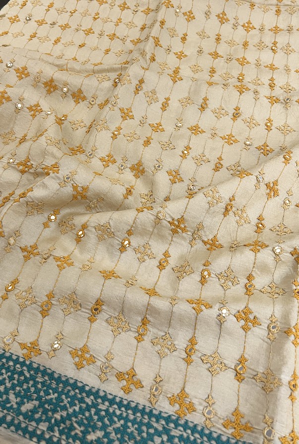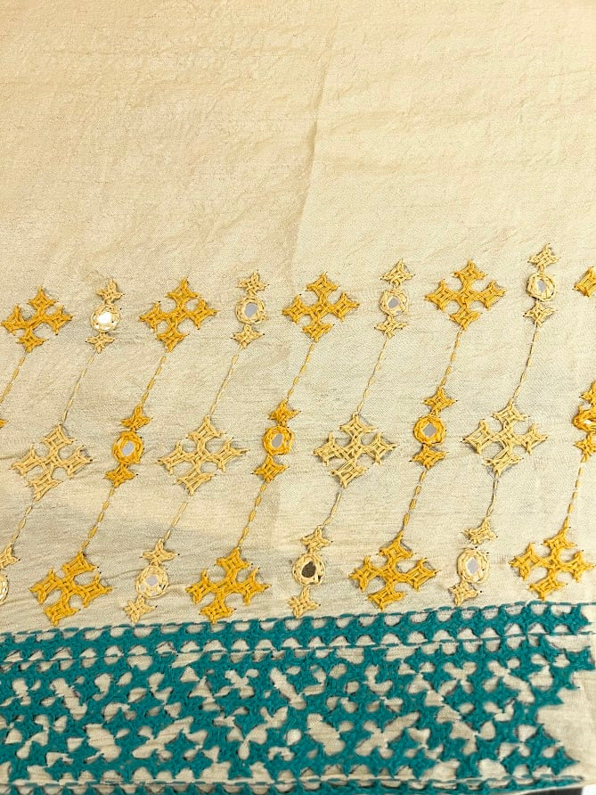 A serene cream handloom tussar saree graced with beige and yellow hand-embroidered kutch work on the body and pallu, accentuated by deep blue embroidery along the border. Capturing its true charm is a challenge for pictures alone. Featured with a yellow silk blouse from our collection and complemented by terracotta jhumkas, this ensemble exudes an enchanting appeal.