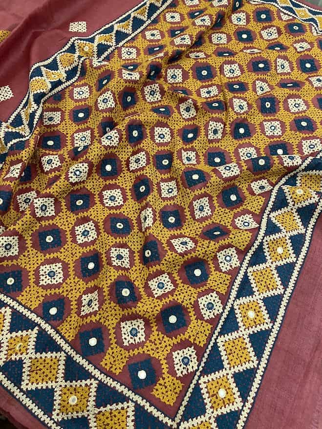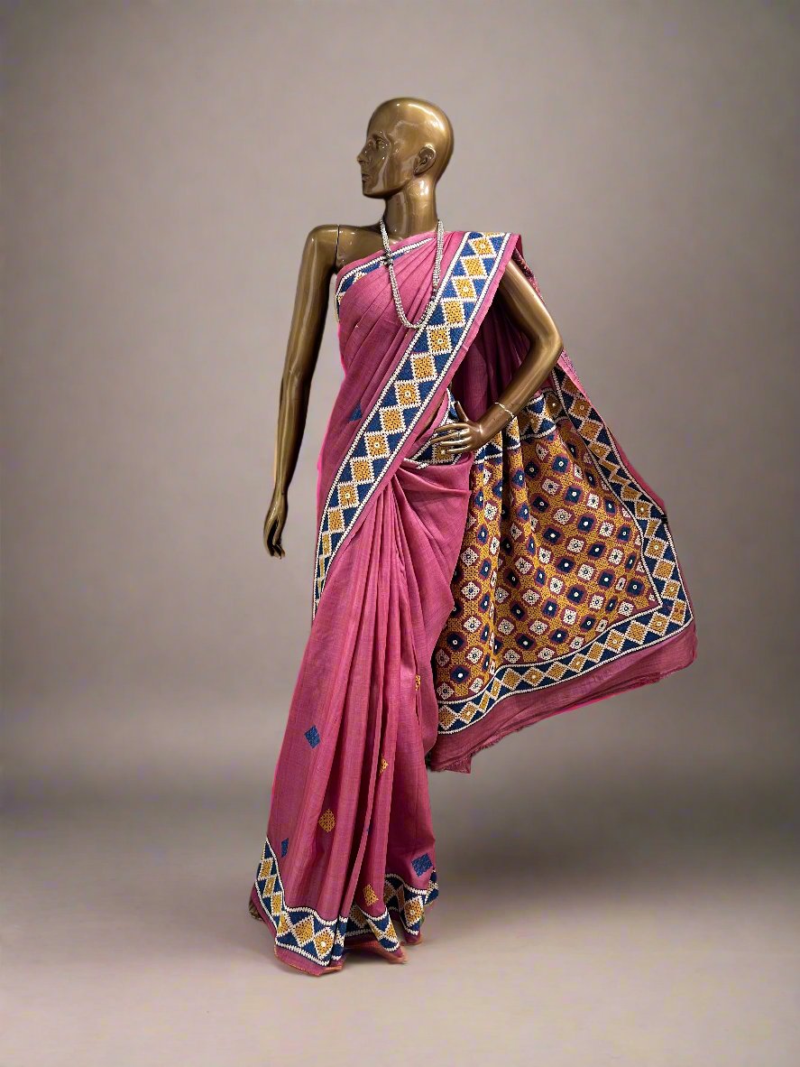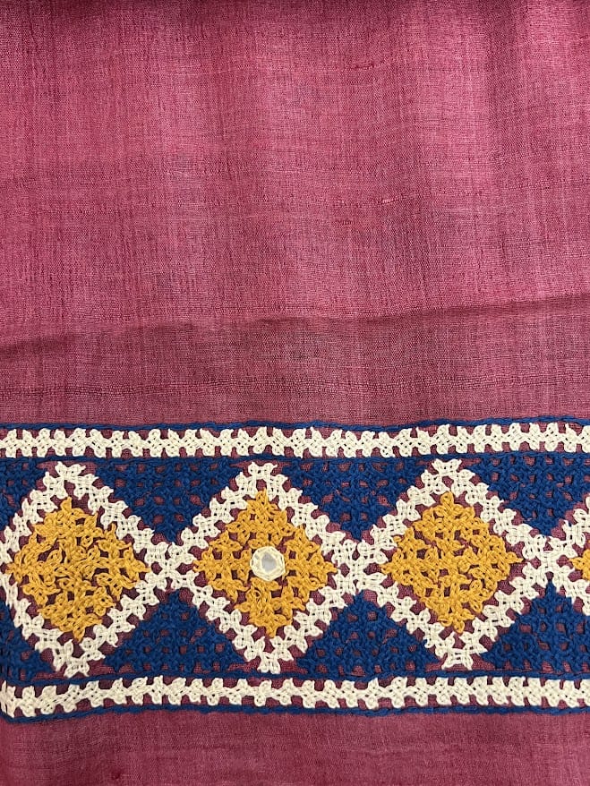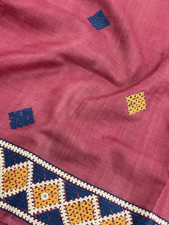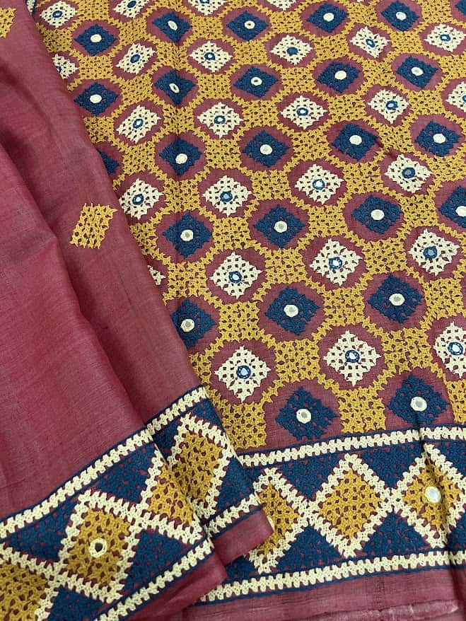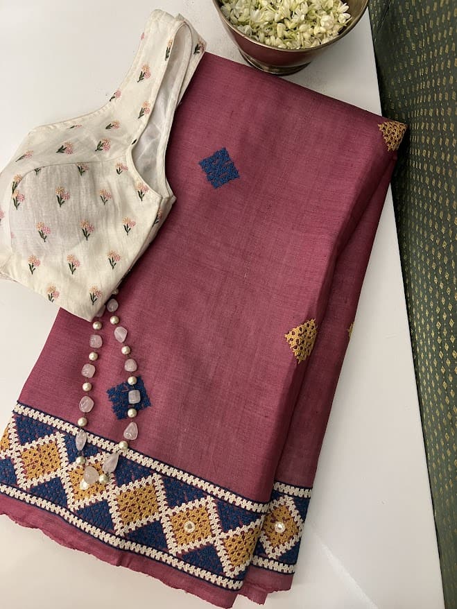 A pale maroon handloom tussar with blue ,mustard and beige hand embroidered kutch border and rich pallu. The body has scattered motifs all over. The blouse is plain maroon with work on the sleeves