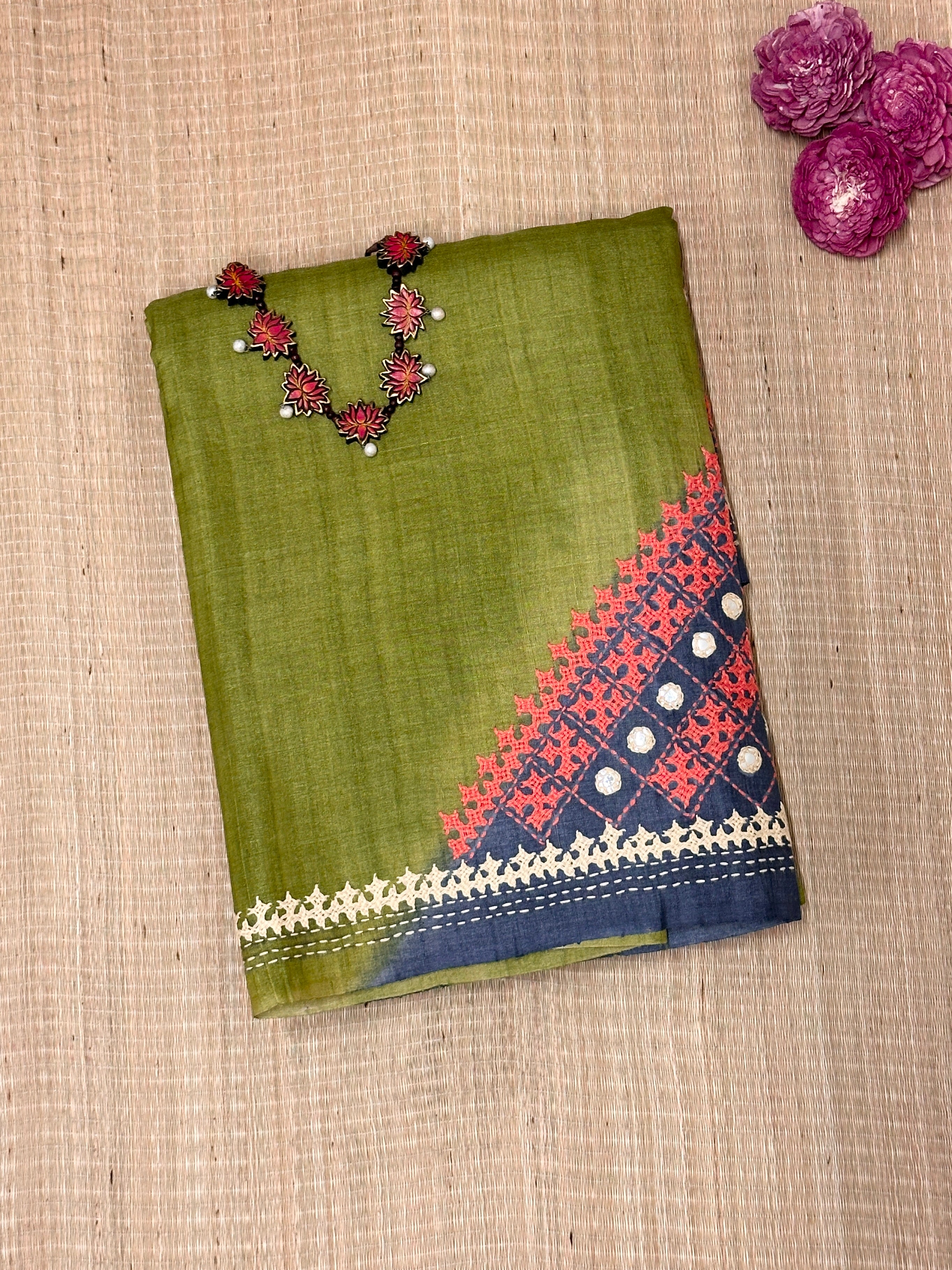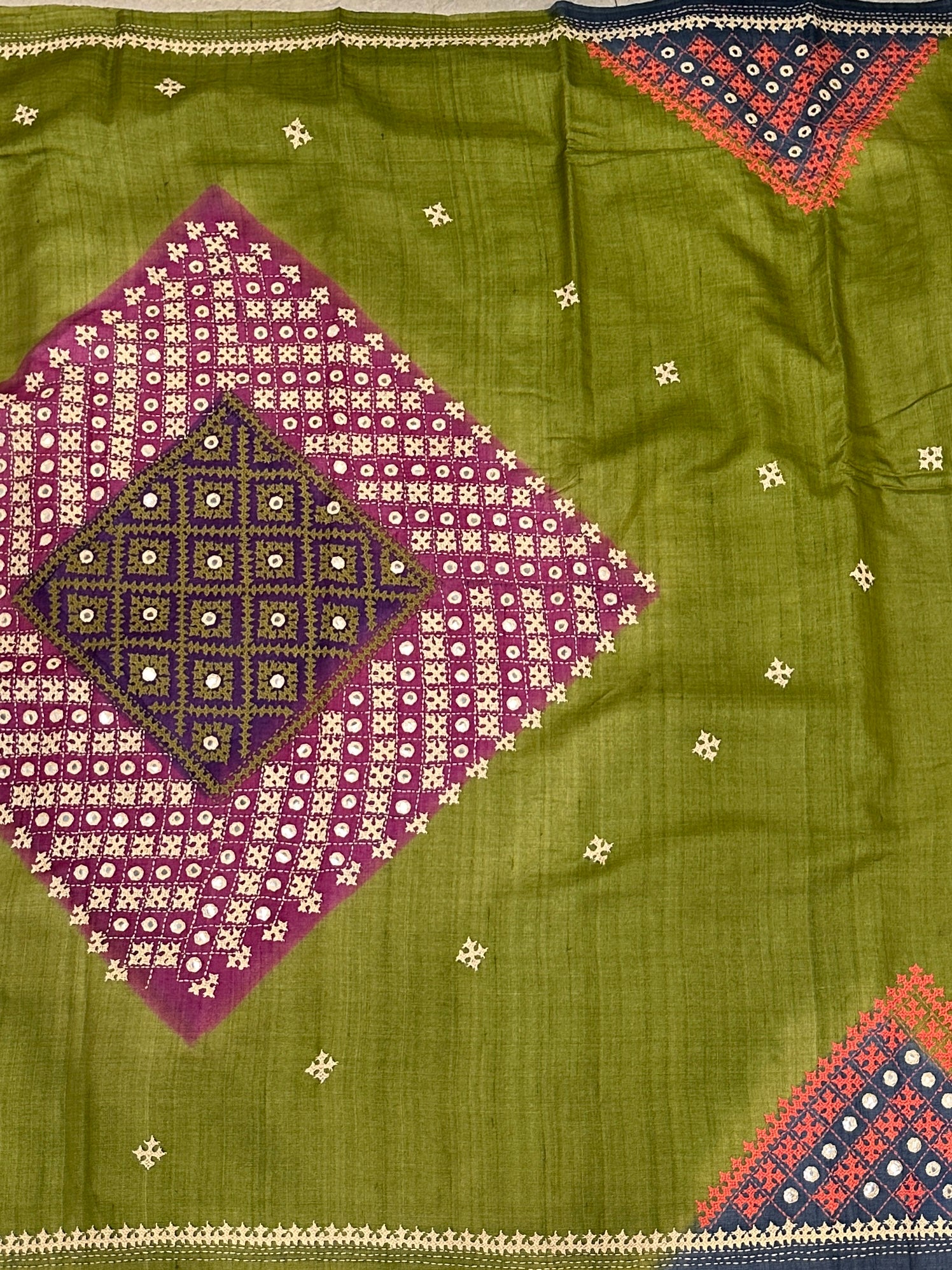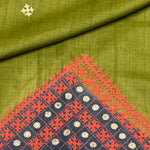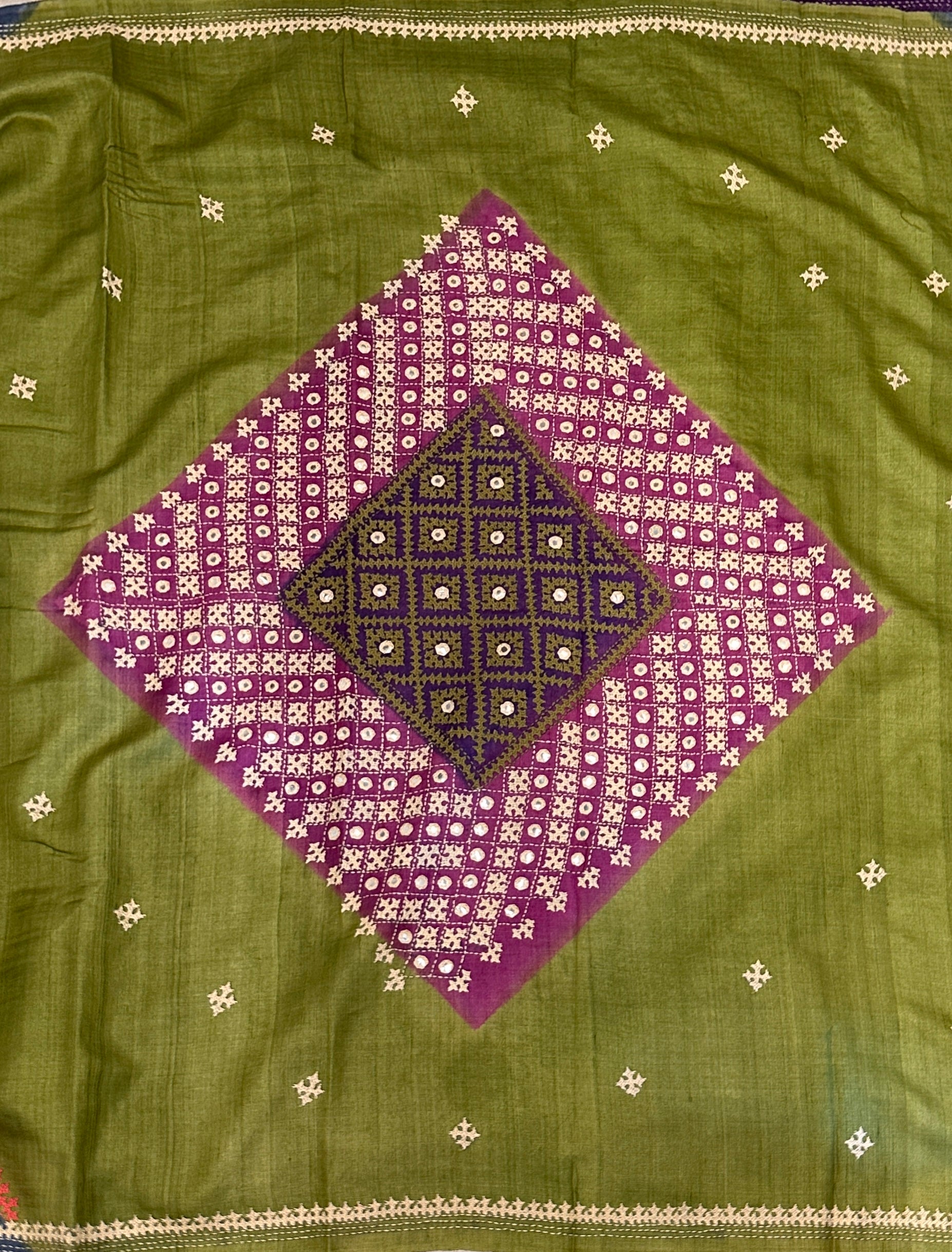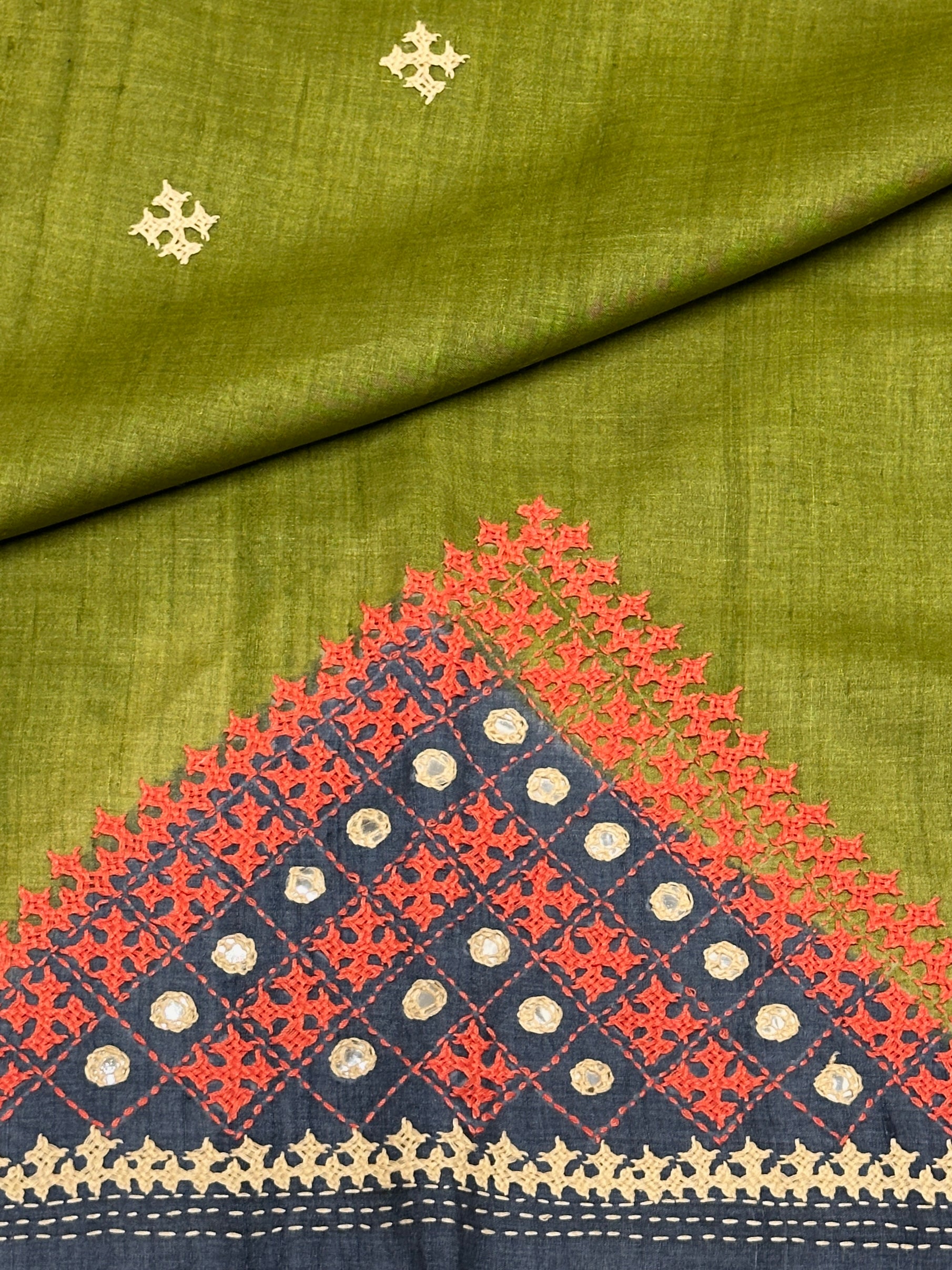 Soft green body adorned with triangle‑shaped Kutch embroidery motifs in varying shades for visual depth.