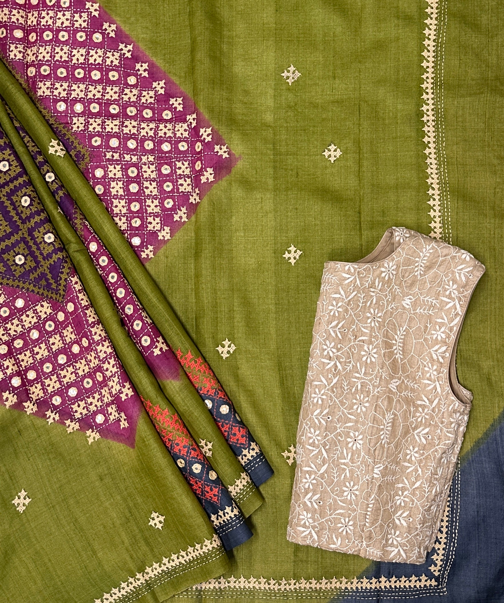 Mirror‑work accents embedded within the Kutch embroidery for subtle sparkle and artisan detailing.