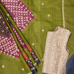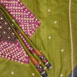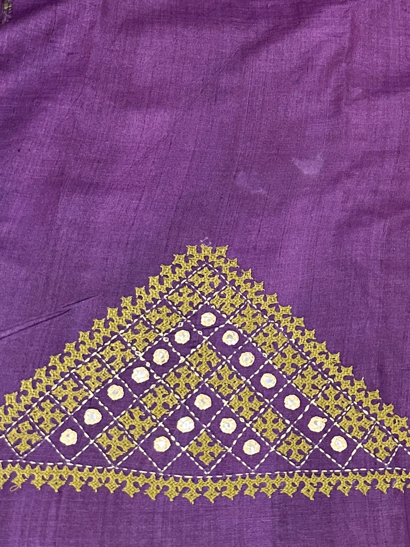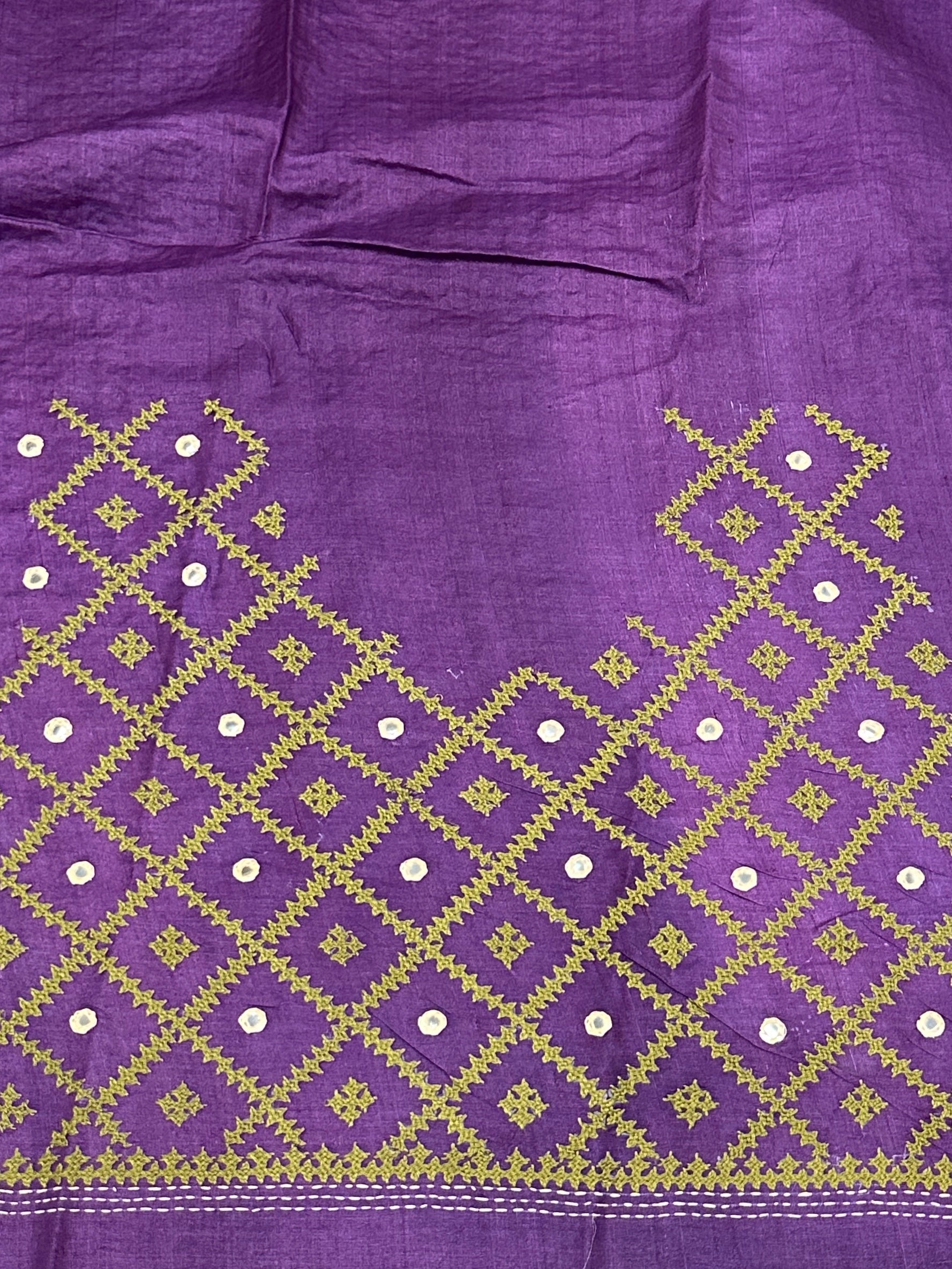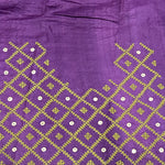Dual‑tone embroidery on the pallu in rich purple, creating a striking green‑to‑purple contrast.