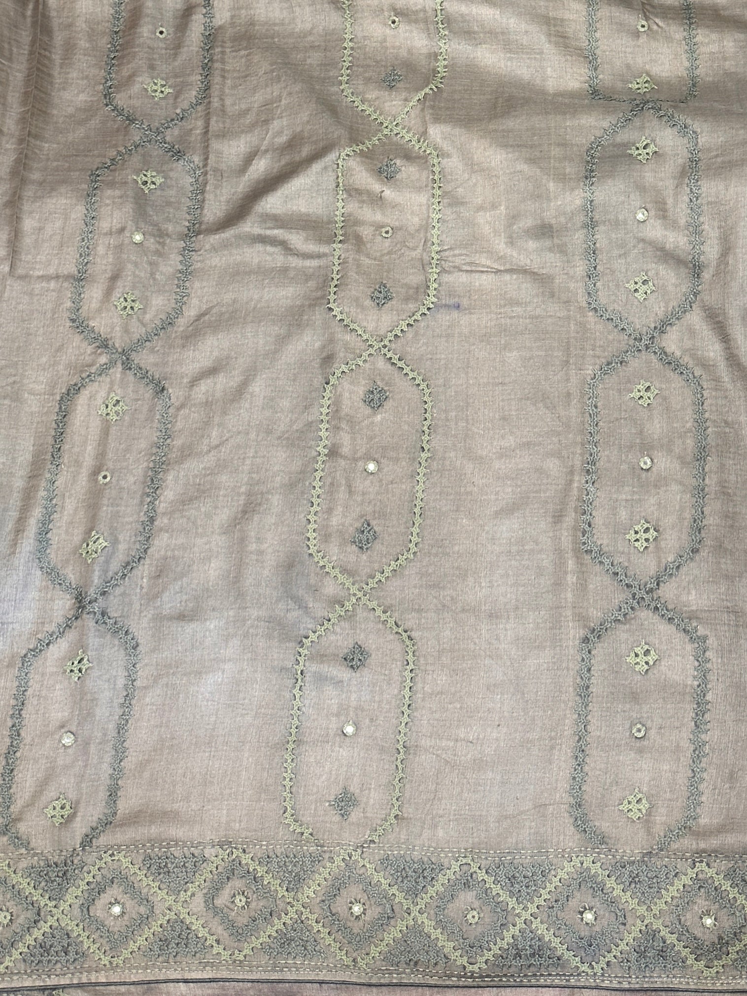 - Hand-set mirrors embedded throughout the embroidery for subtle shimmer and decorative effect.