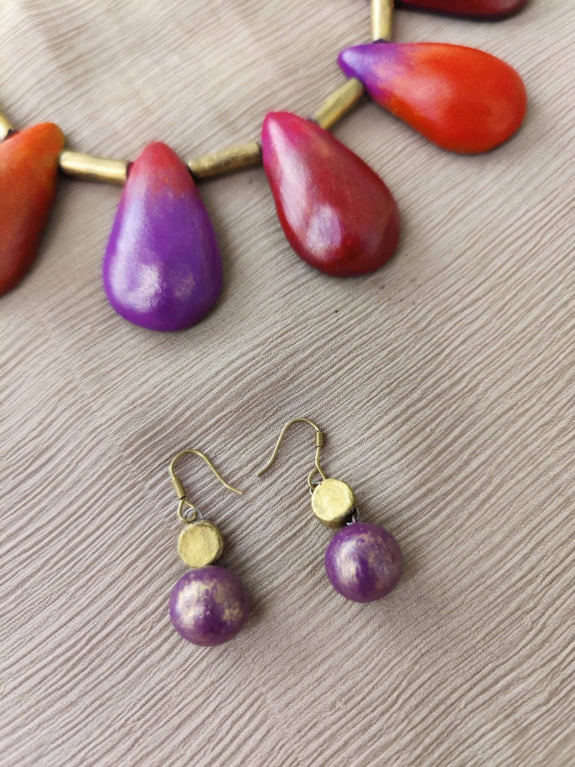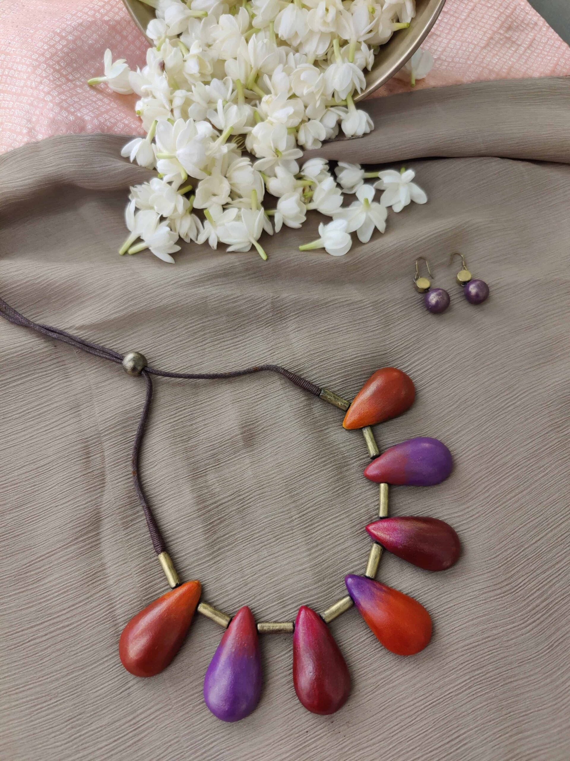 Red,orange,violet and magenta handmade terracotta necklace with leaf shaped design and earrings