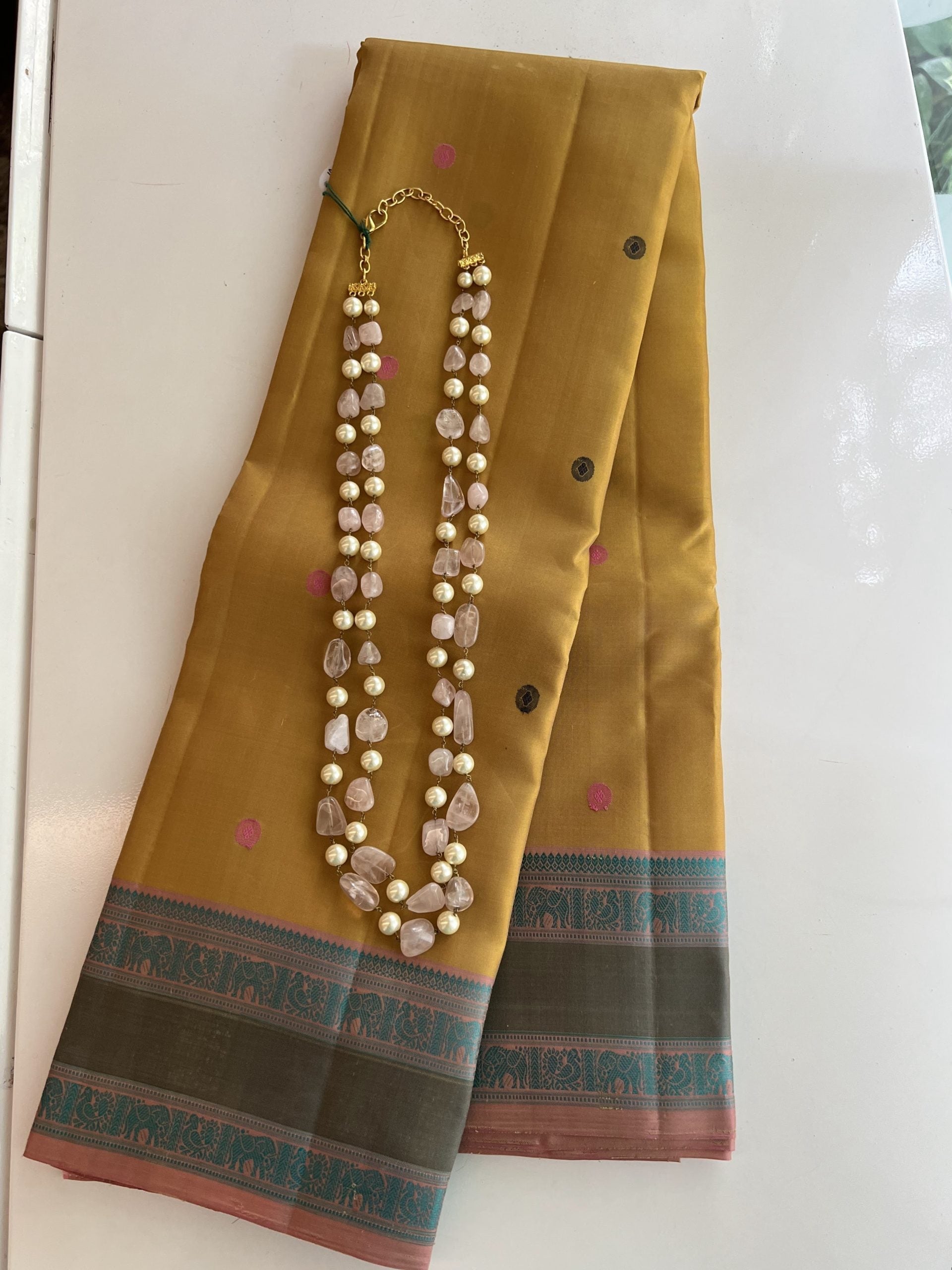 Semi precious sand coloured? beads, strung in 2 layers . It has an adjustable rope at the back.The chain is around 10" in length