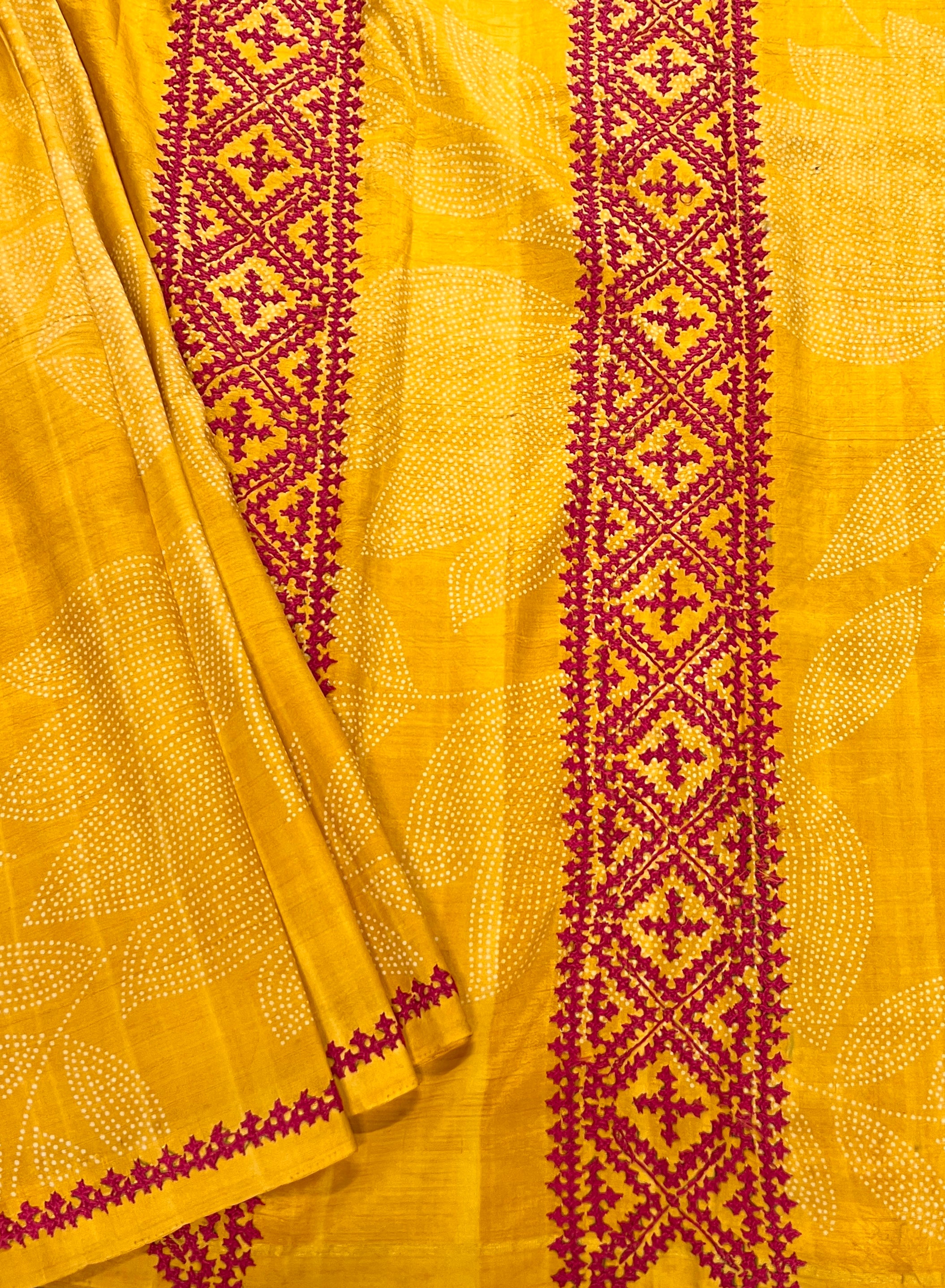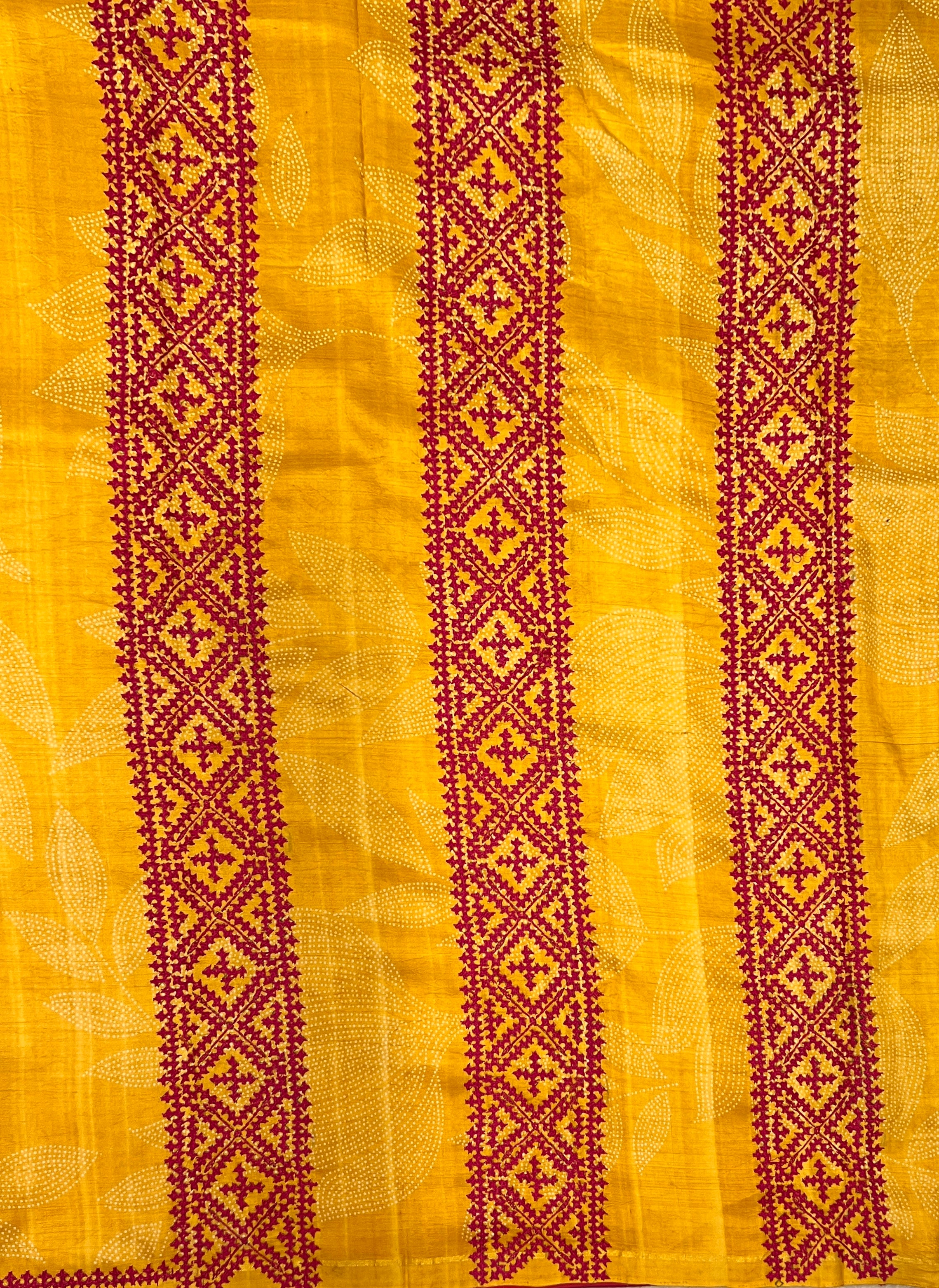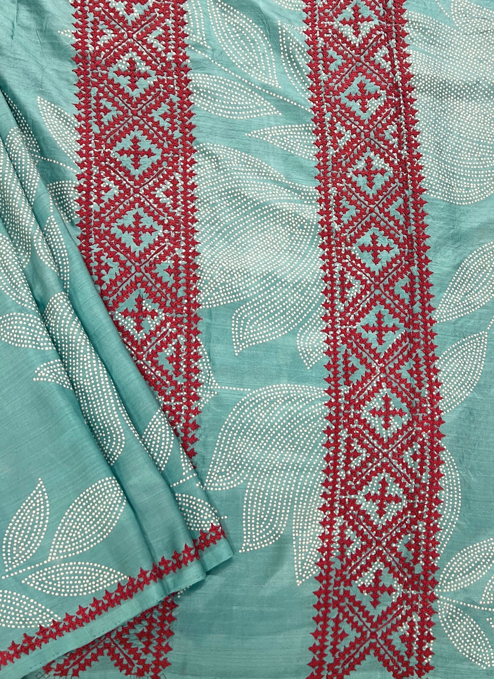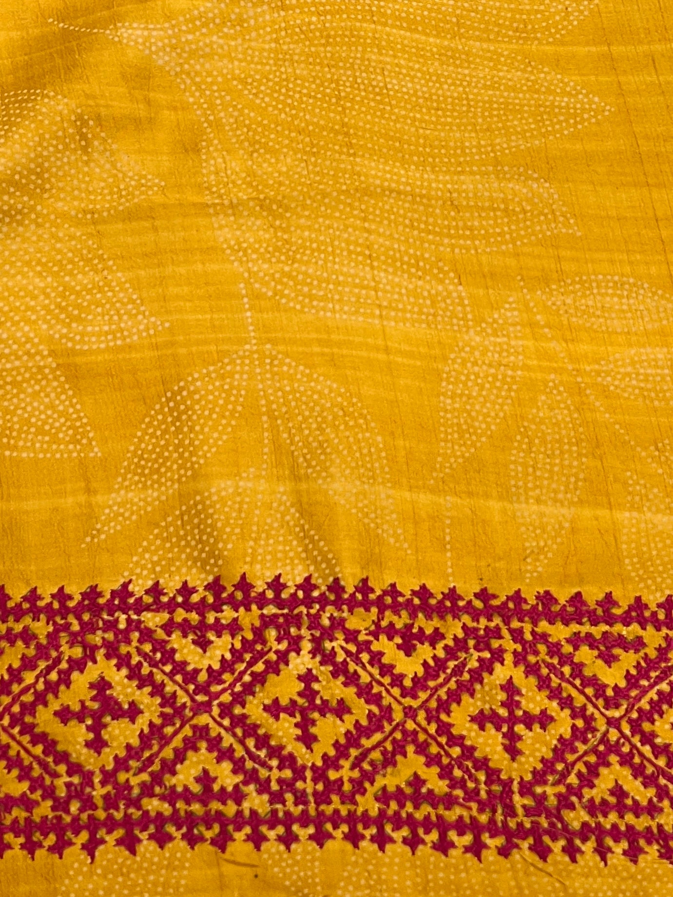 • Intricate Kutch embroidery enhances the pallu and borders, adding texture and traditional charm.