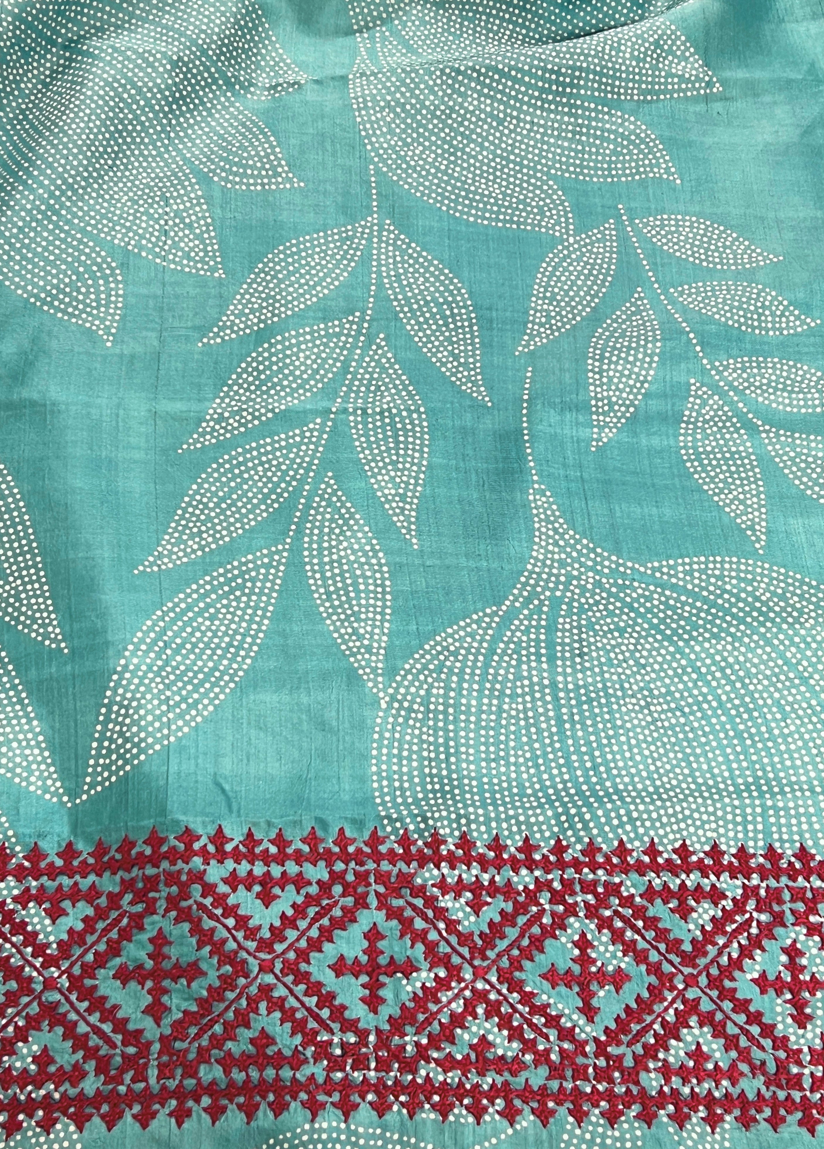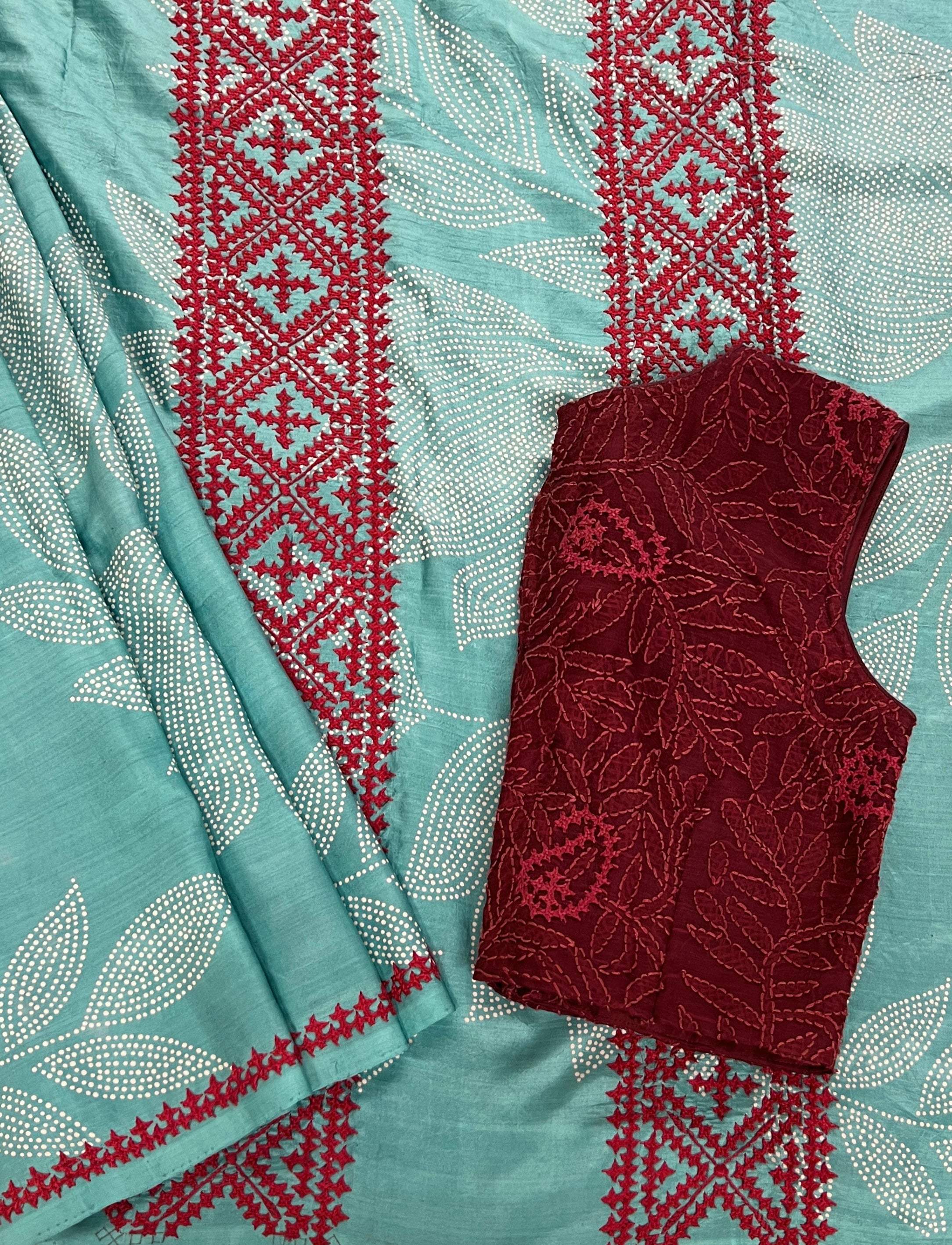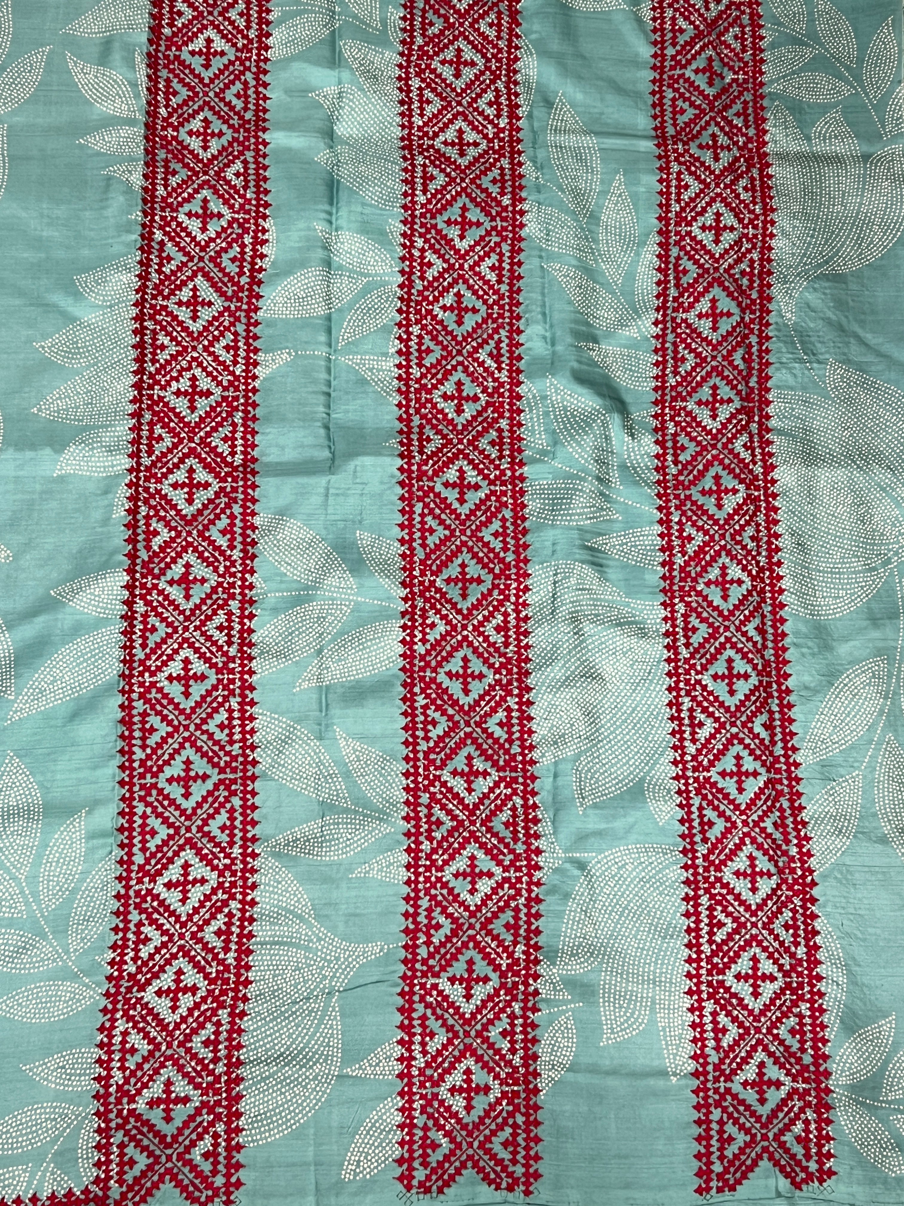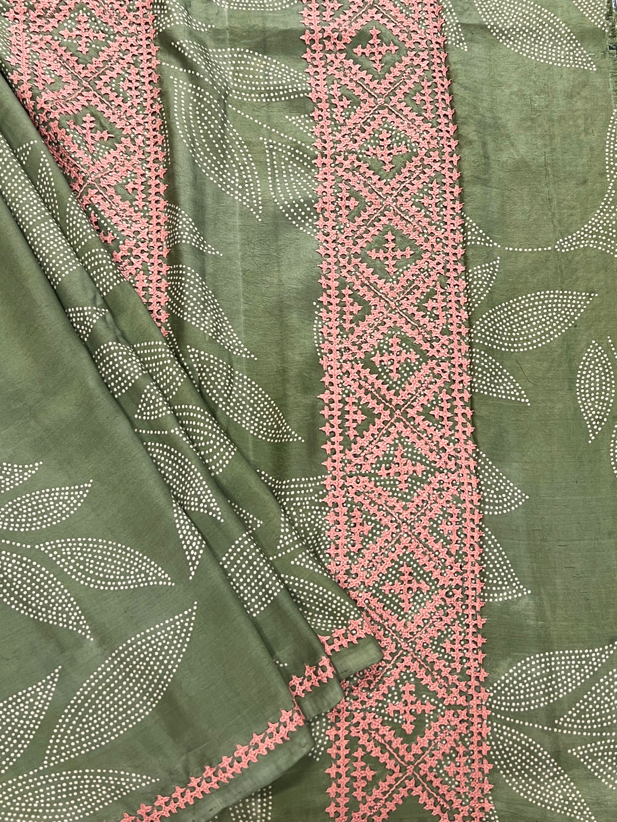 • Intricate Kutch embroidery enhances the pallu and borders, adding texture and traditional charm.