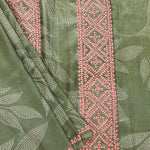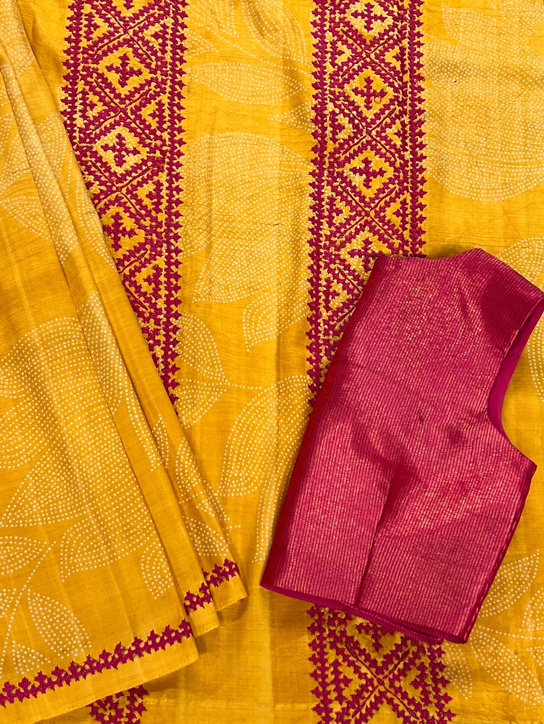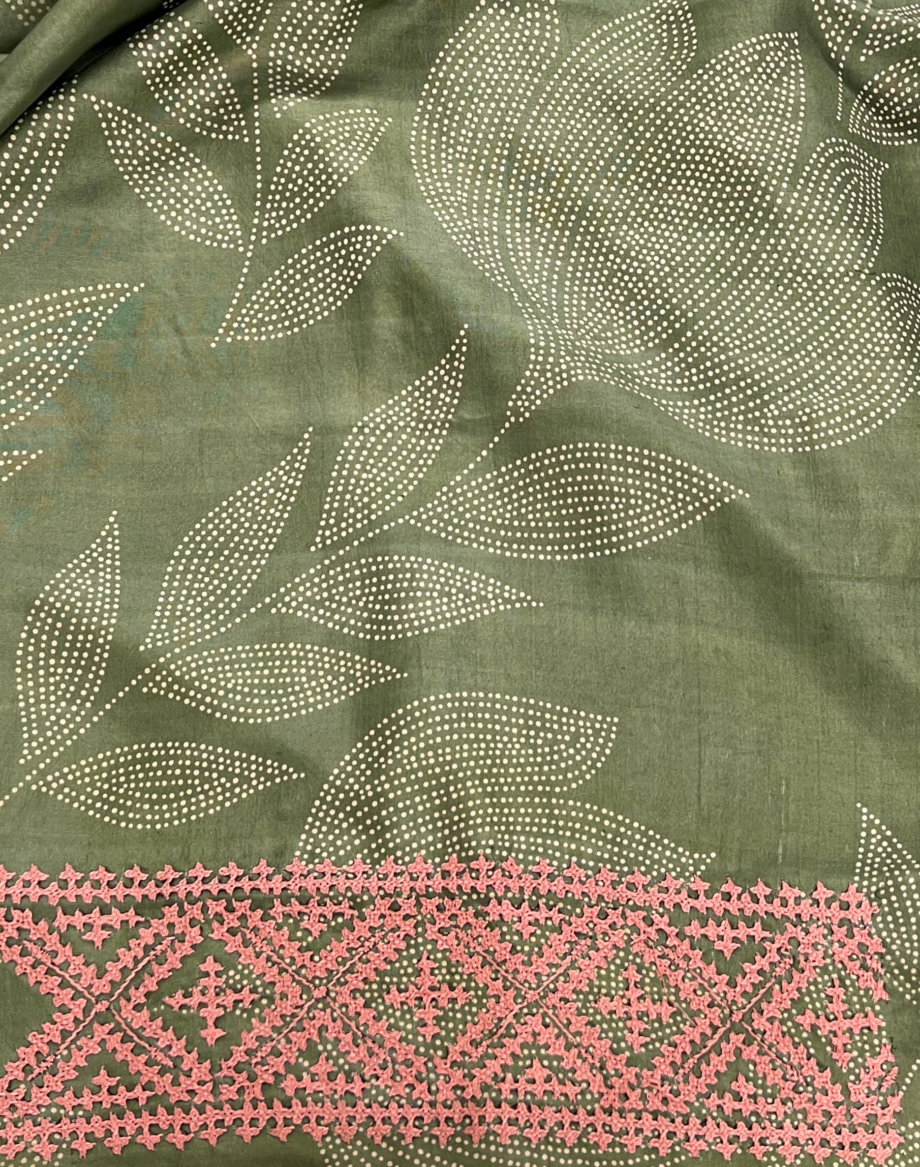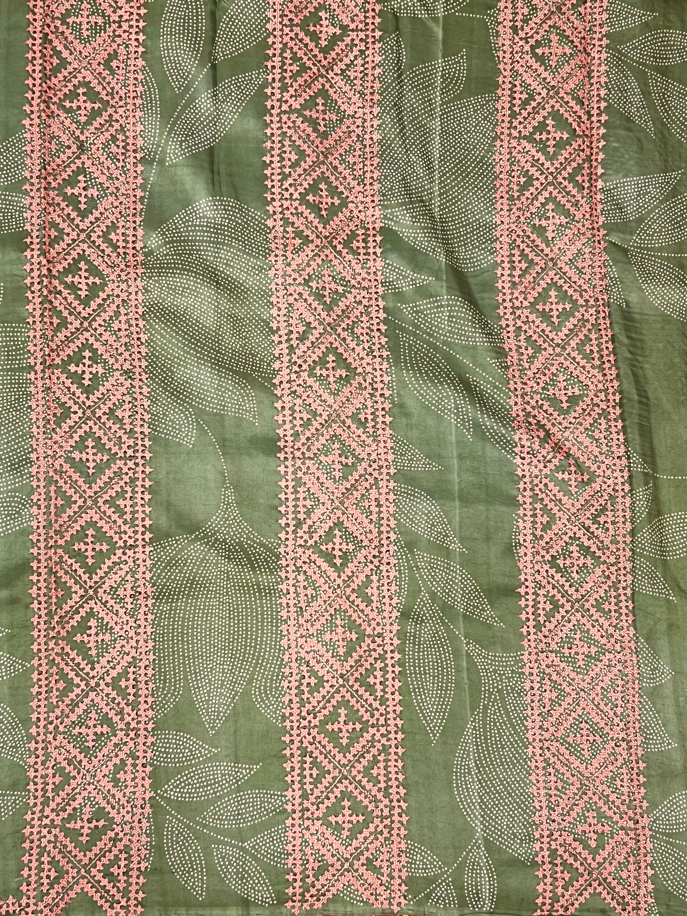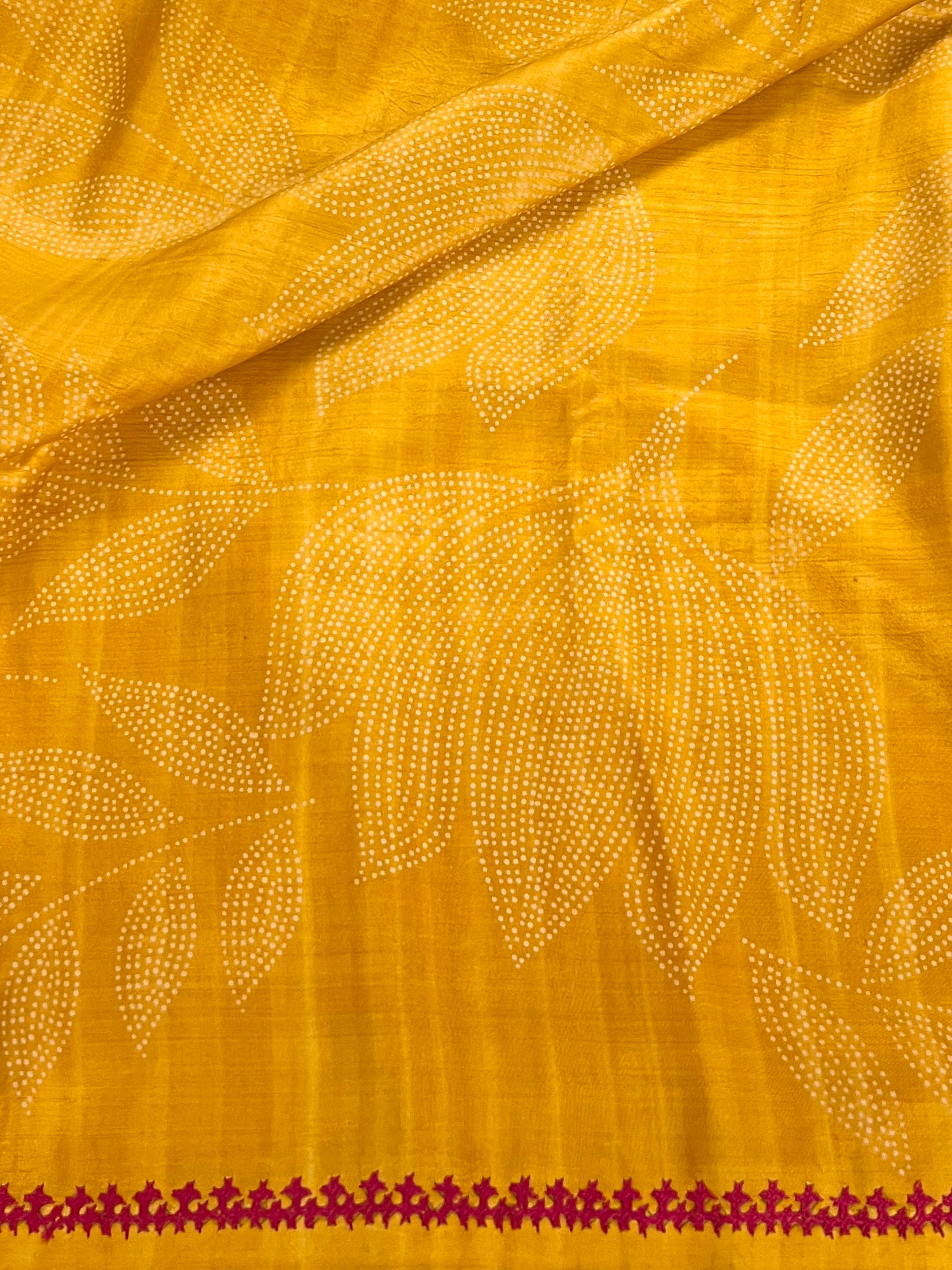 • Intricate Kutch embroidery enhances the pallu and borders, adding texture and traditional charm.