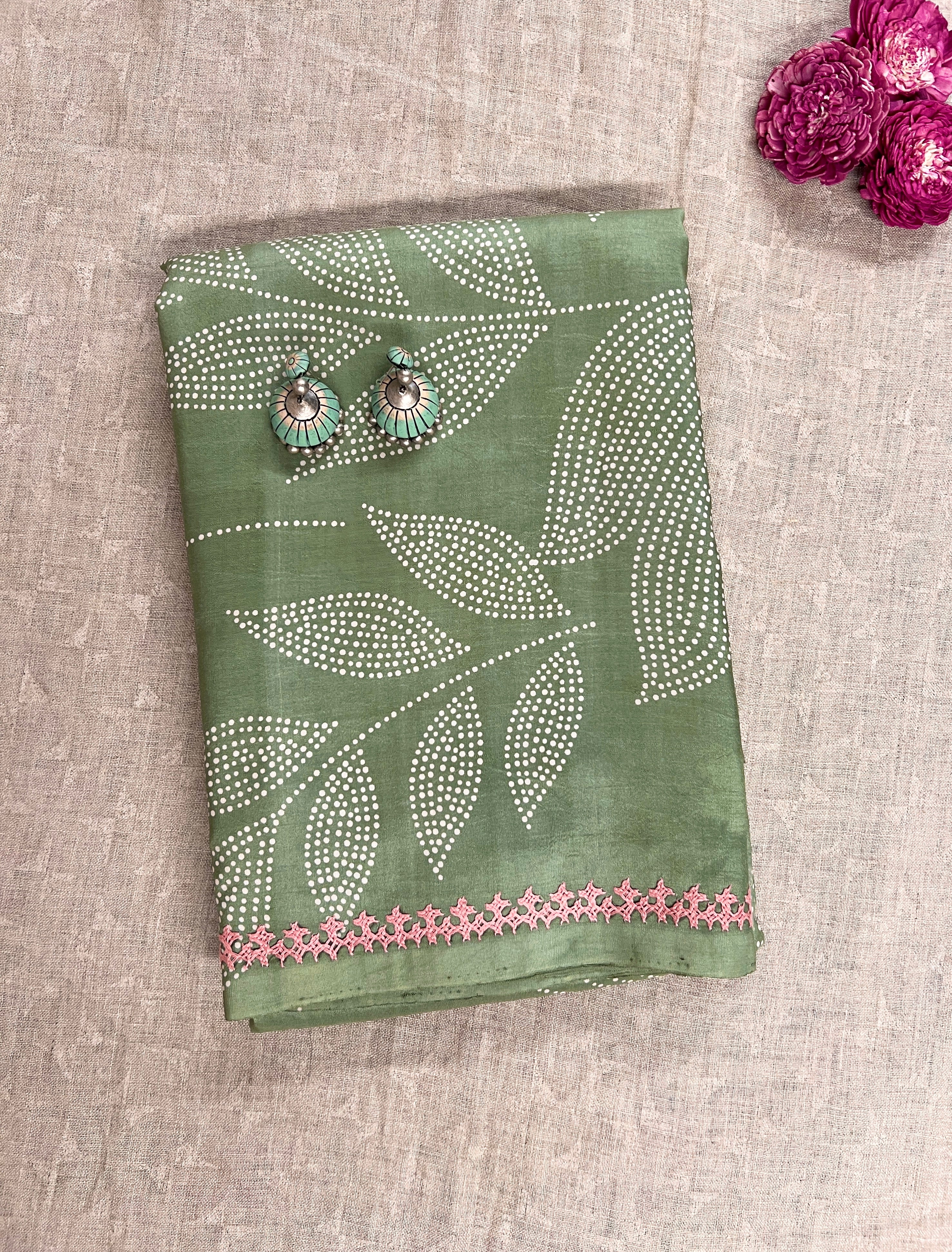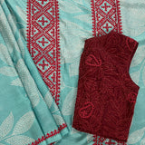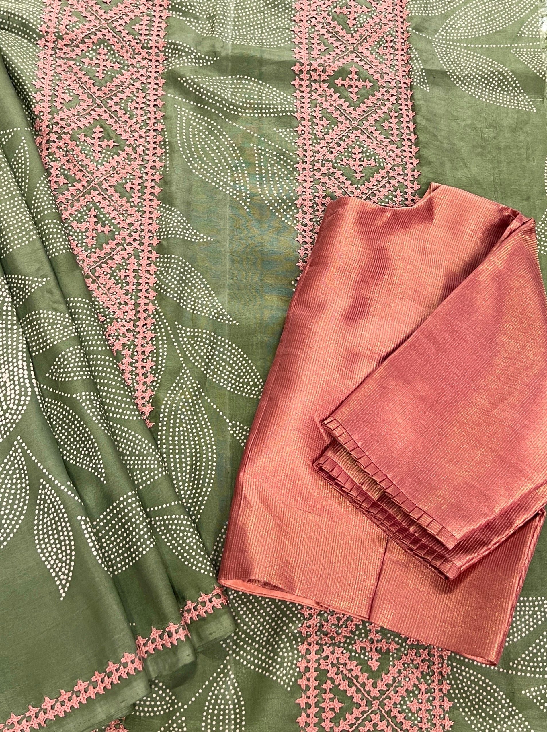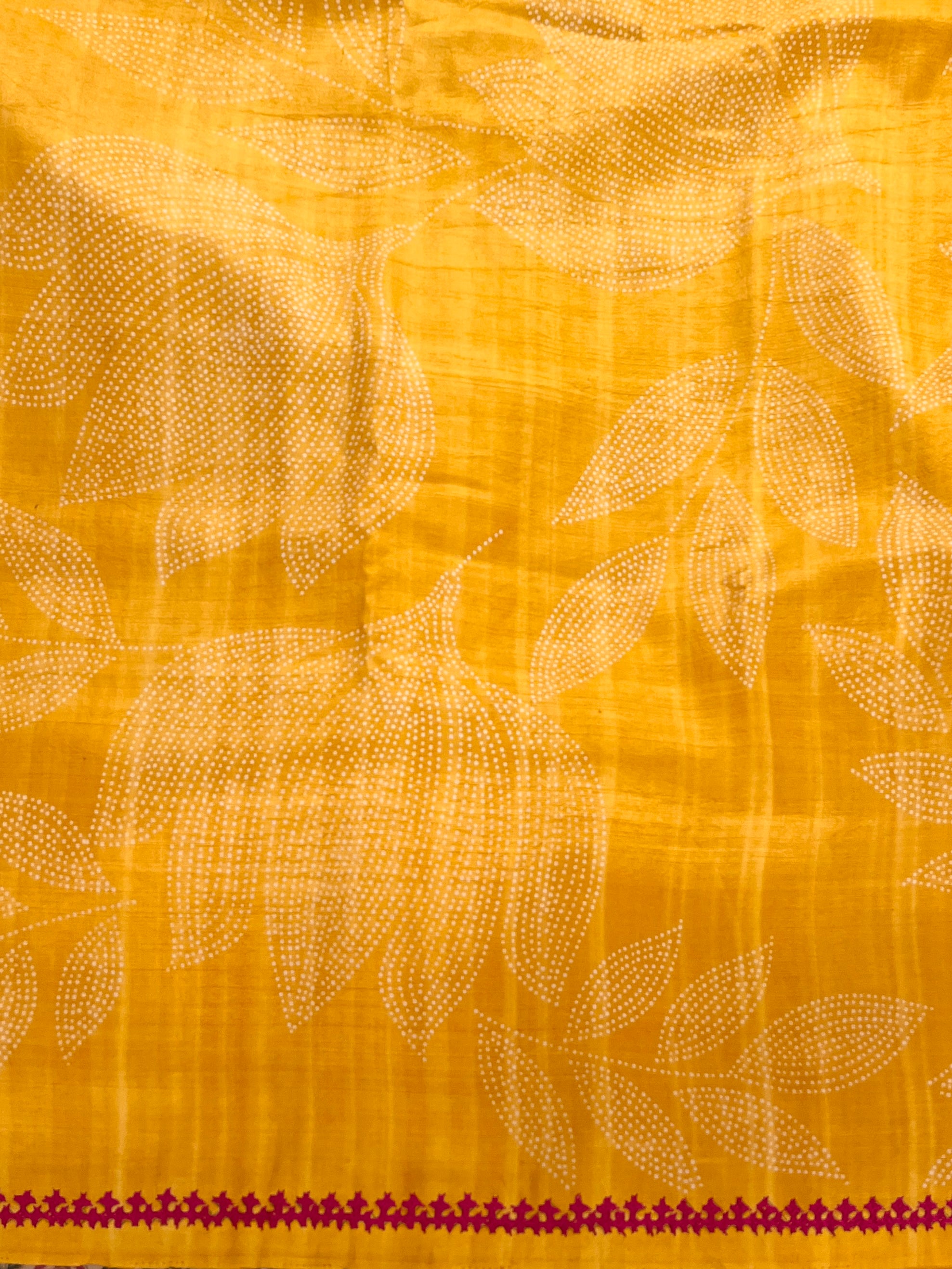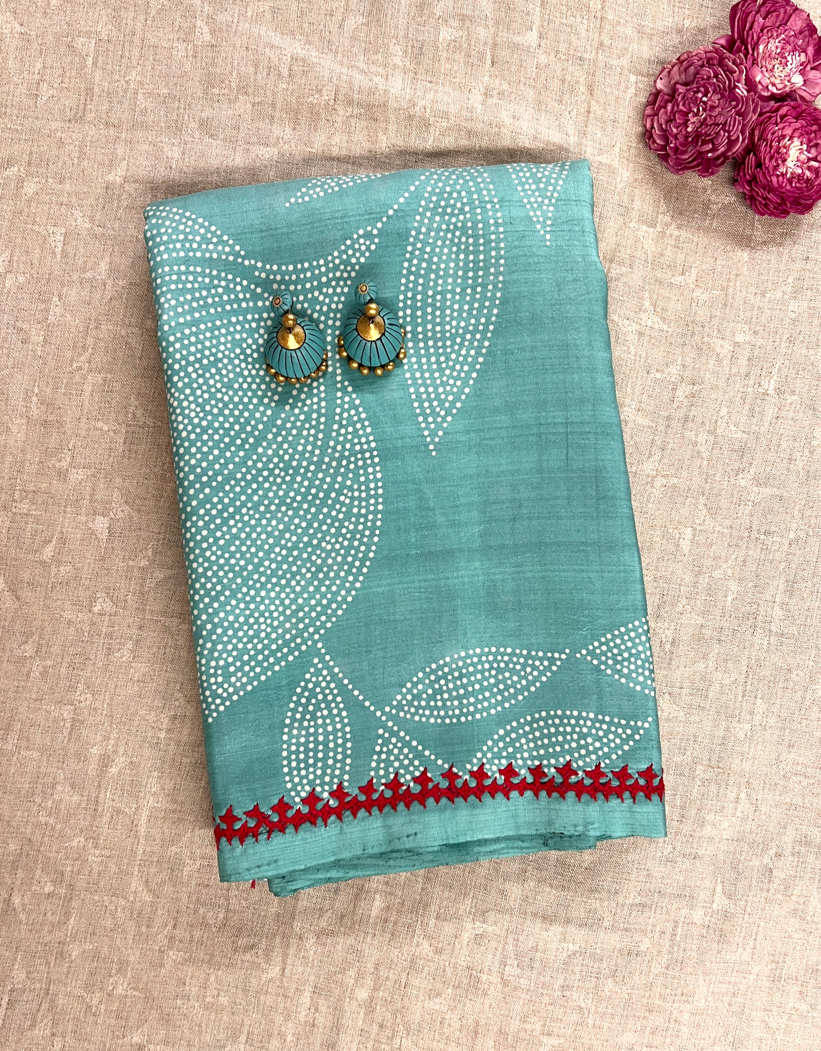 • Intricate Kutch embroidery enhances the pallu and borders, adding texture and traditional charm.