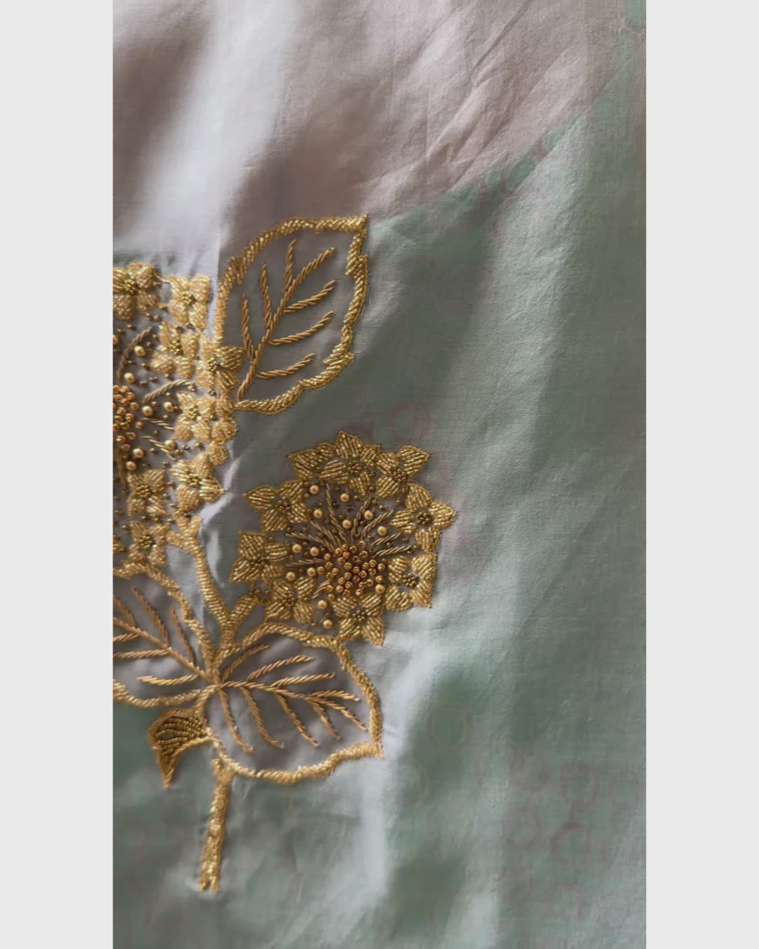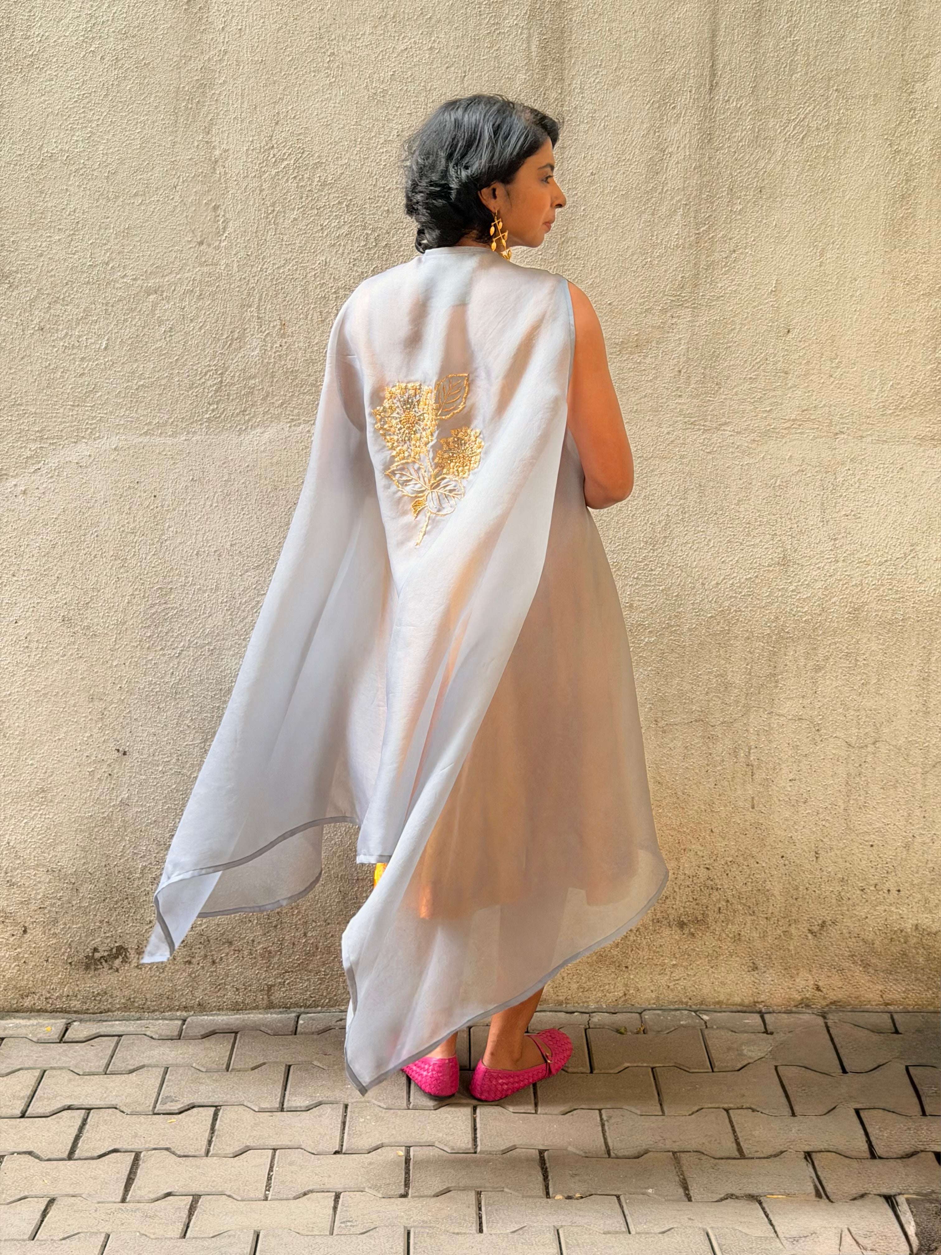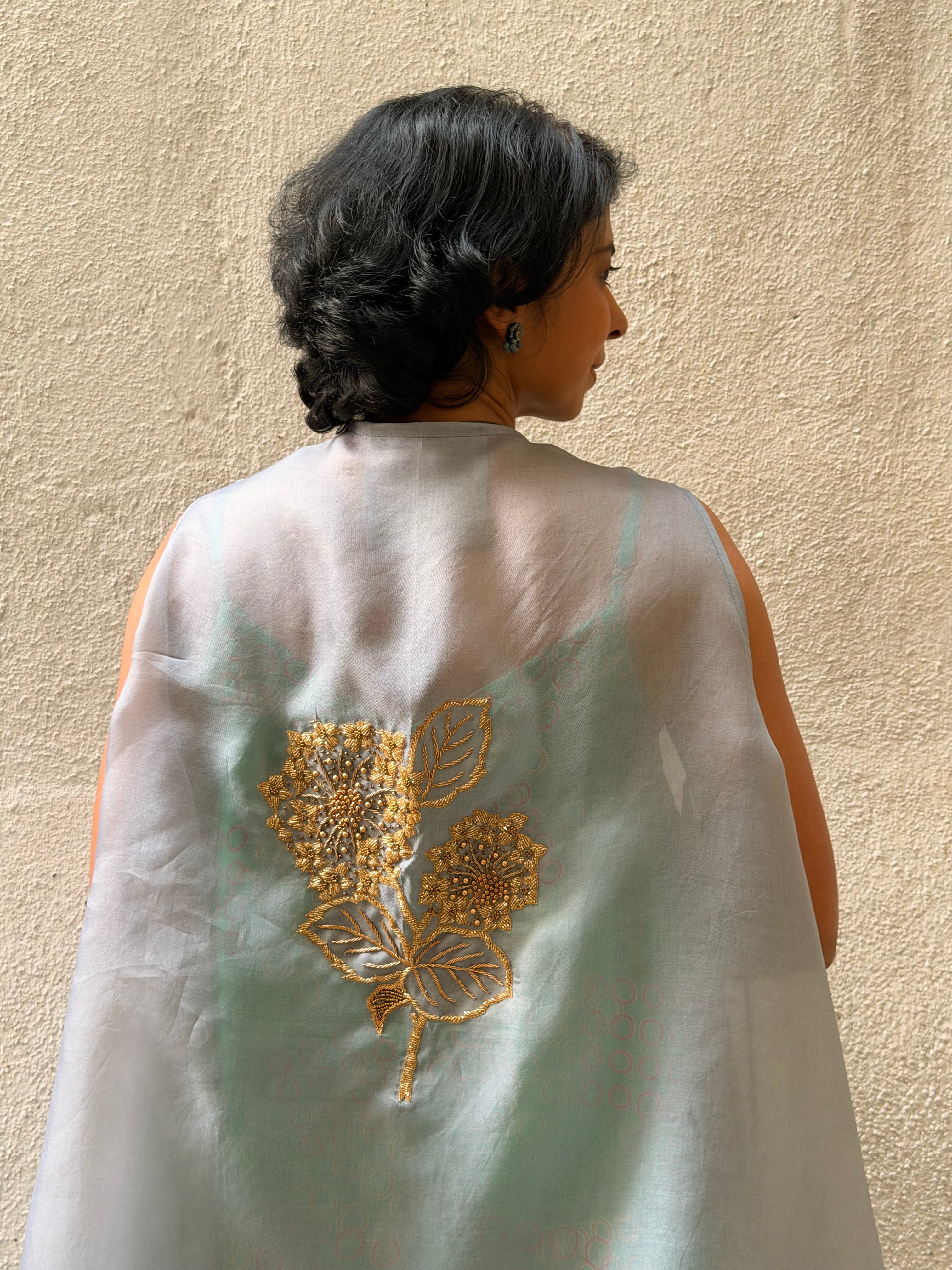 Premium organza cape with luxurious gold zardozi embroidery.