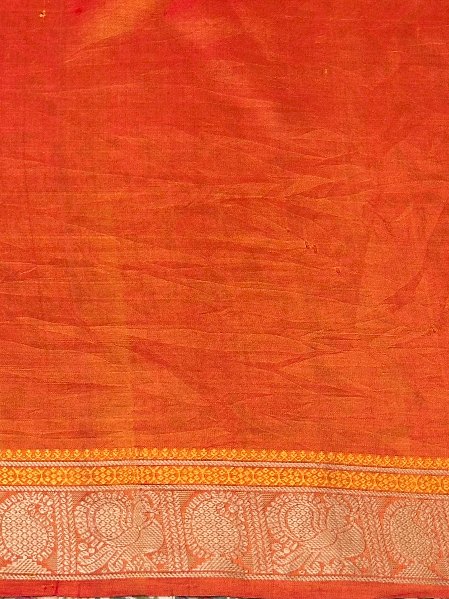• Contrasting coloured intricately woven zari border with peacock motifs.