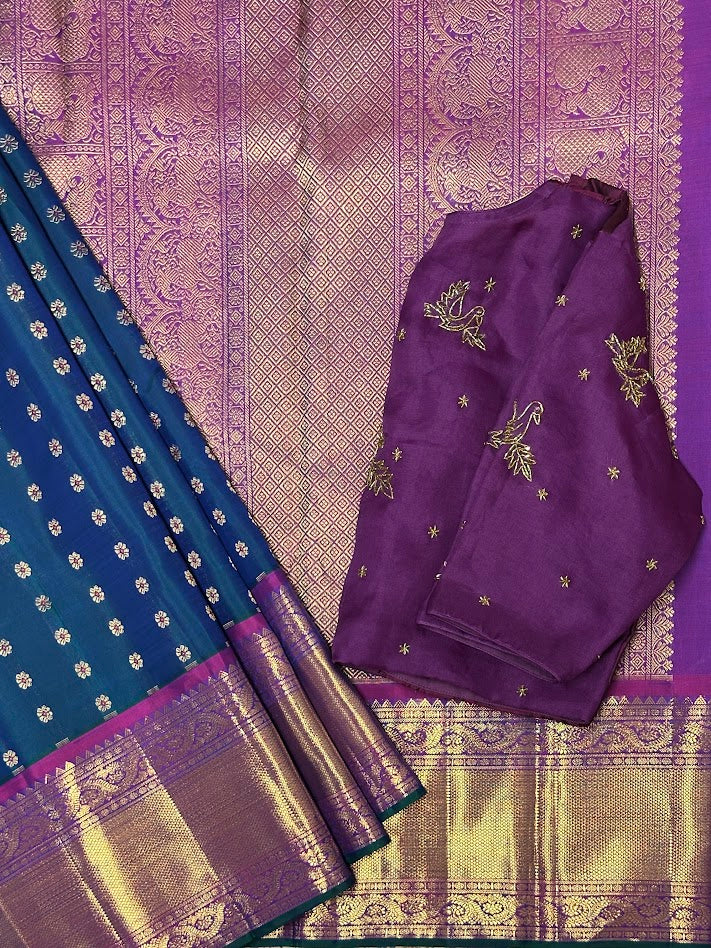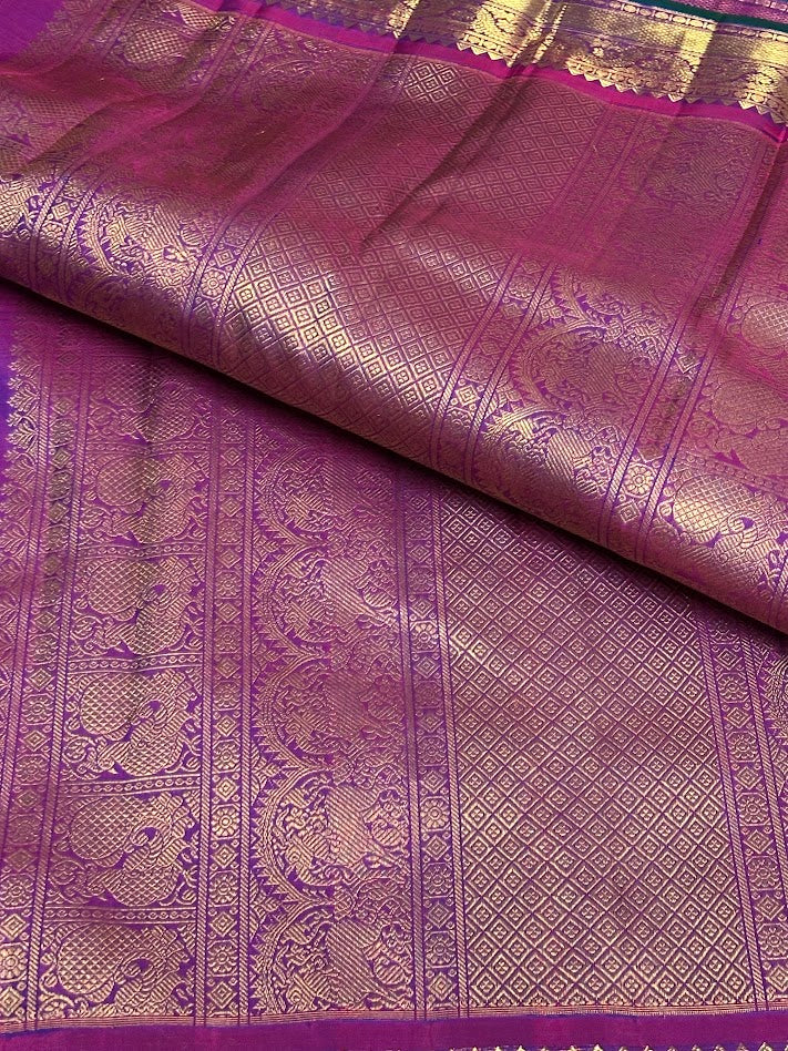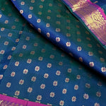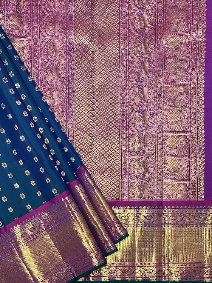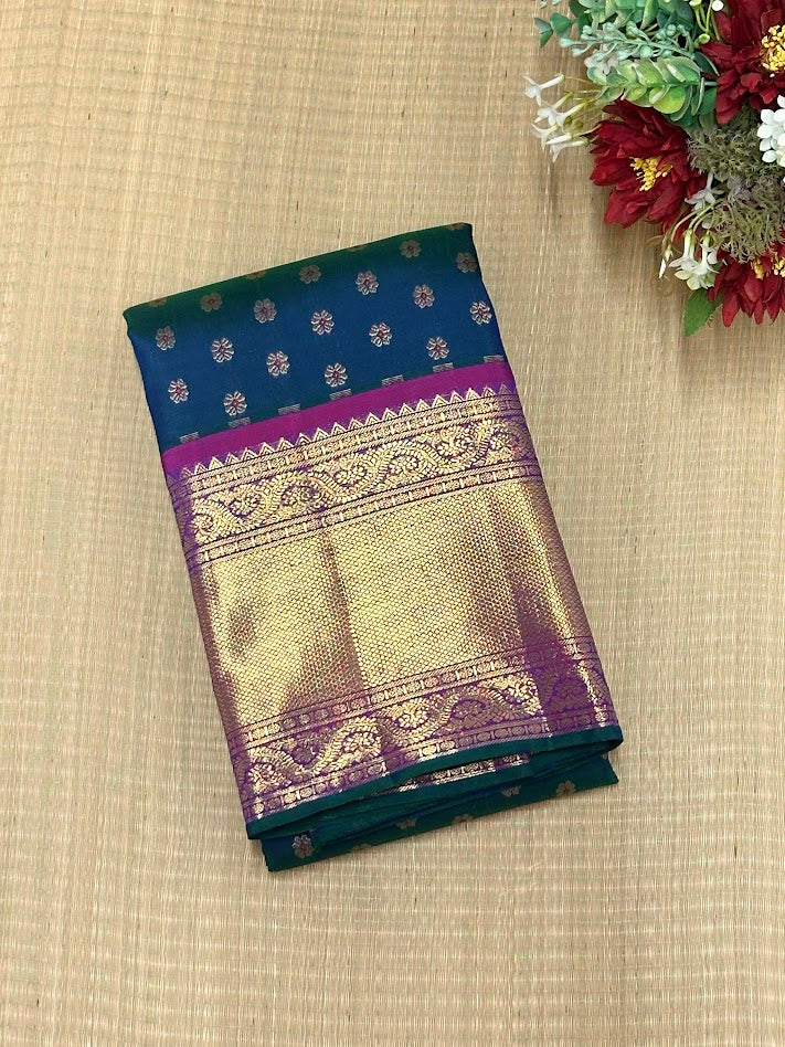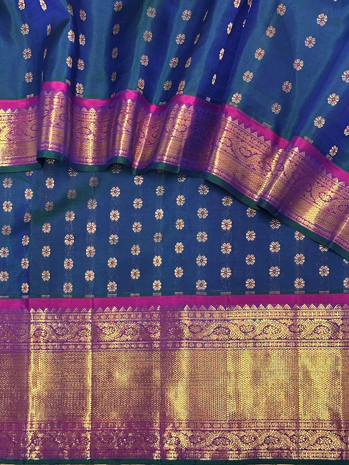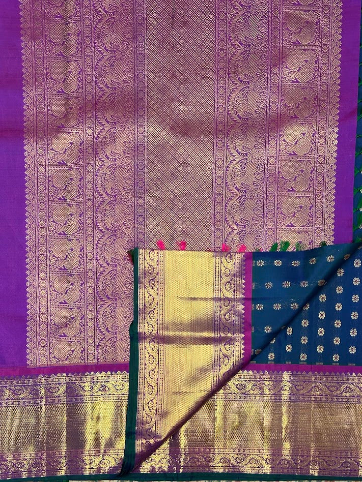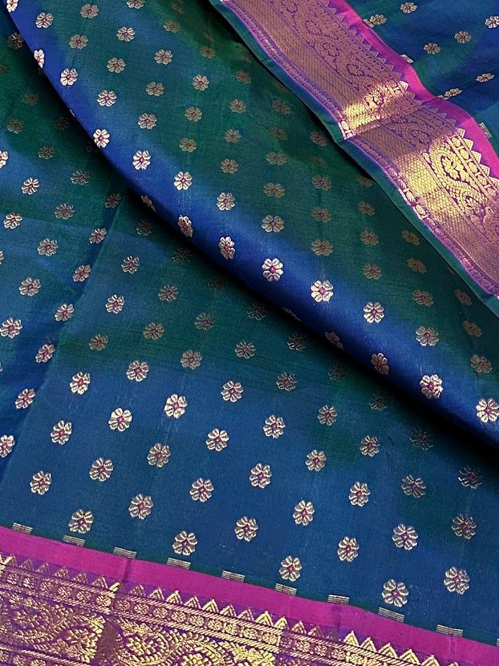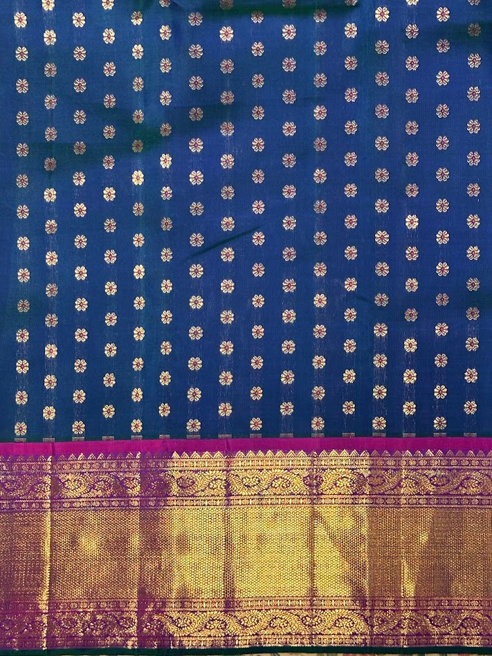 - Handwoven in the fines of silks in Kanchipuram.