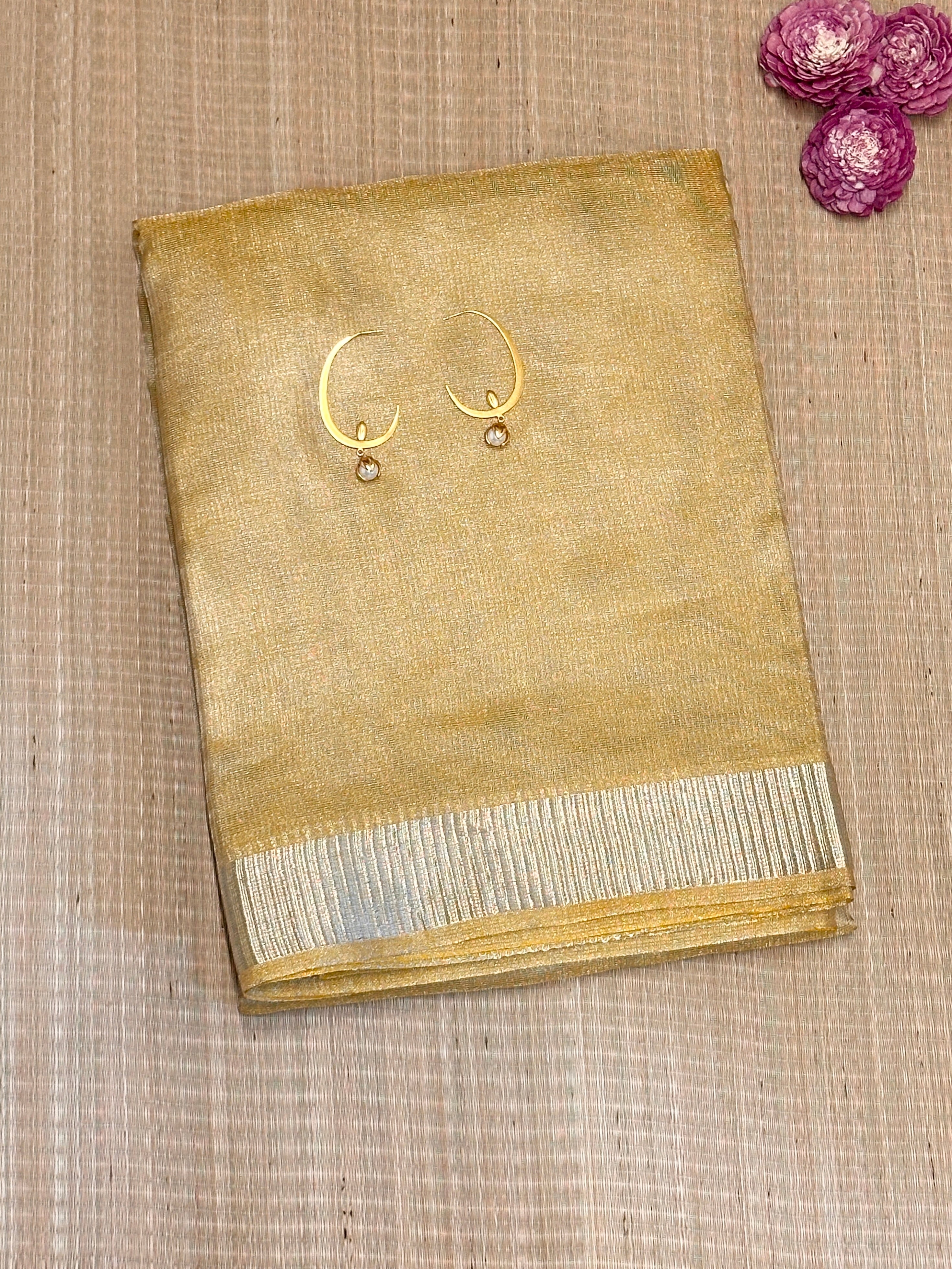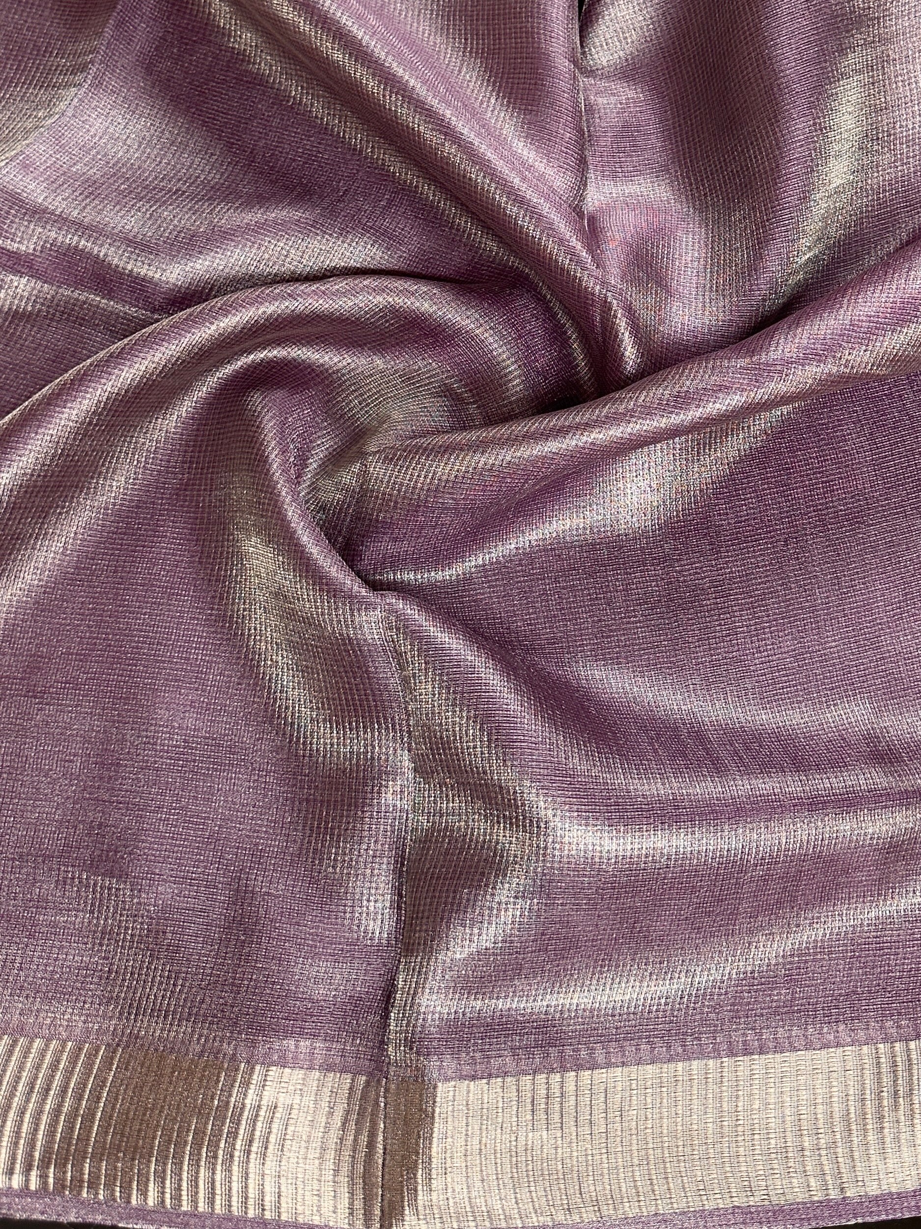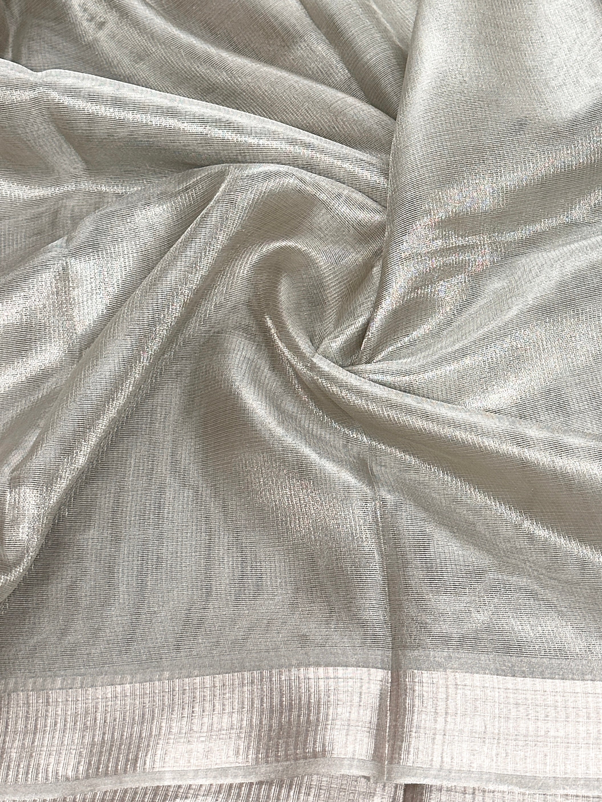 Tissue Tussar saree blended with Zari threads for a soft, lustrous finish.