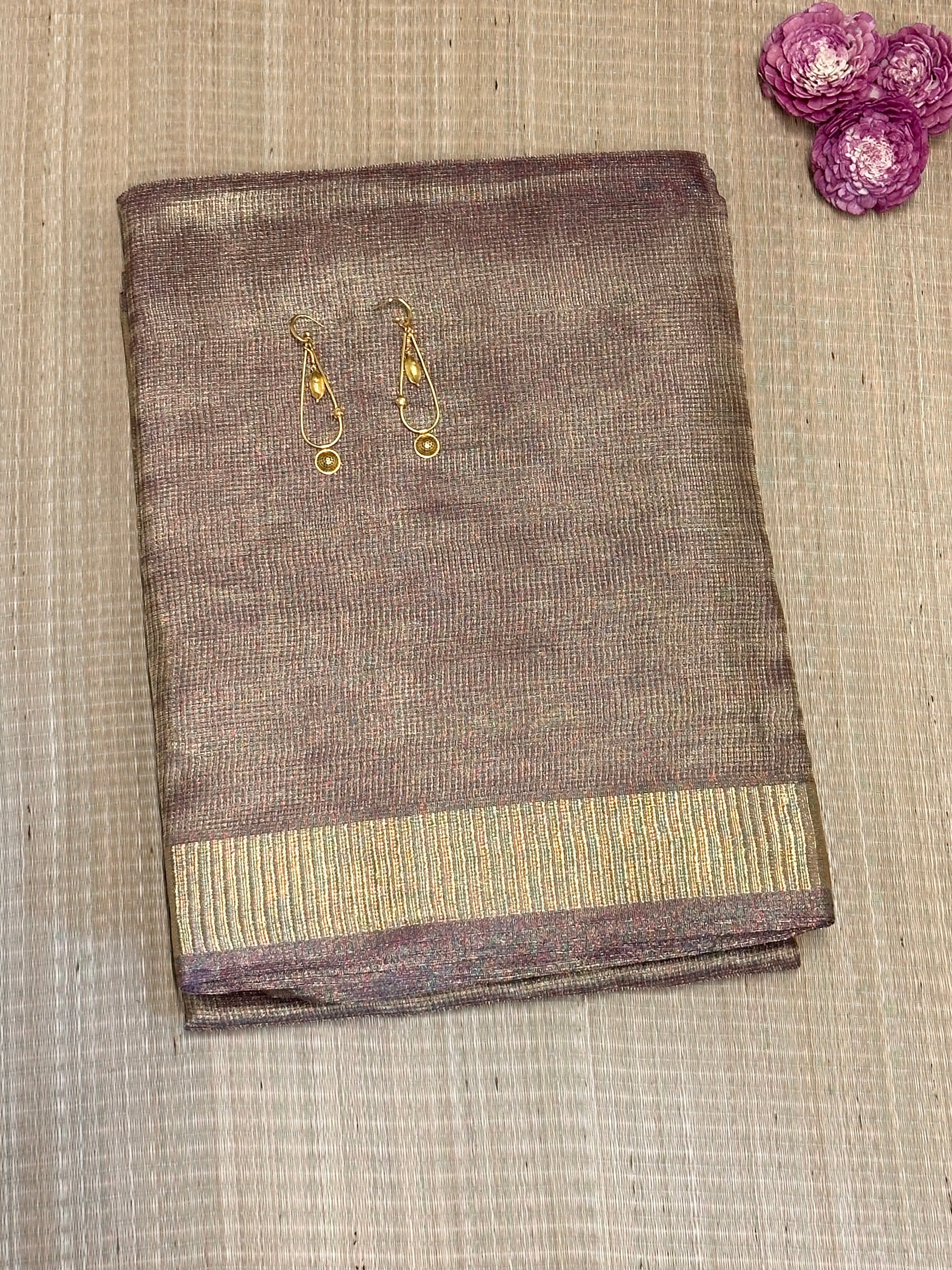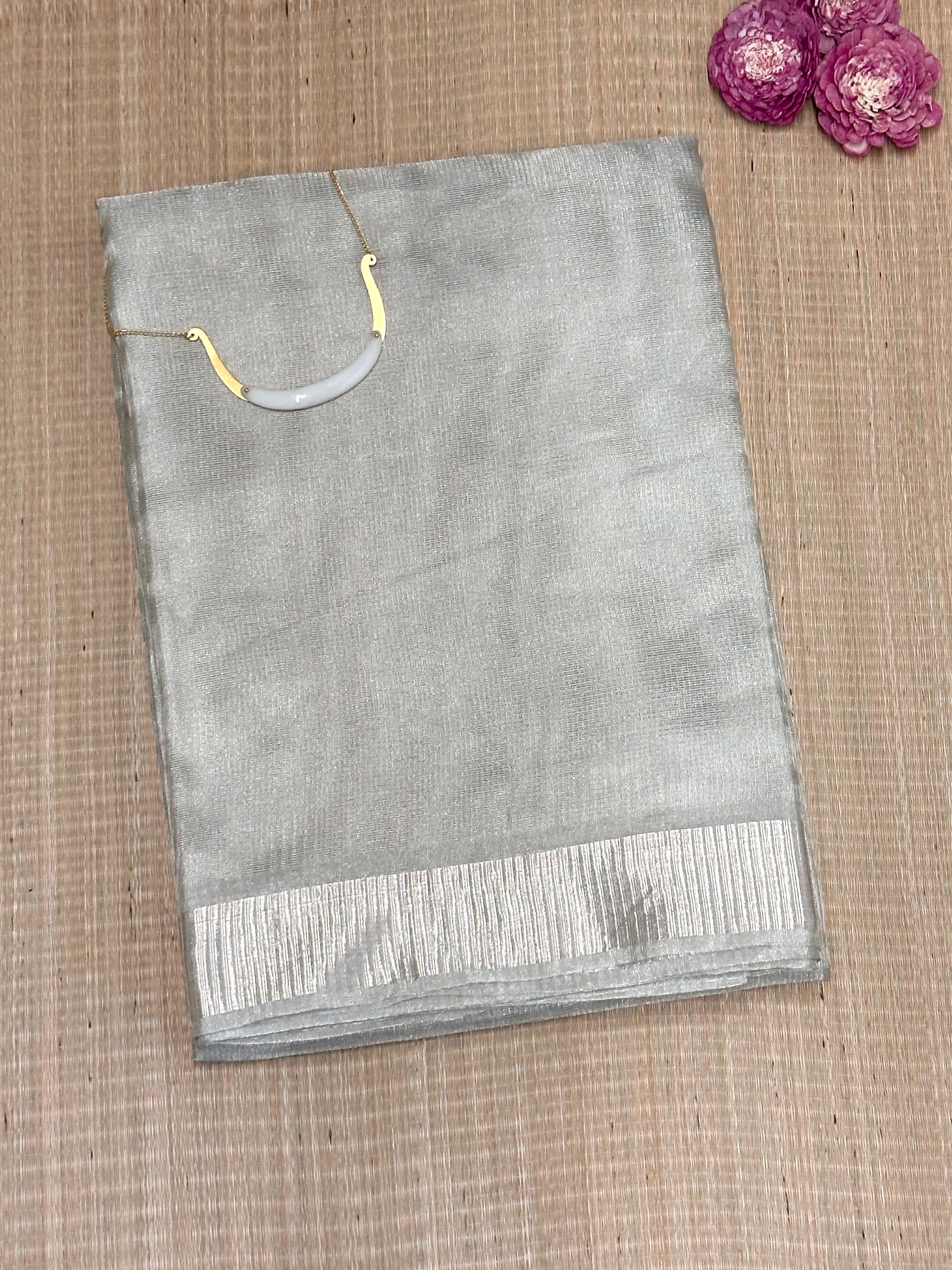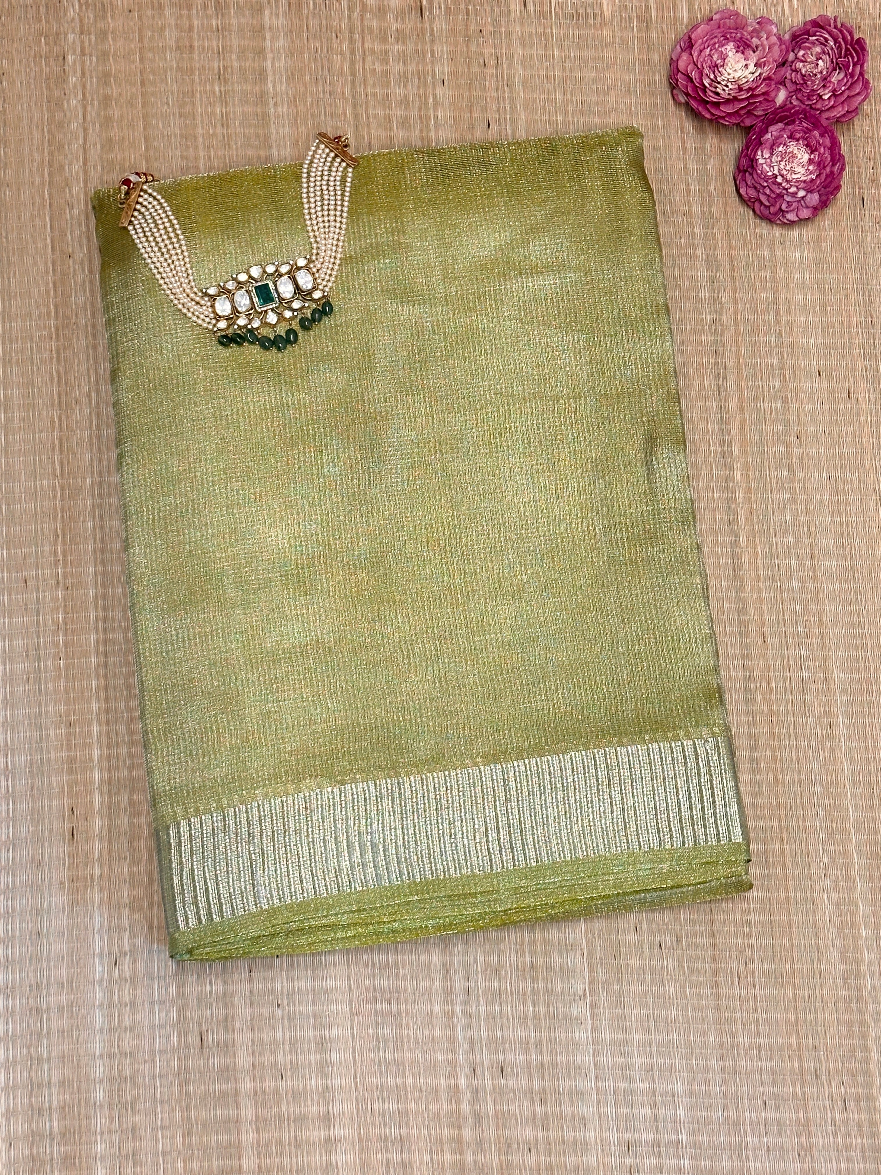 Tissue Tussar saree blended with Zari threads for a soft, lustrous finish.