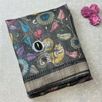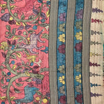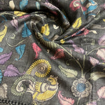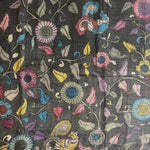 Saree is a completely handwoven Tussar from Chhattisgarh with a thread woven border. The body of the saree is completely hand painted Kalamkari using vegetable dyes. The saree also comes with a contrasting hand painted pallu. This saree is appropriate for office wear, small parties and gatherings.