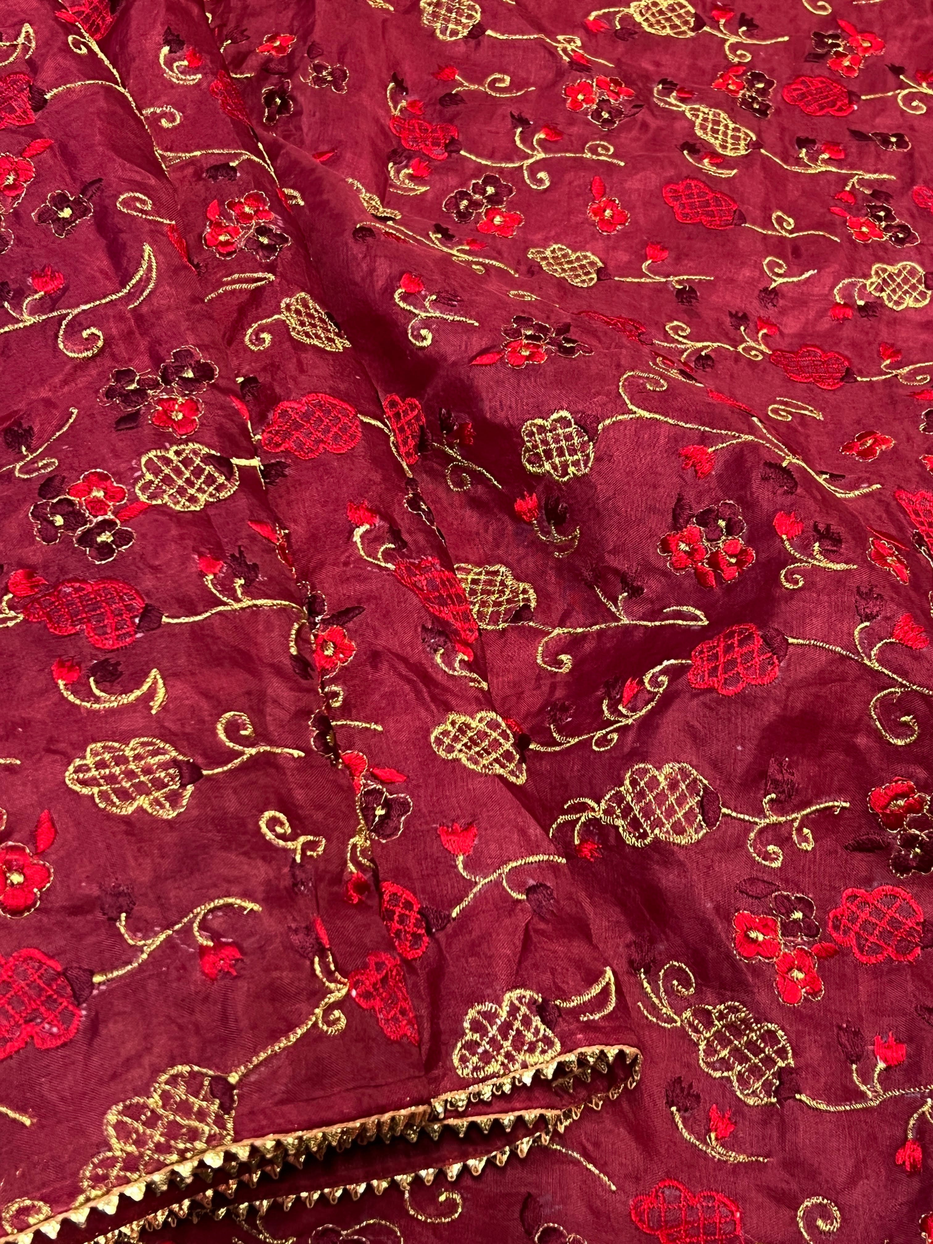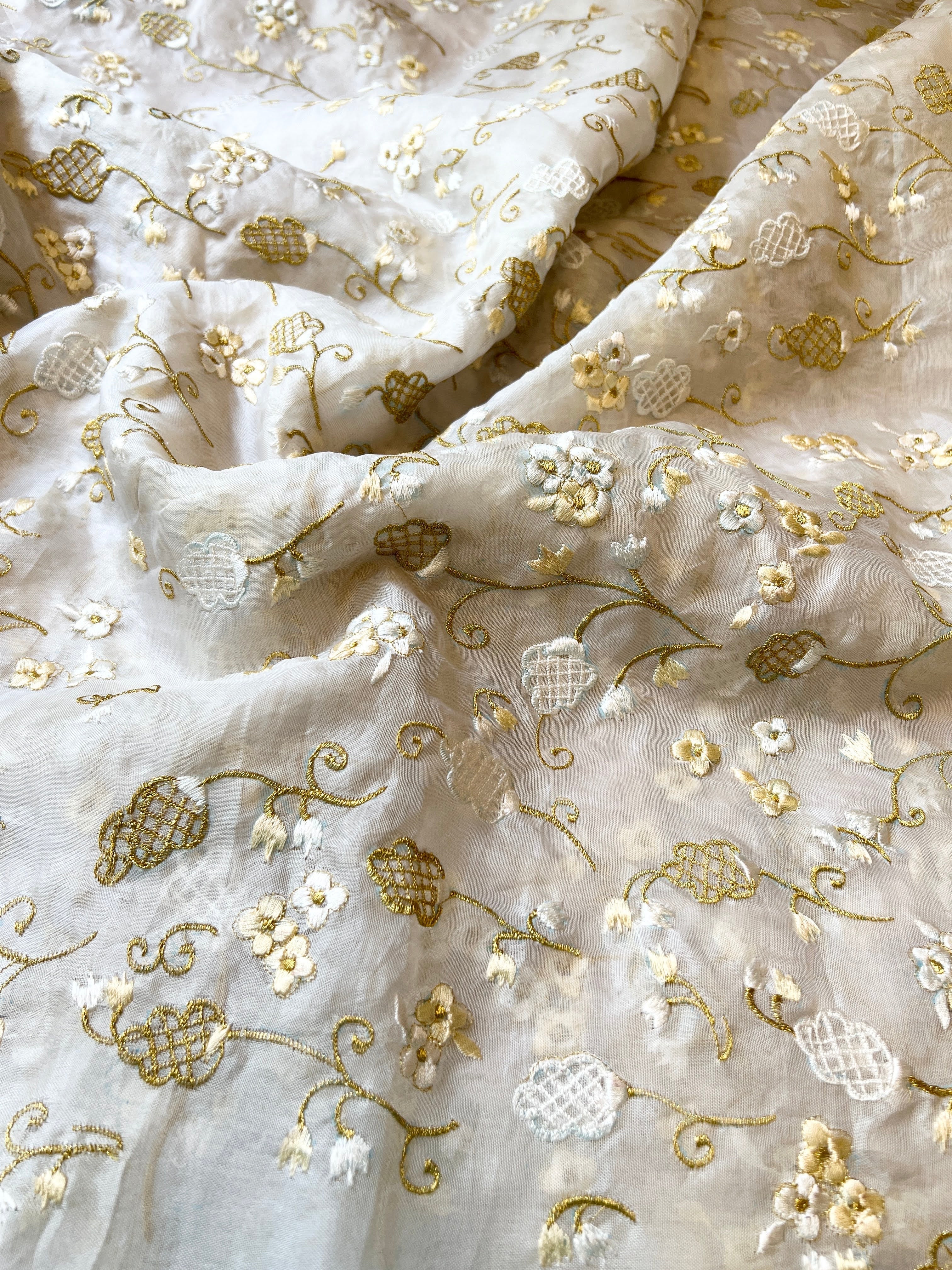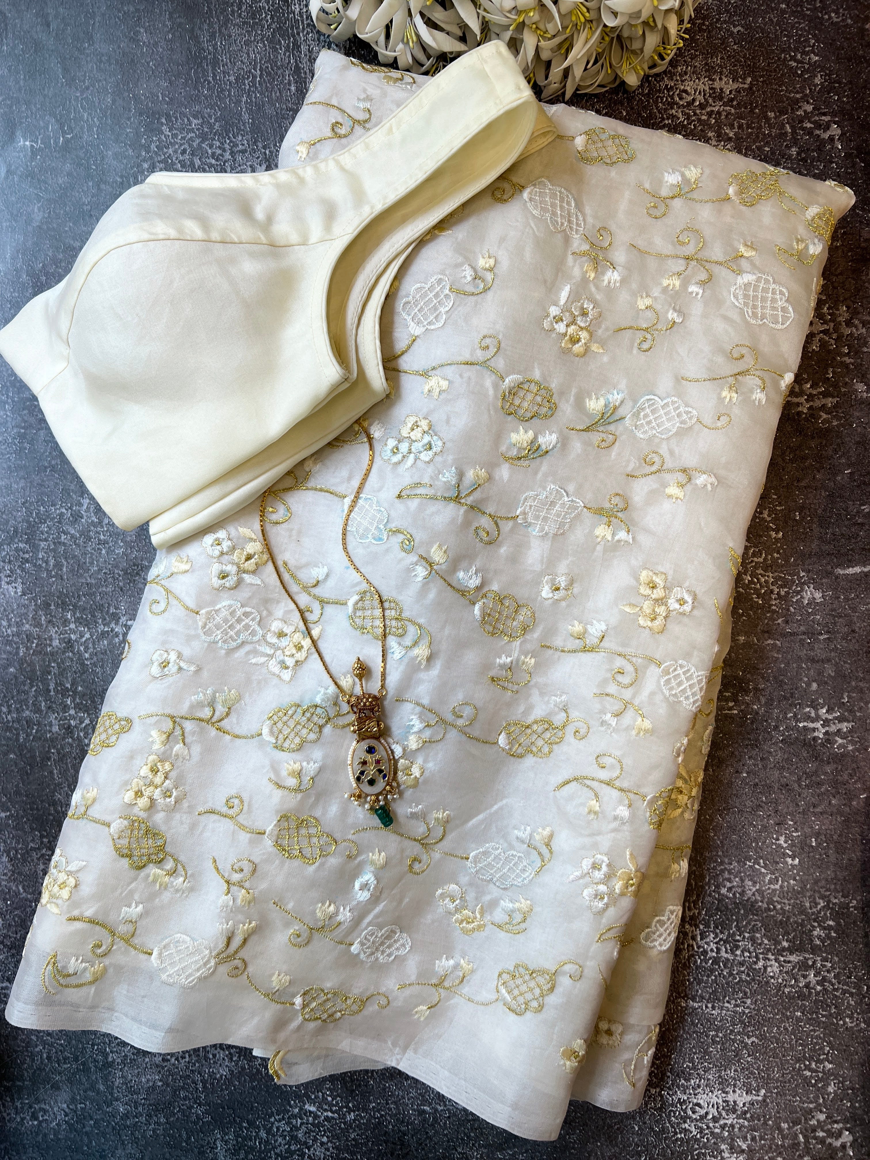 Our next christmas release will make you want to wish twirl in the snow. Crafted from ethereal organza, this exquisite piece is intricately embroidered with a delicate net work in white and gold, creating a magical winter wonderland feel. A crisp layer of delicate delicate gota border adds a touch of festive sophistication. Paired with a plain blouse piece, this ensemble is the epitome of festive grace, evoking the joyous spirit of the season.
