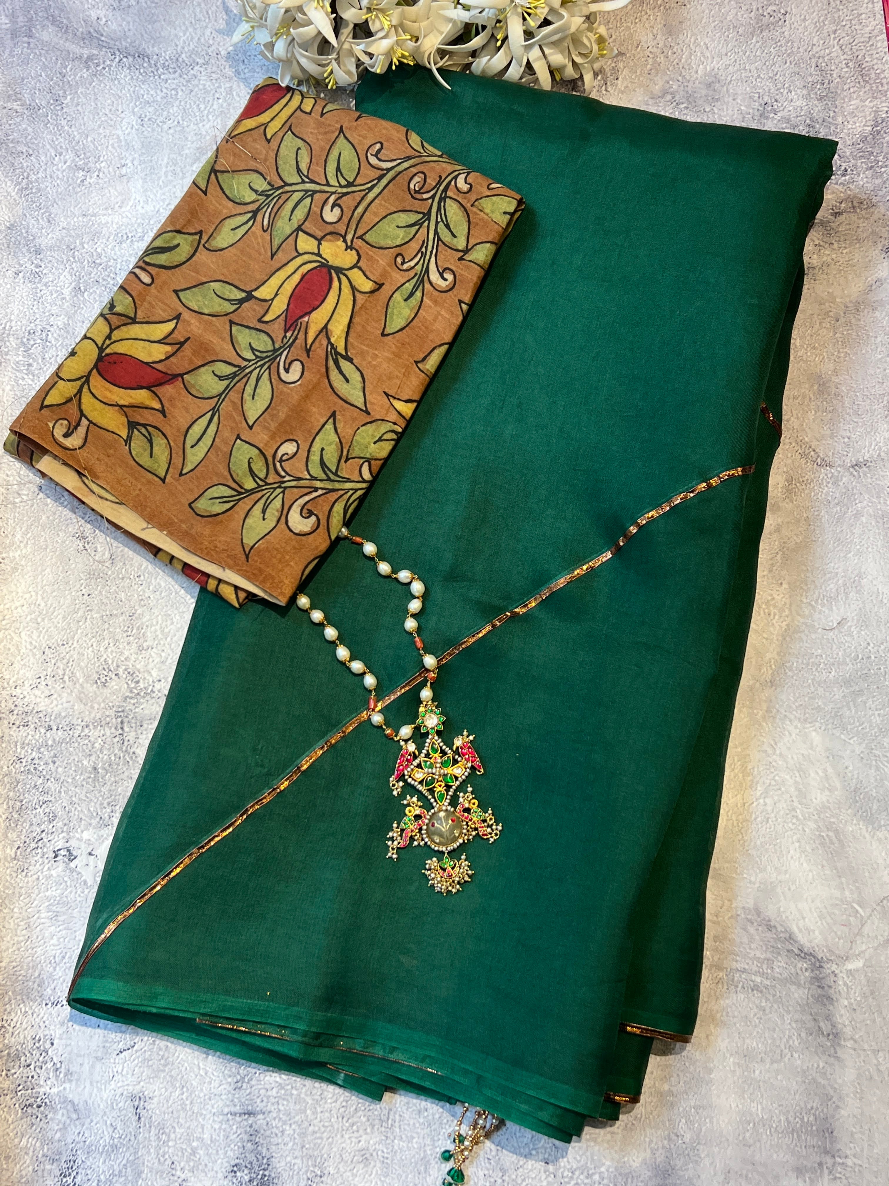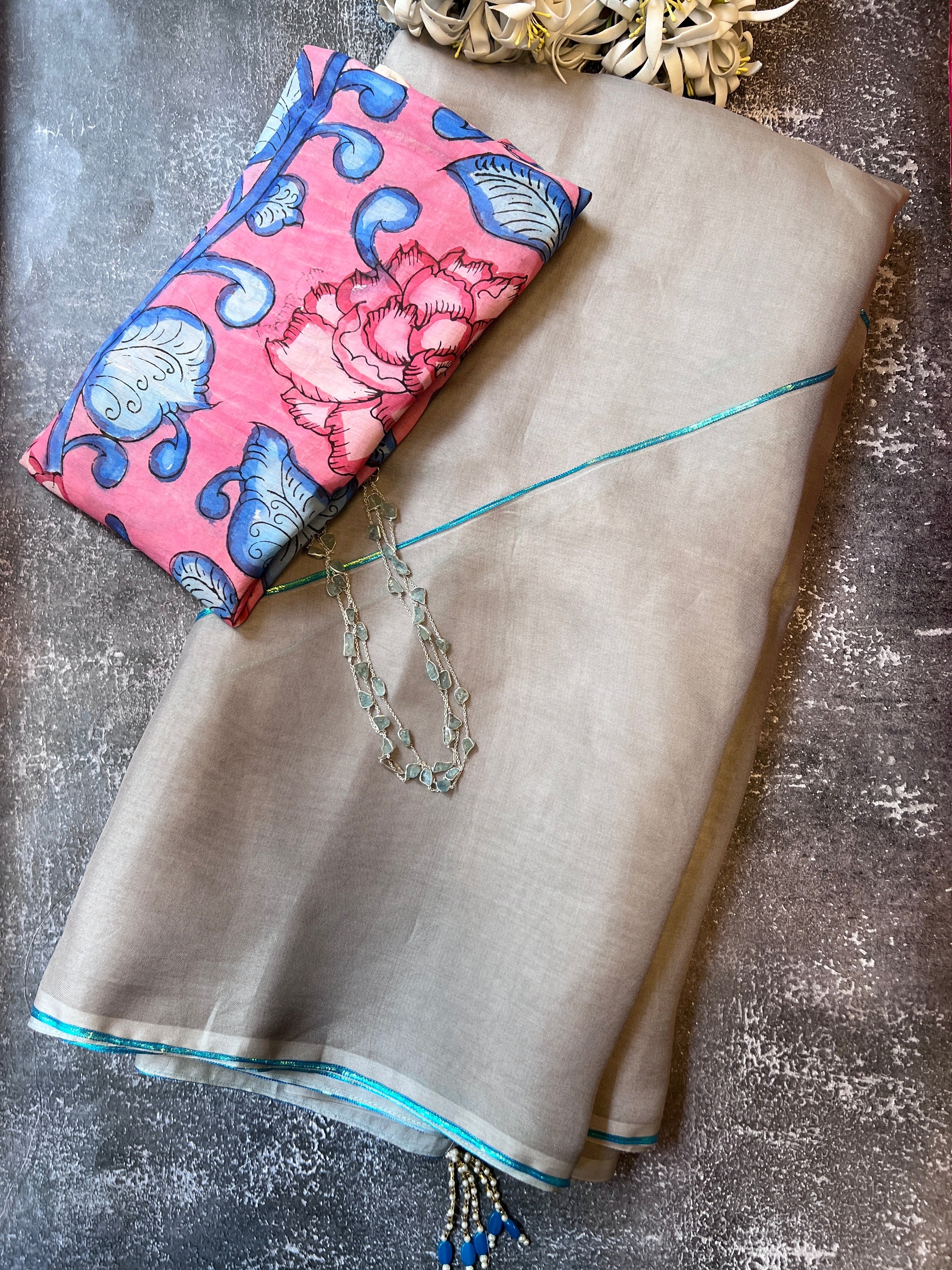 - Comes with a kalamkari handpainted blouse piece