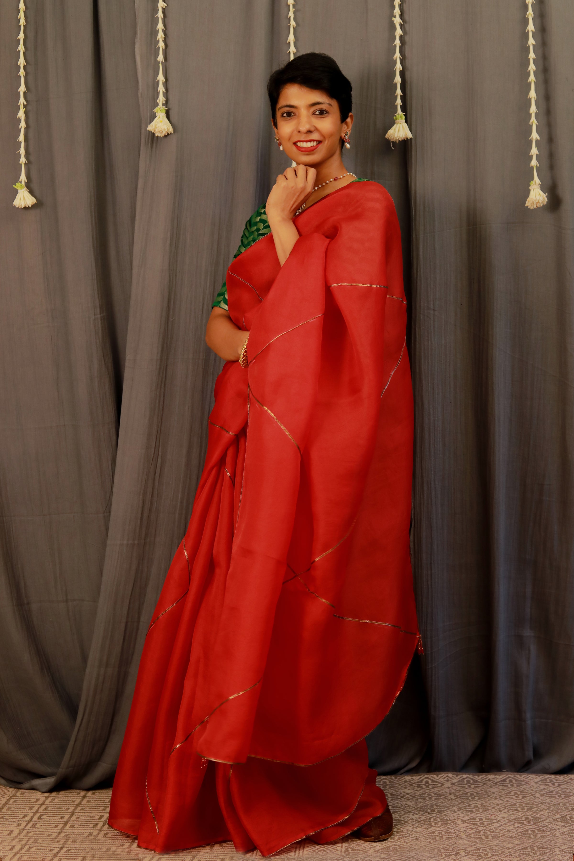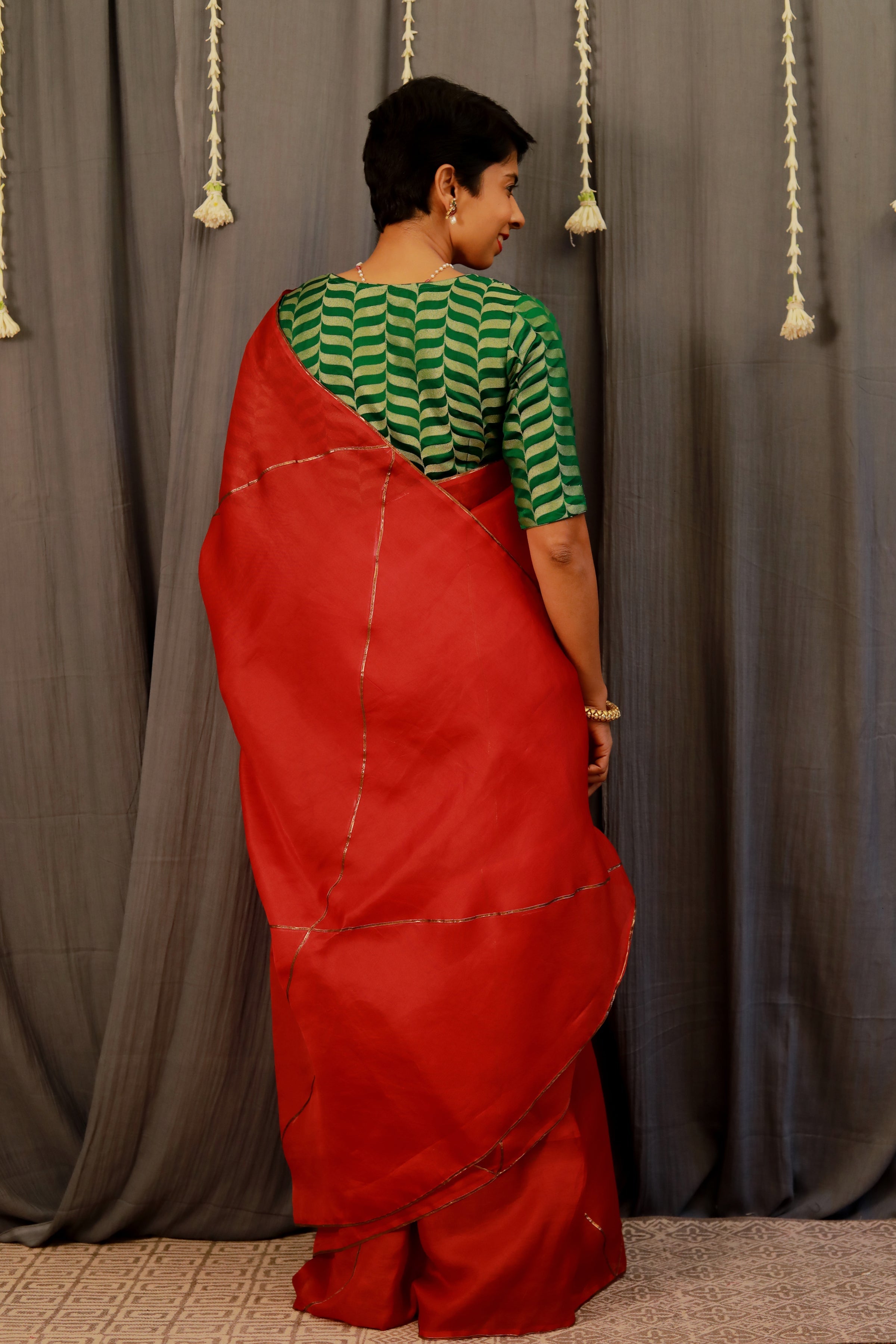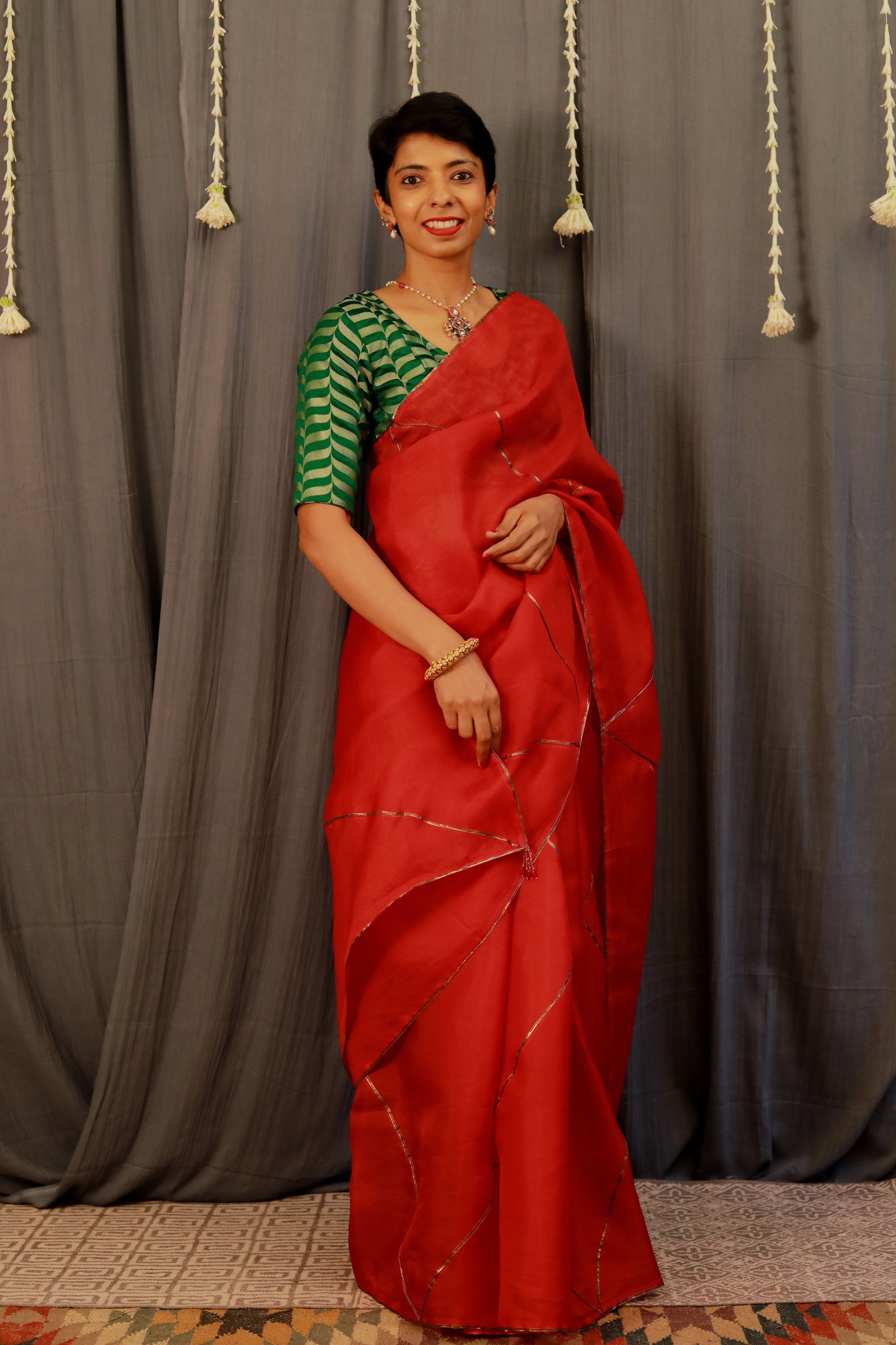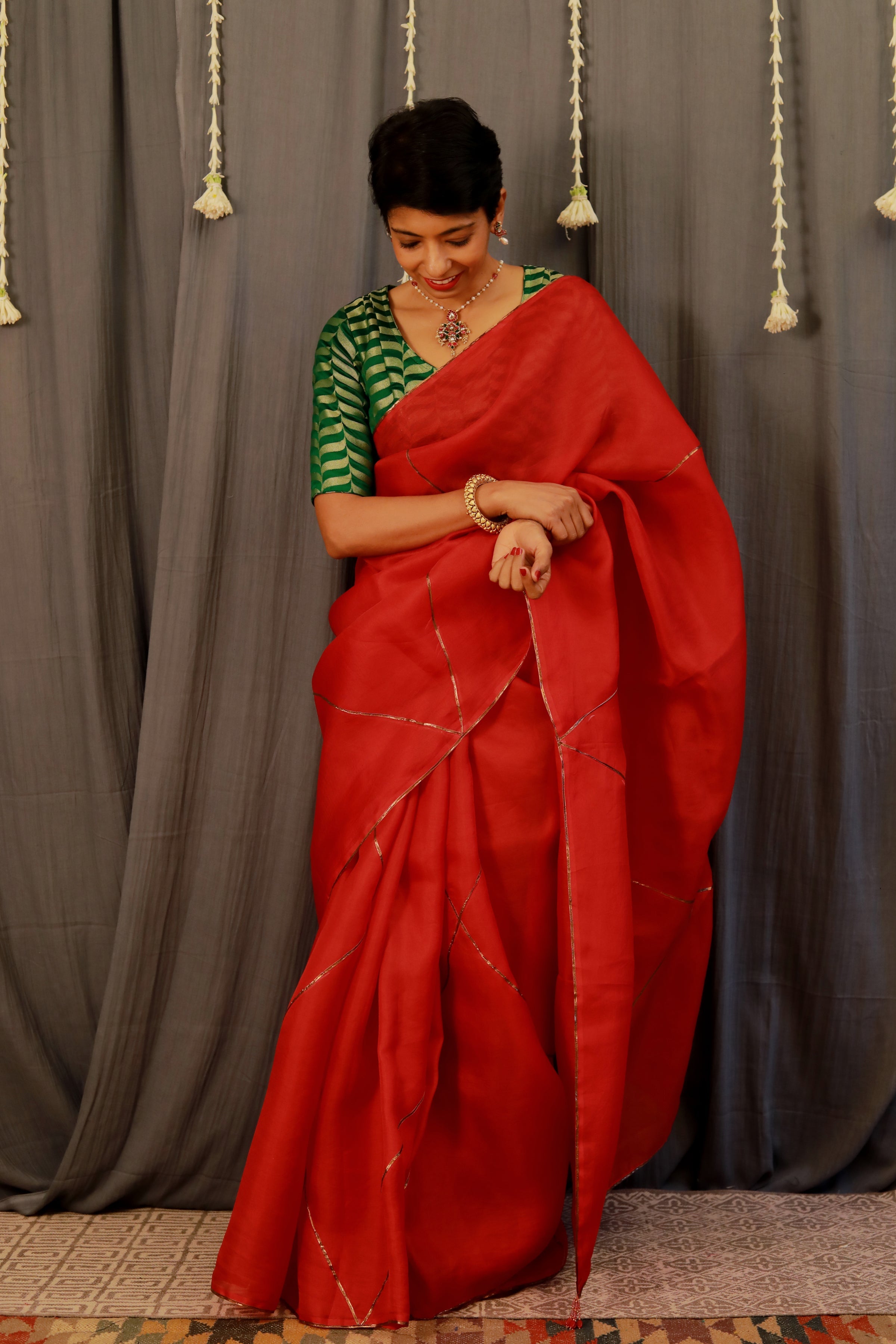 - Metallic detailing on the saree