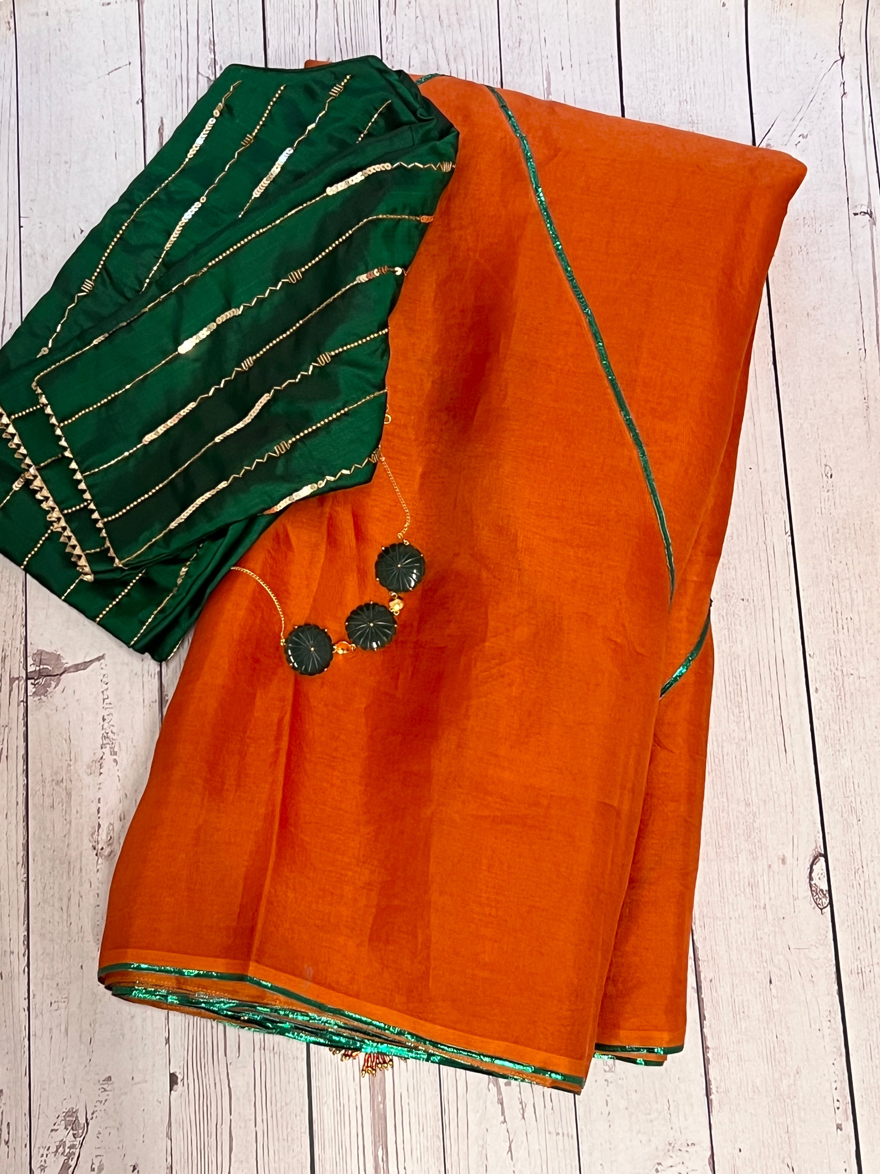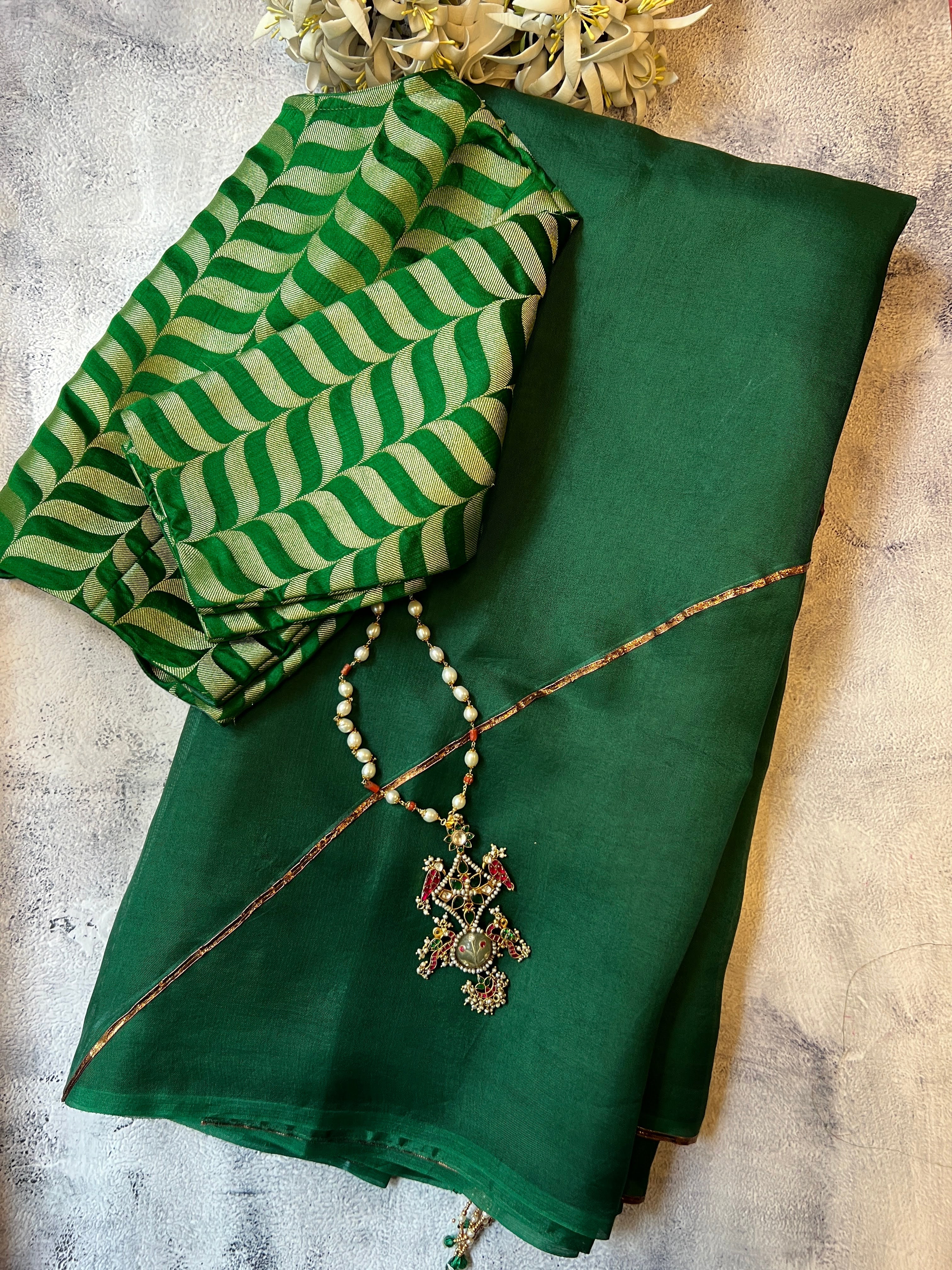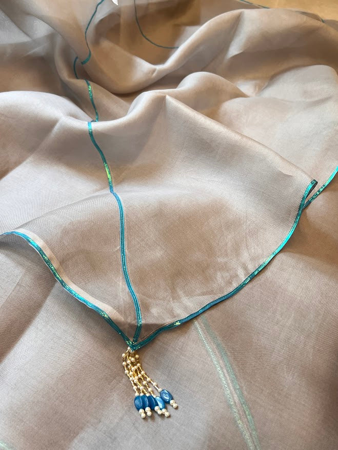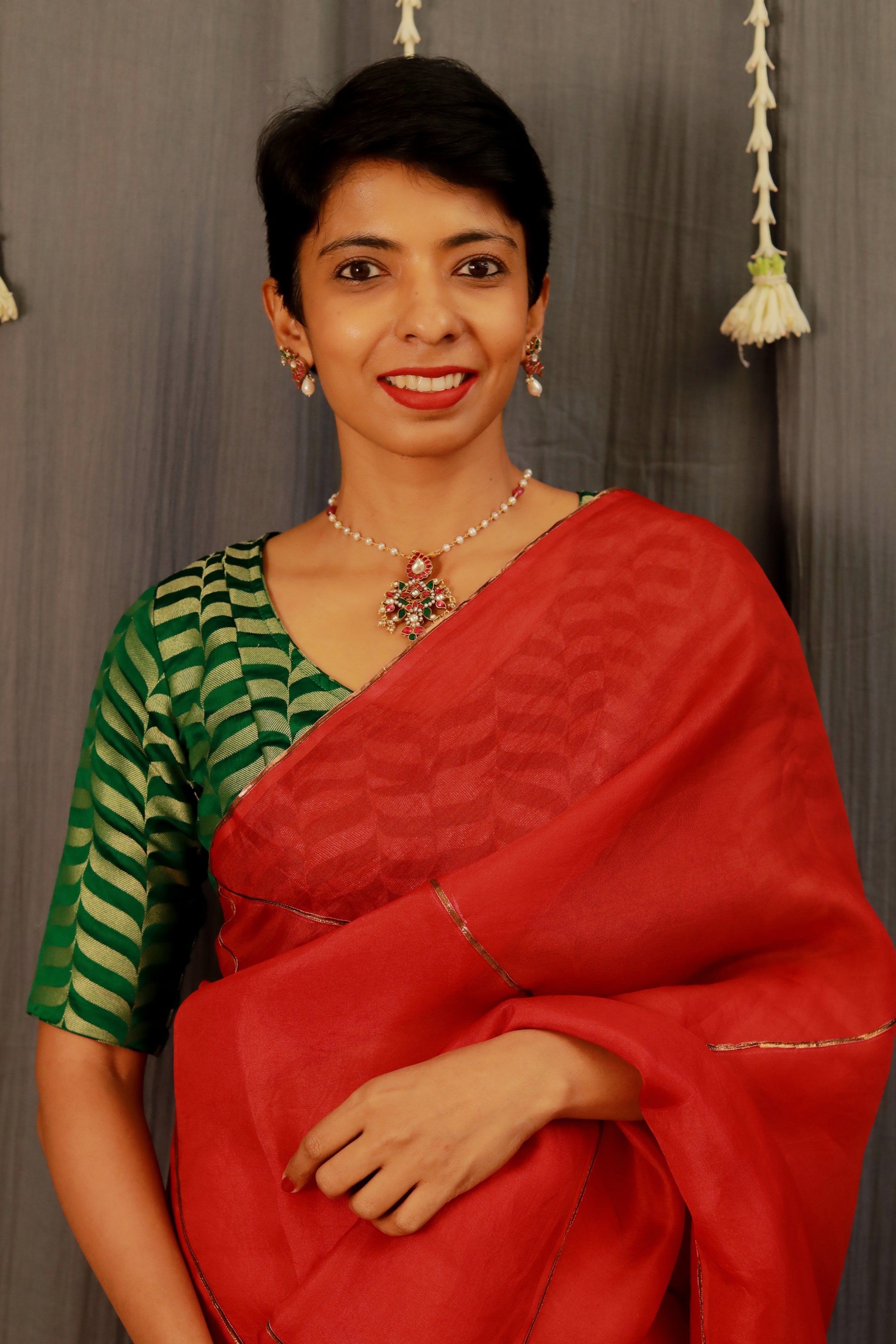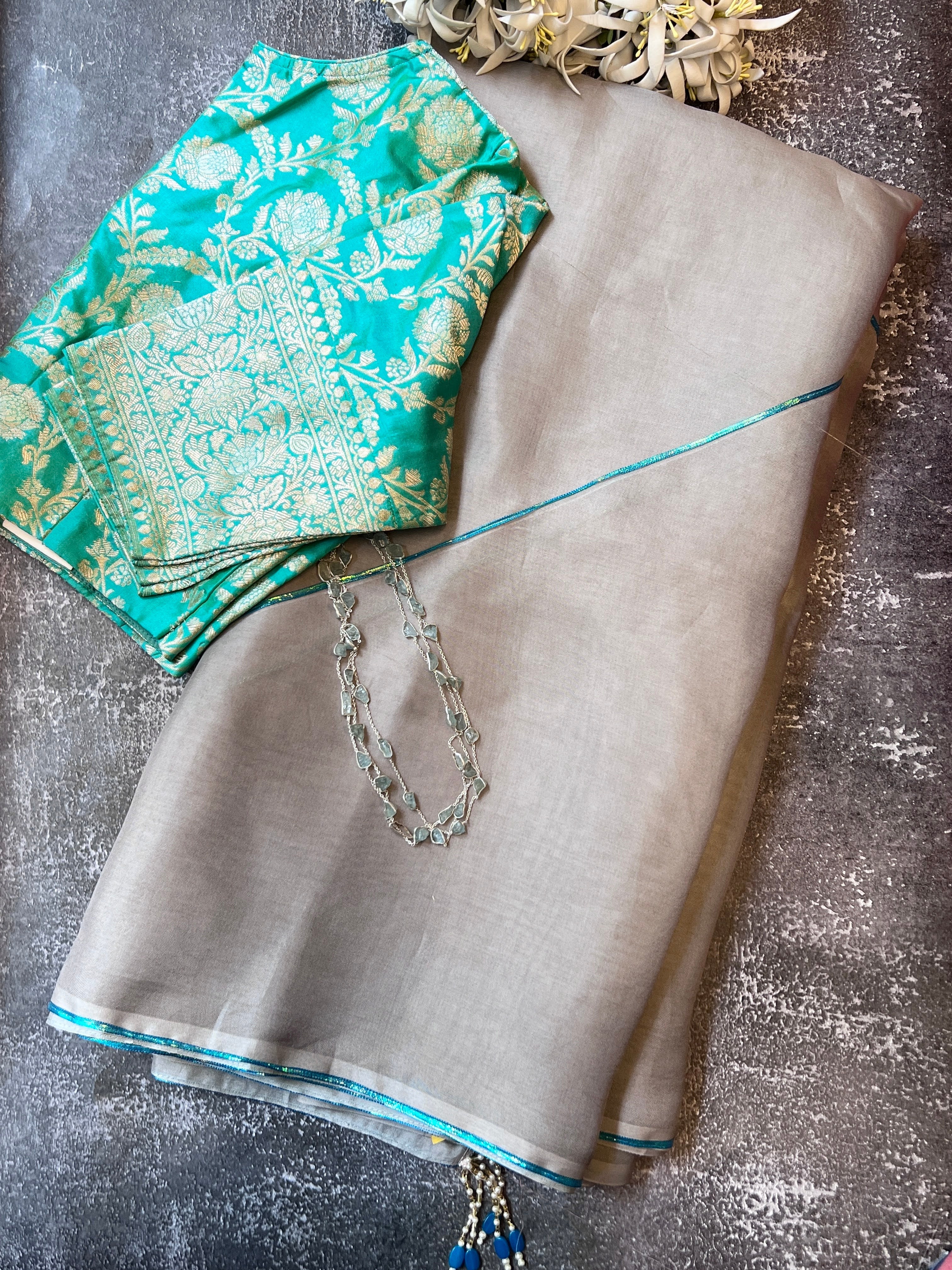 - Metallic detailing on the saree