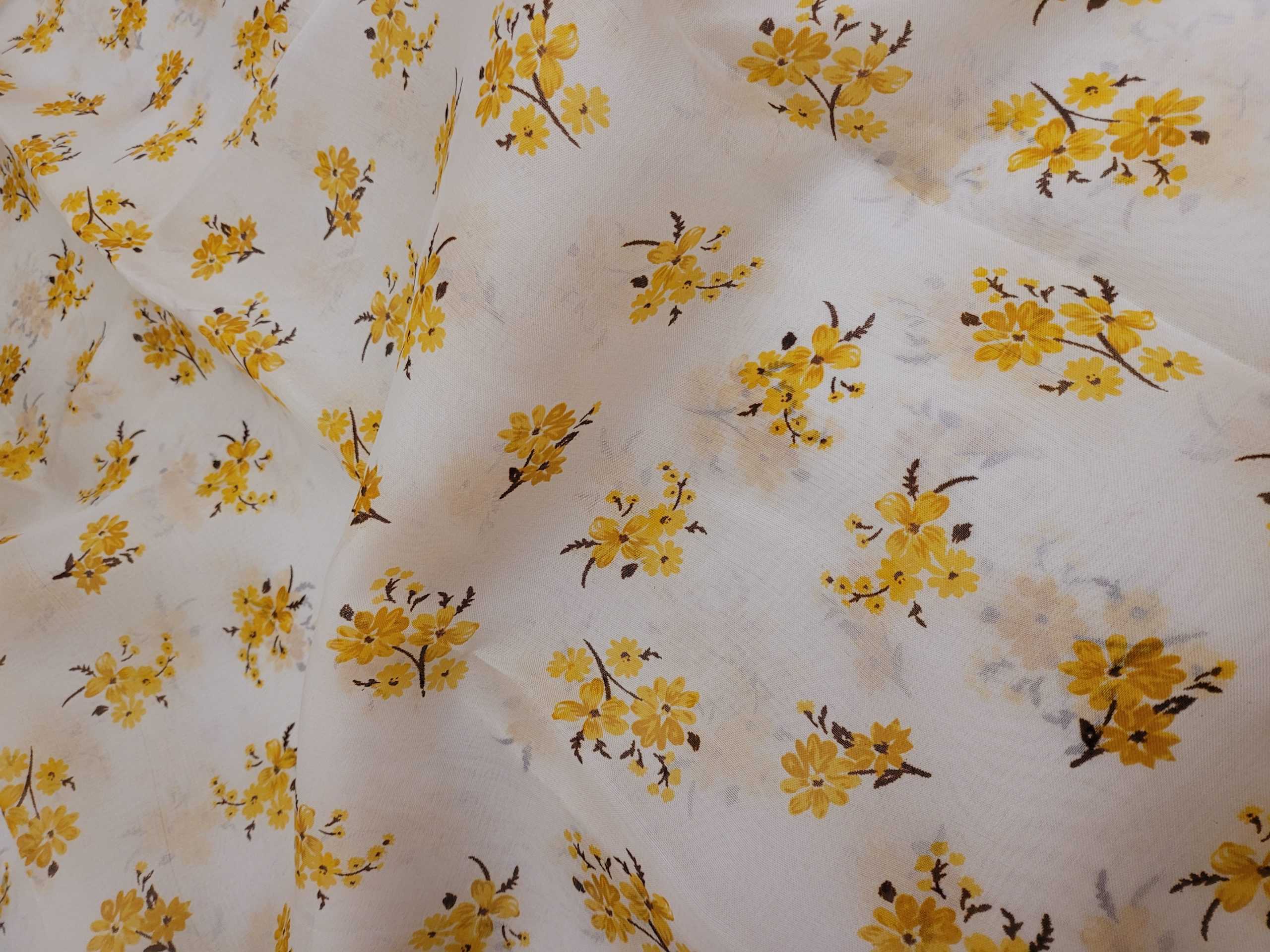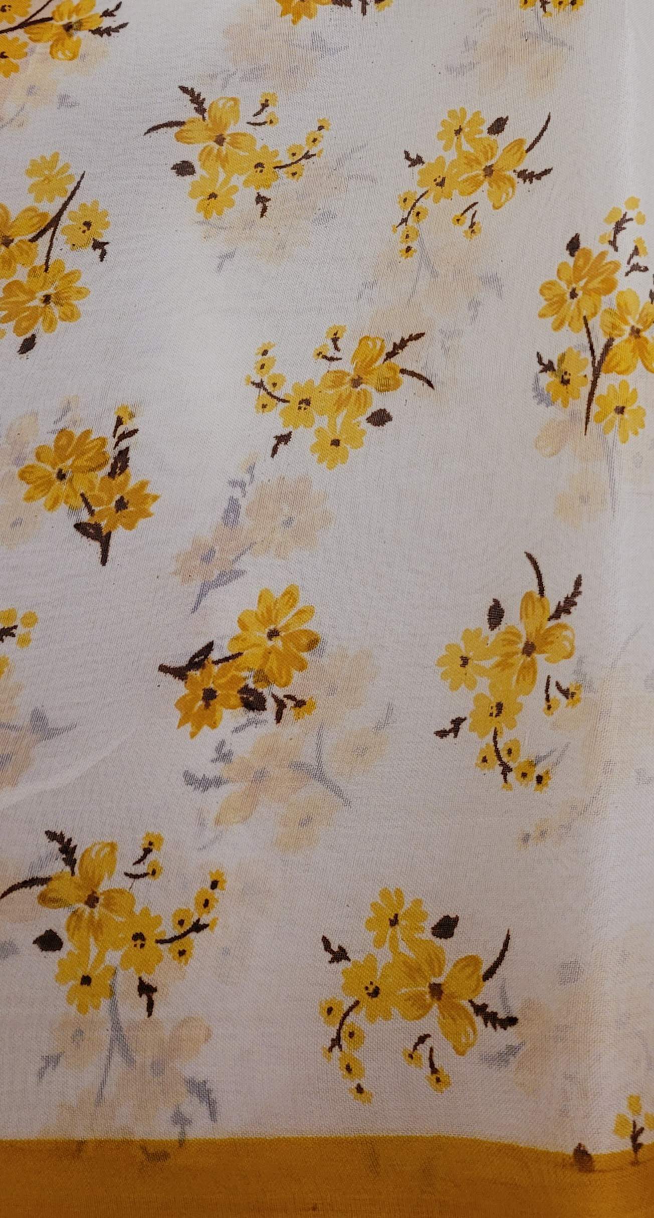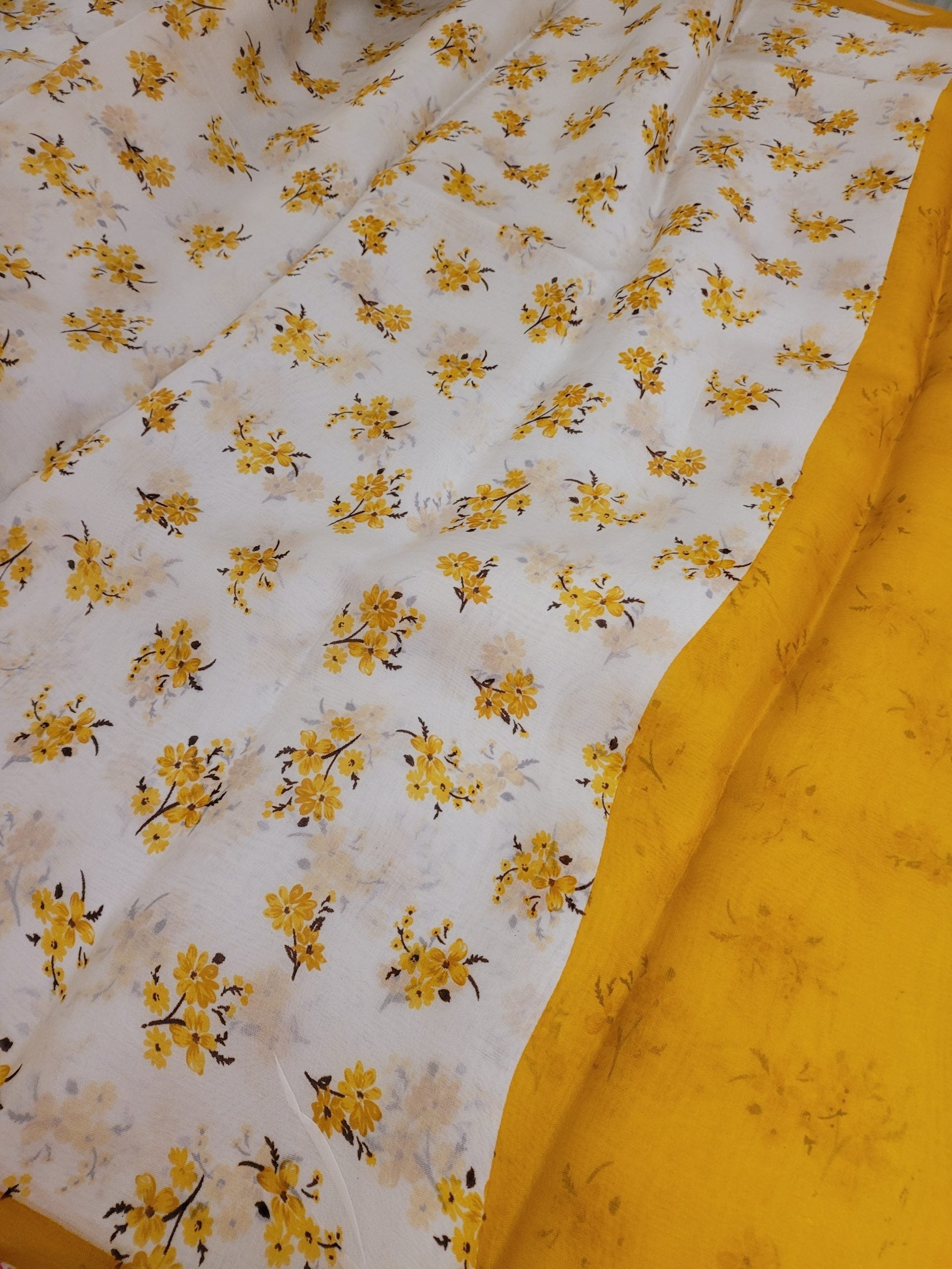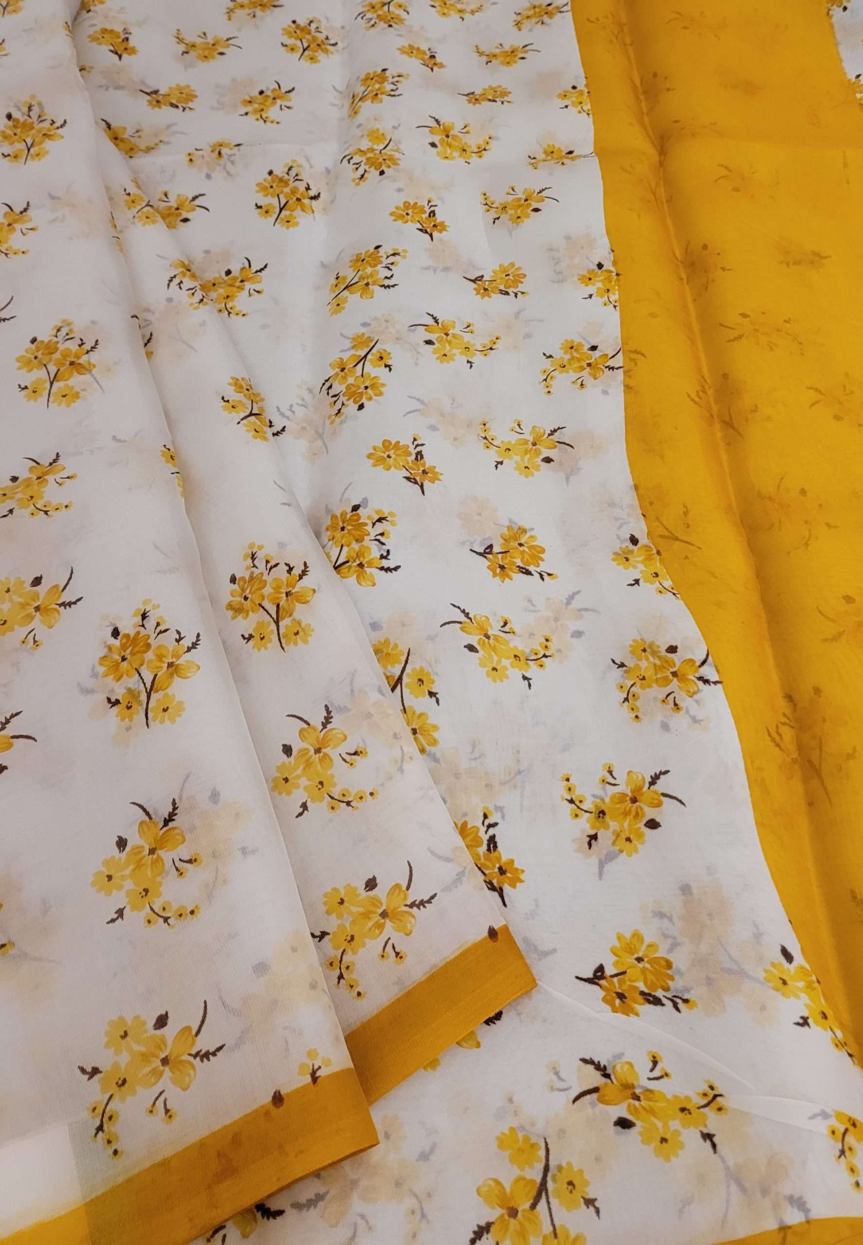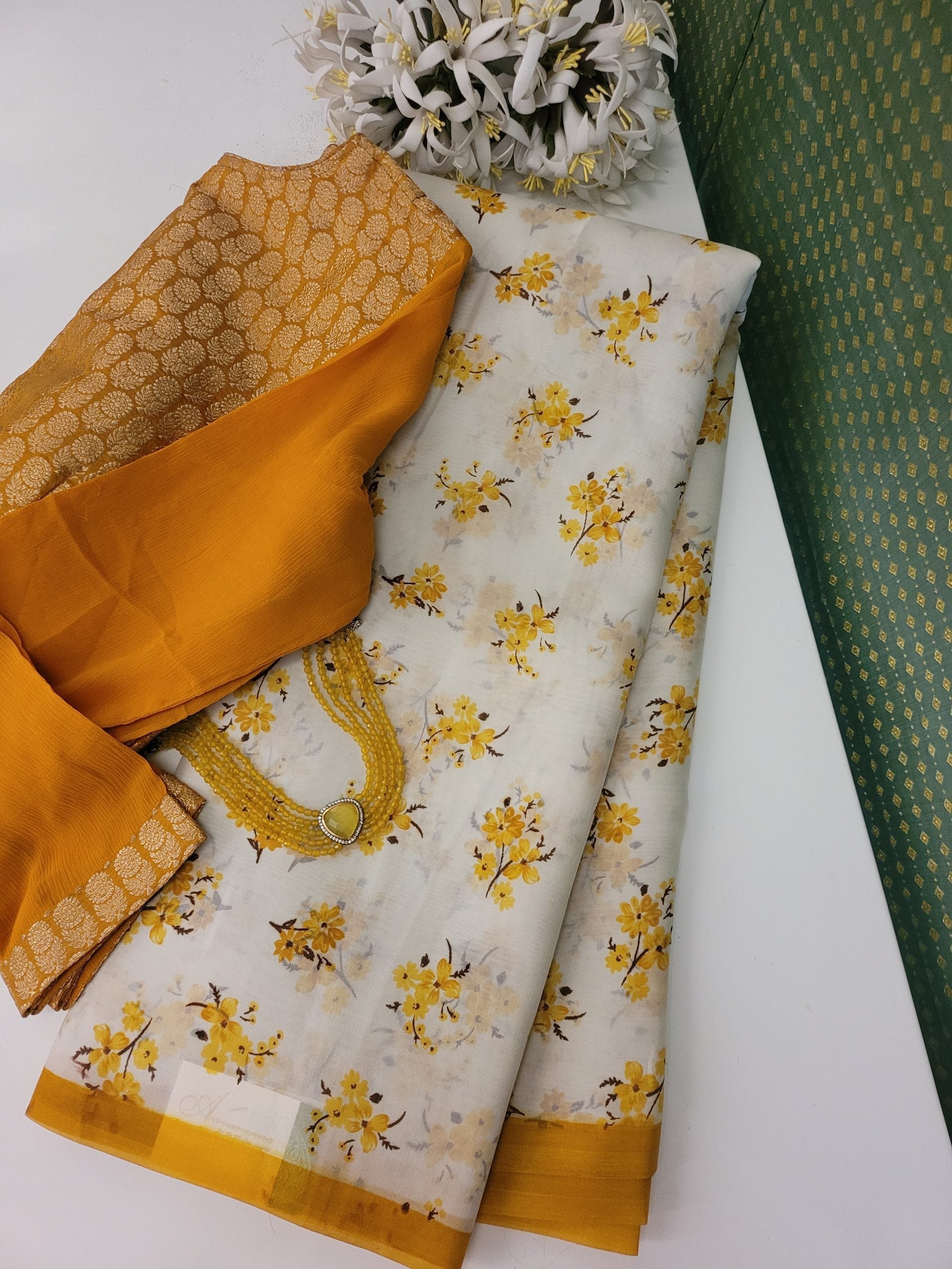 Cream organza saree with handblock printed floral pattern in yellow all over the body with plain orange pallu and selvedge. Organza Fabric: Organza is a lightweight and sheer fabric made from silk or synthetic fibers. It has a crisp texture and a subtle shine, making it a popular choice for formal and festive wear. Handblock Printing: Handblock printing is a traditional Indian textile art where intricate patterns and designs are stamped onto the fabric using wooden blocks. Each block is carved with the desired pattern, and skilled artisans use these blocks to create intricate and repetitive designs on the fabric. Blouse: Cream organza with floral print as in saree. It can be paired with any silver jewelry and ready to wear blouse to add more shine and colour and the same can be purchased from the? ? Accessories ? and ? Ready to wear?? section respectively. Note : The tailored blouse featured is only for reference.