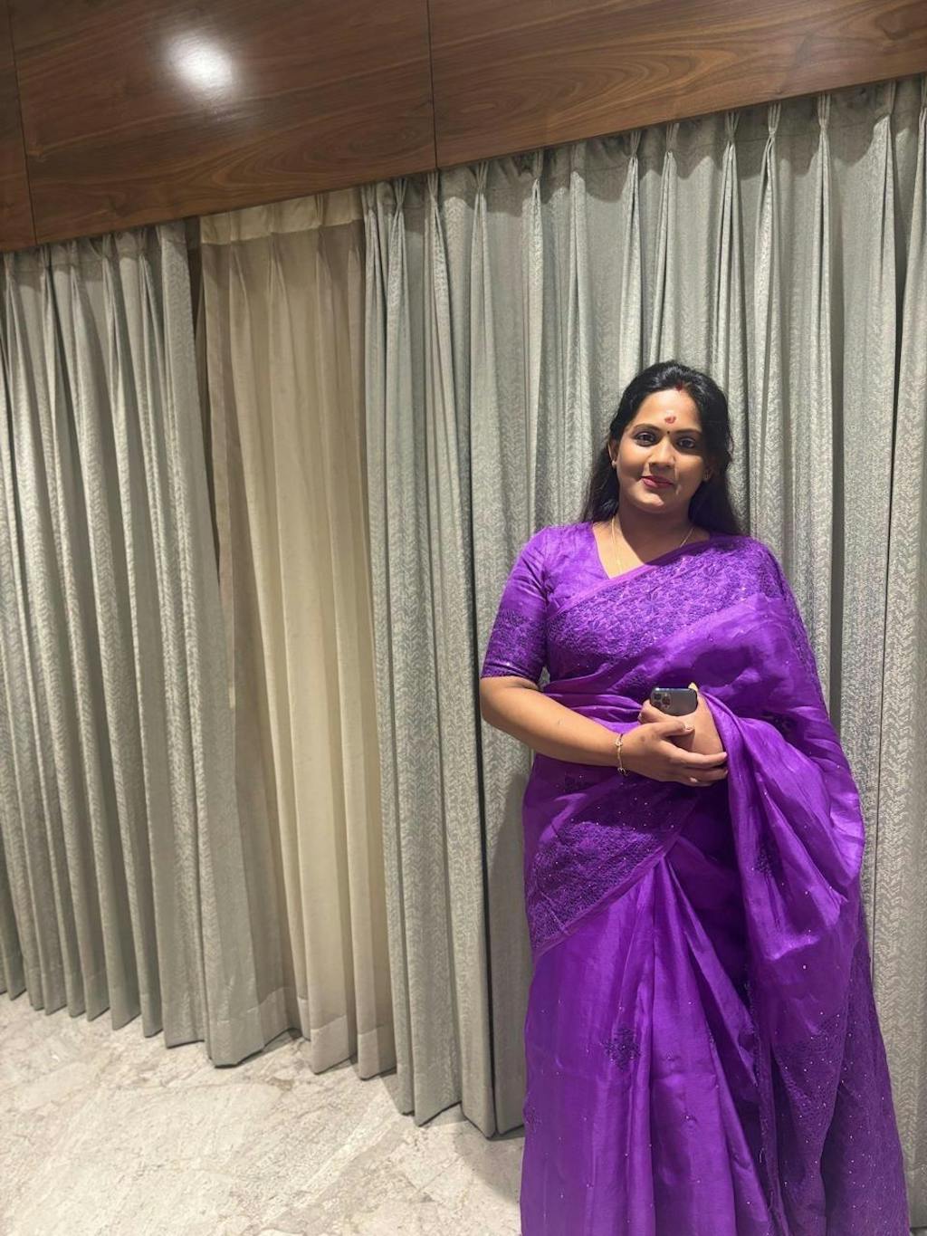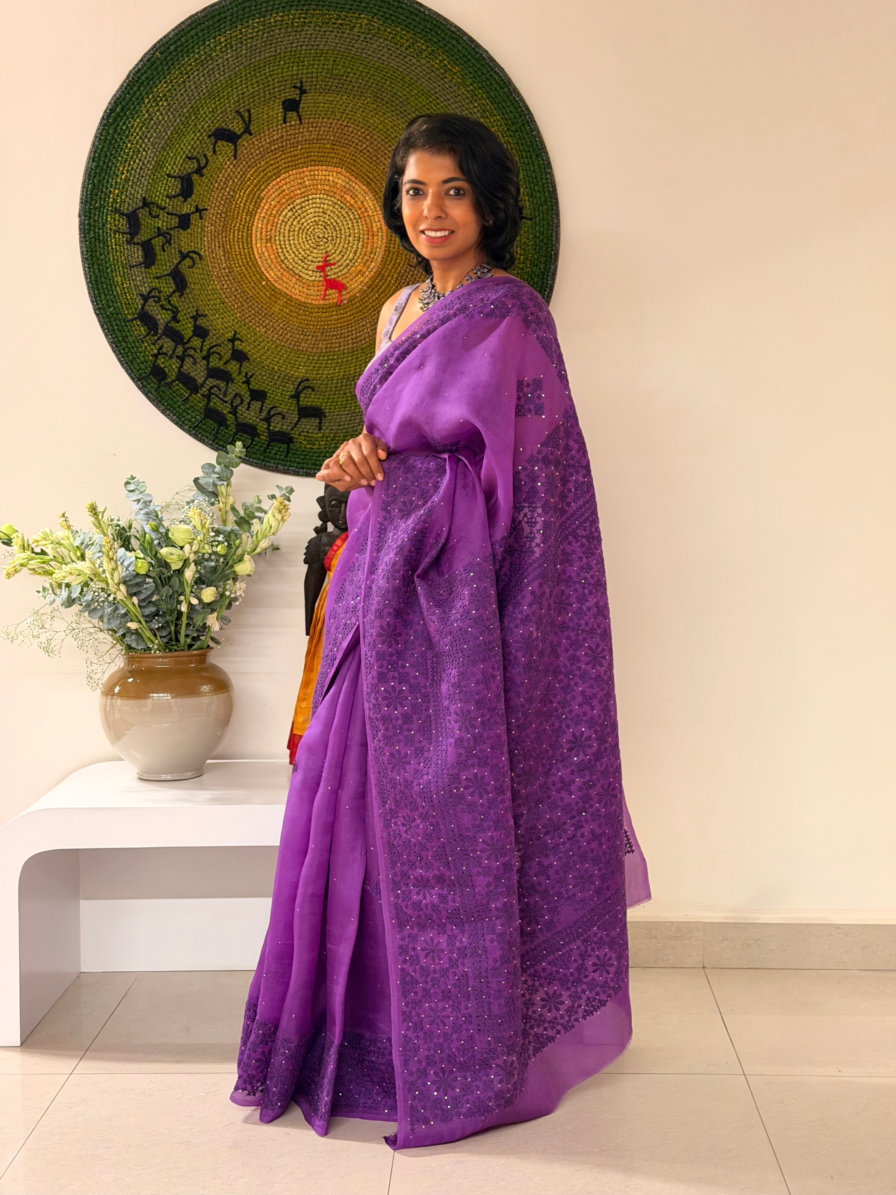 Barely sheer organza saree in a plain, elegant tone with a soft, sheer finish.