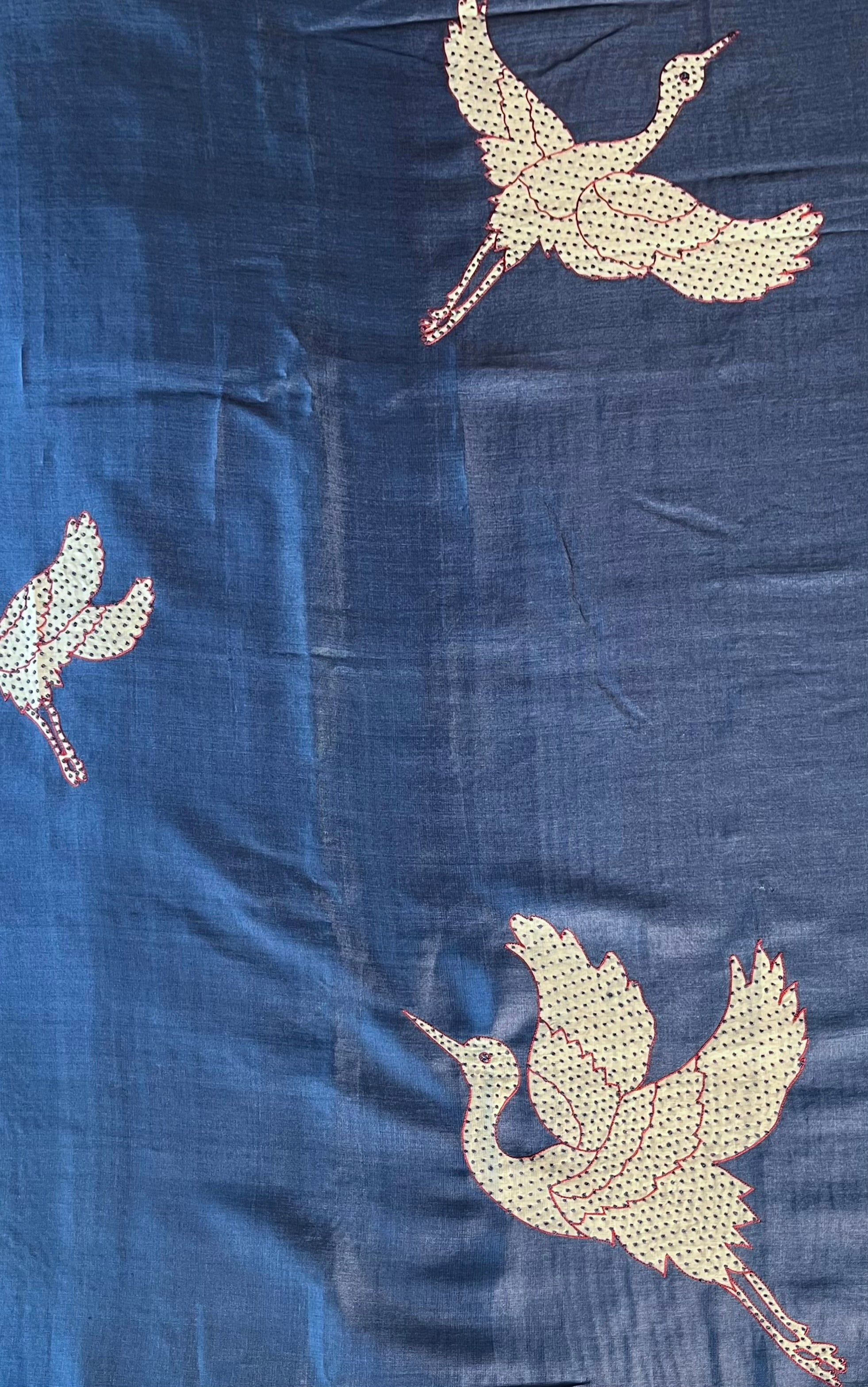 Pure handwoven Tissar sarees with hand printed appliqué on the body and pallu. The saree has a beautiful finishing and drapes elegantly. The saree has an attached blouse piece and can be worn stylishly for small gathering