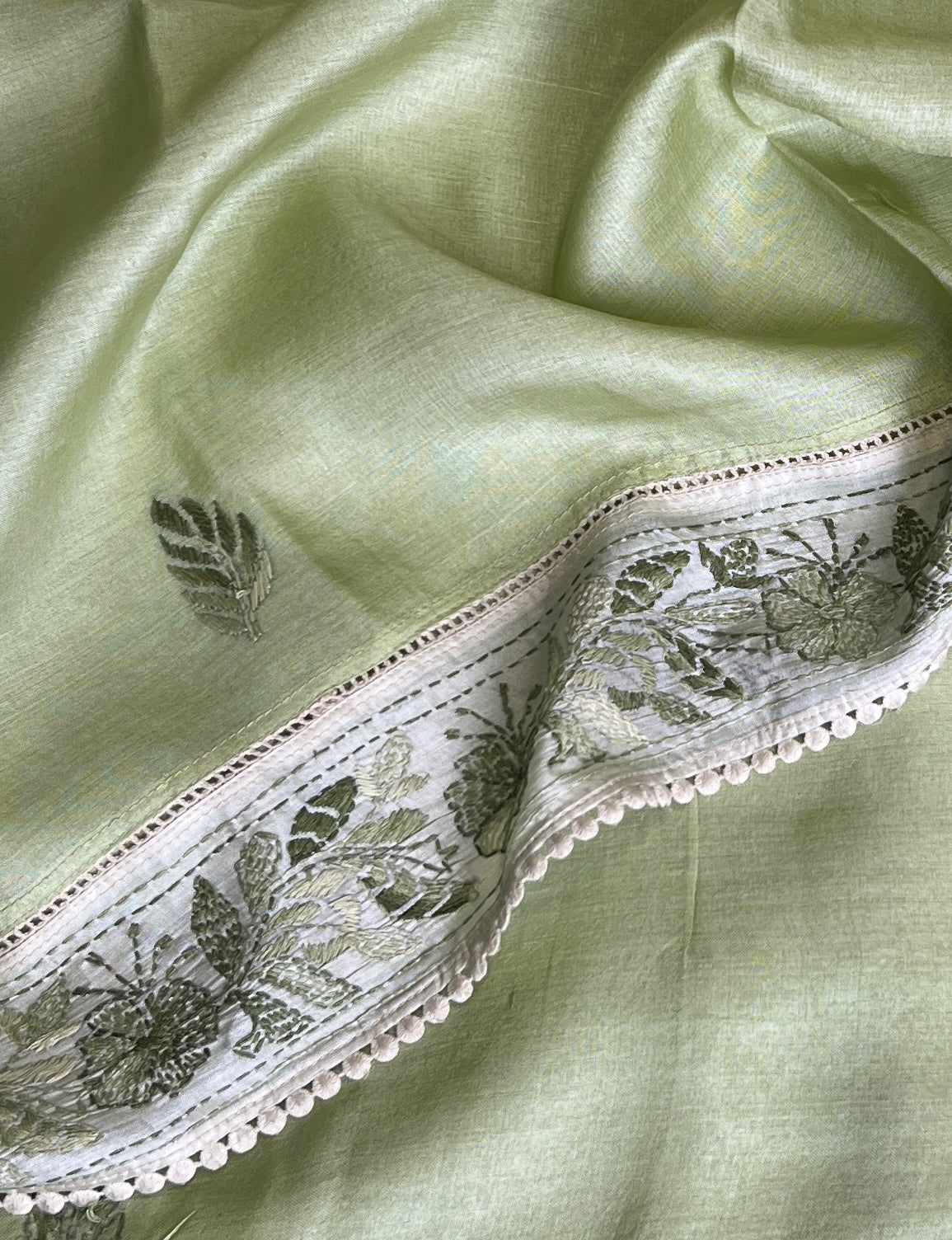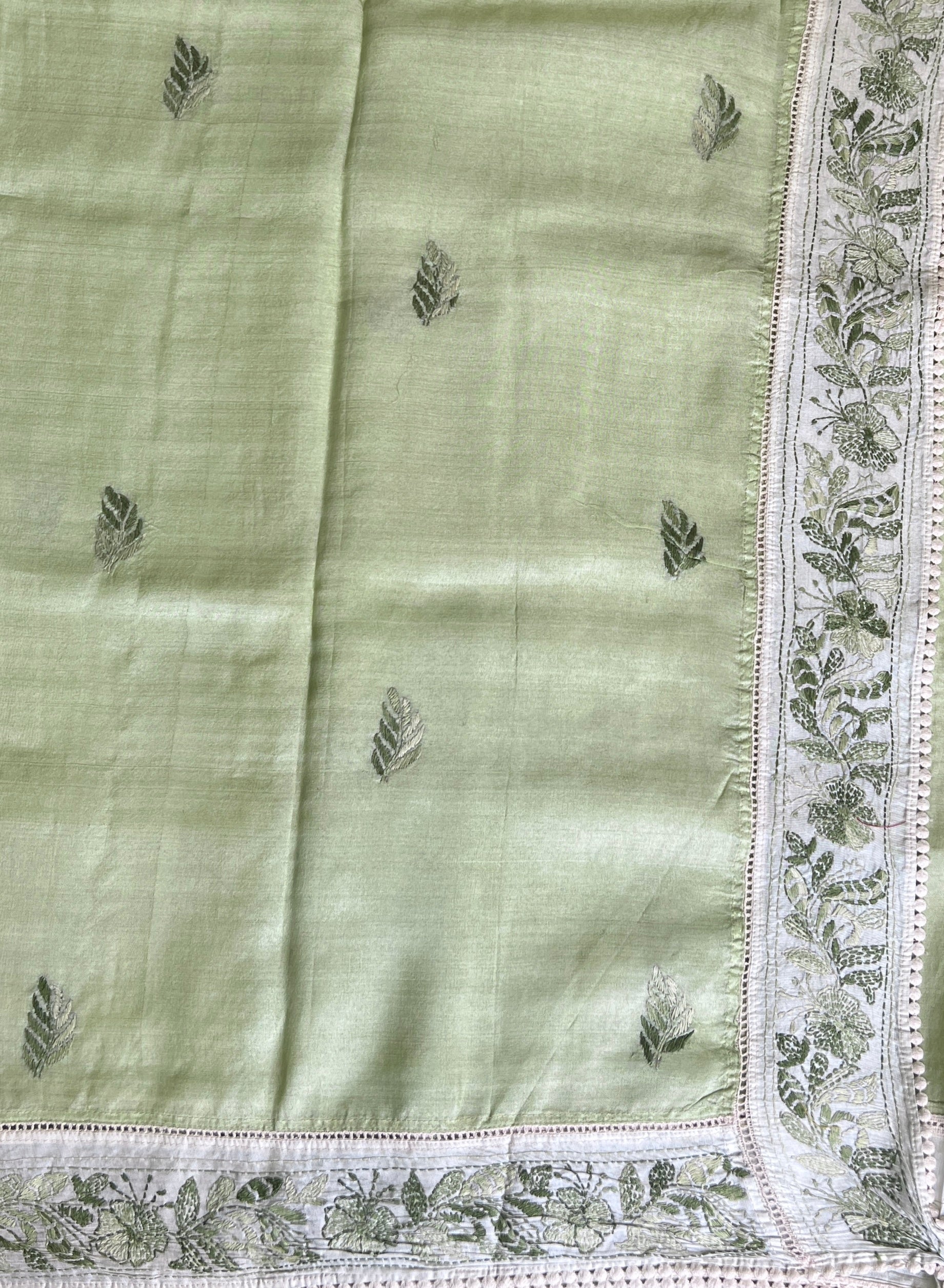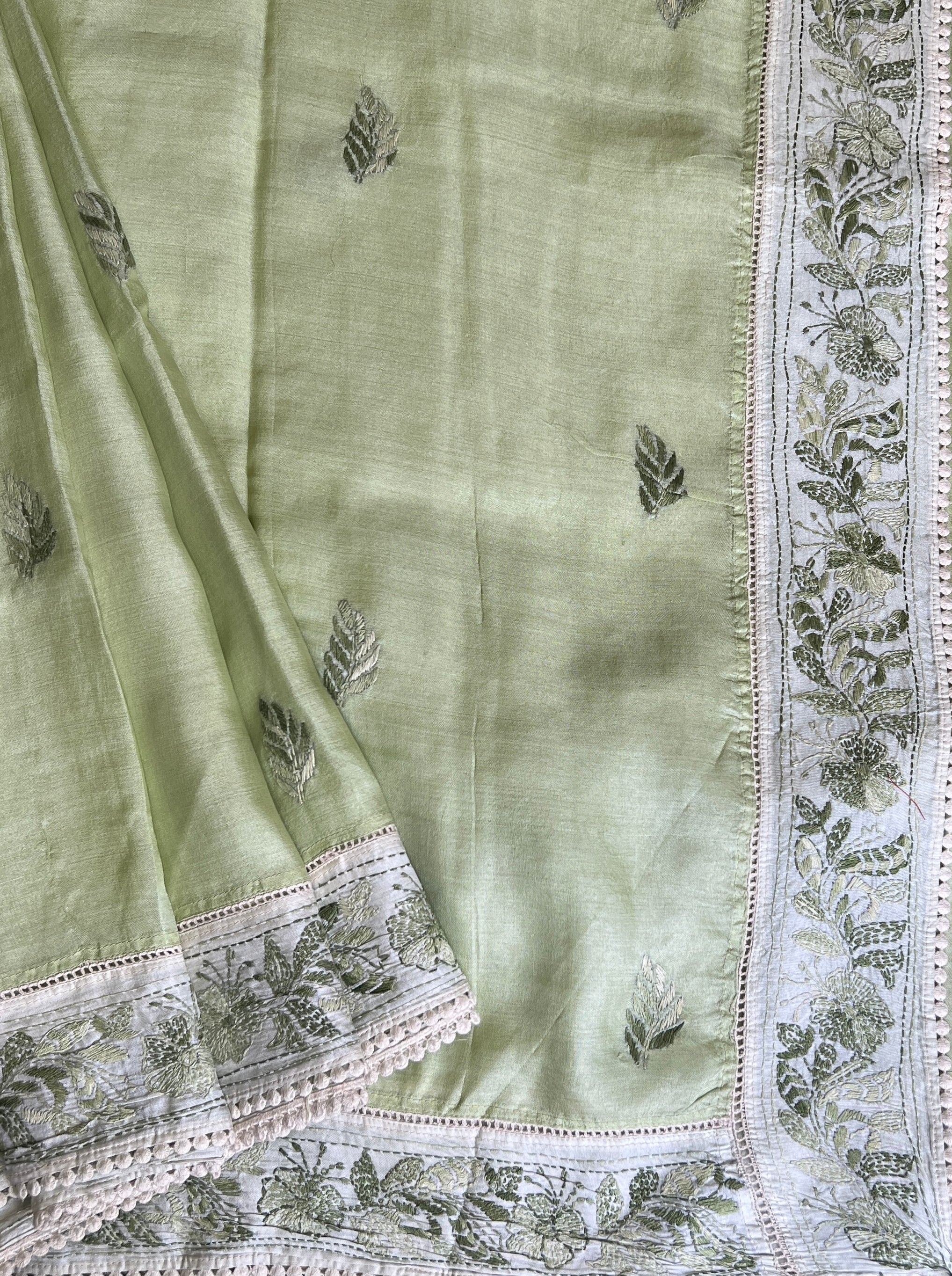 - Hand embroidered chikankari work on the border, and pallu