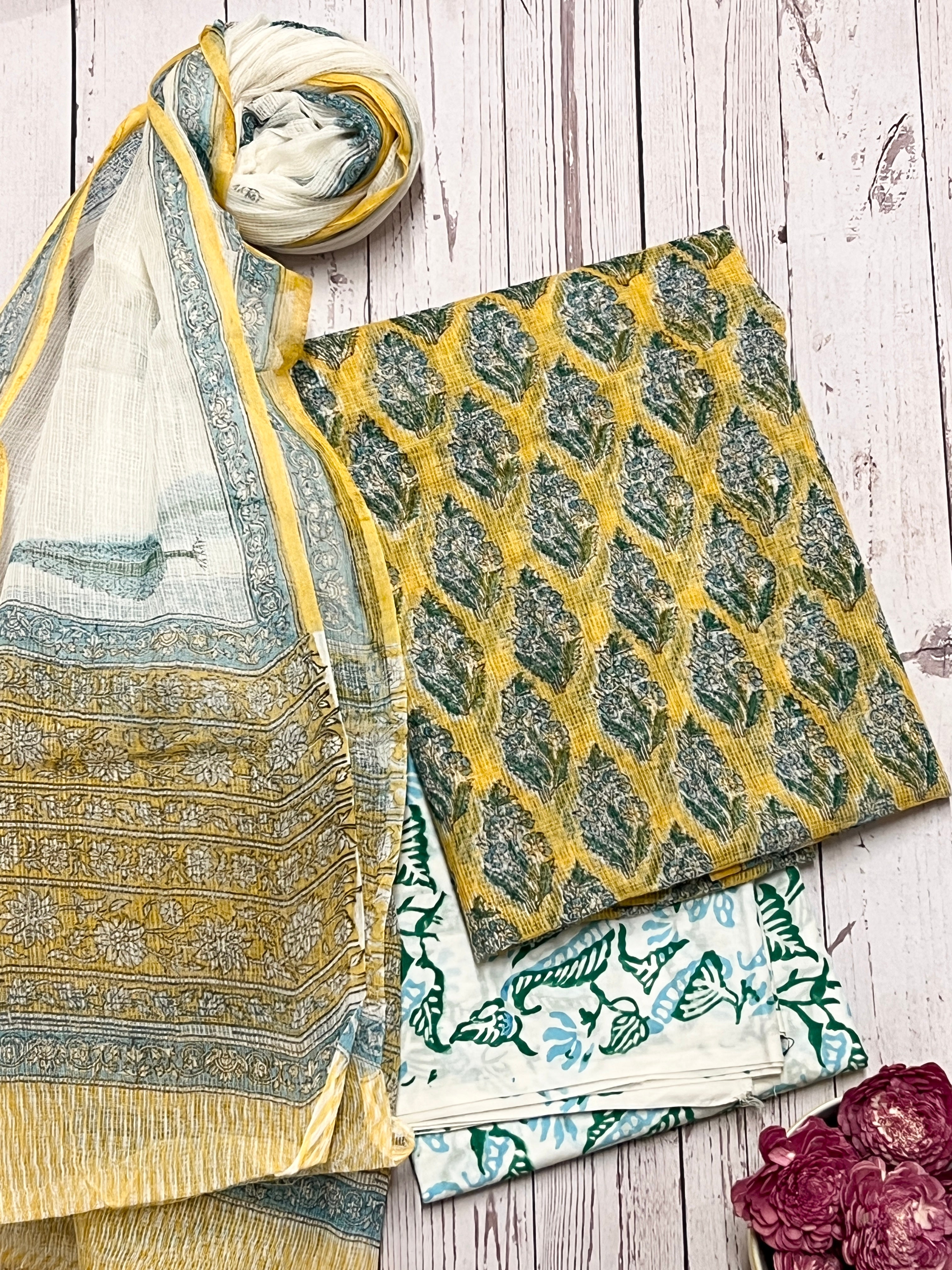 - 4 piece set, comes with a paired lining, printed cotton bottom fabric and kota doriya dupatta