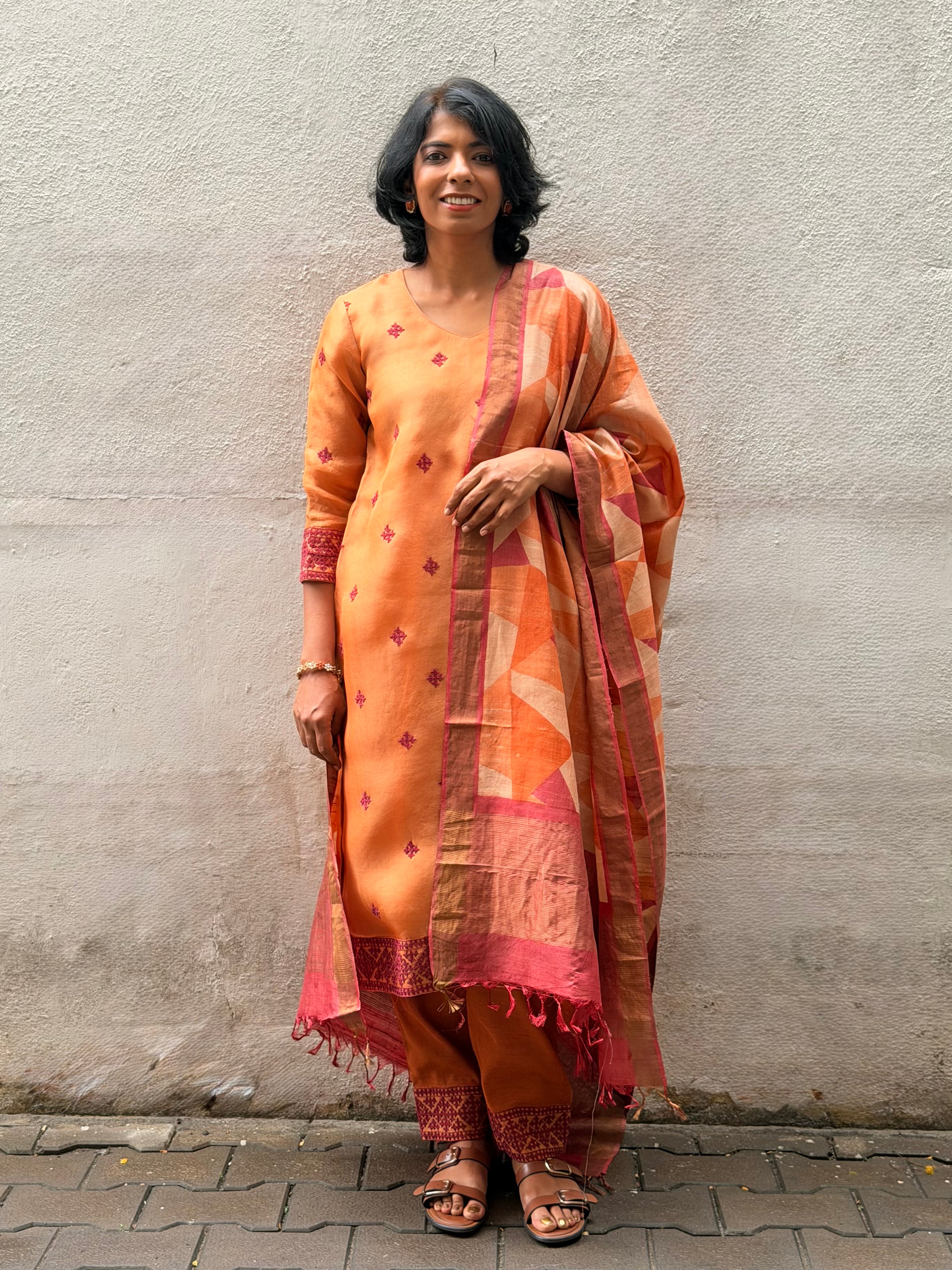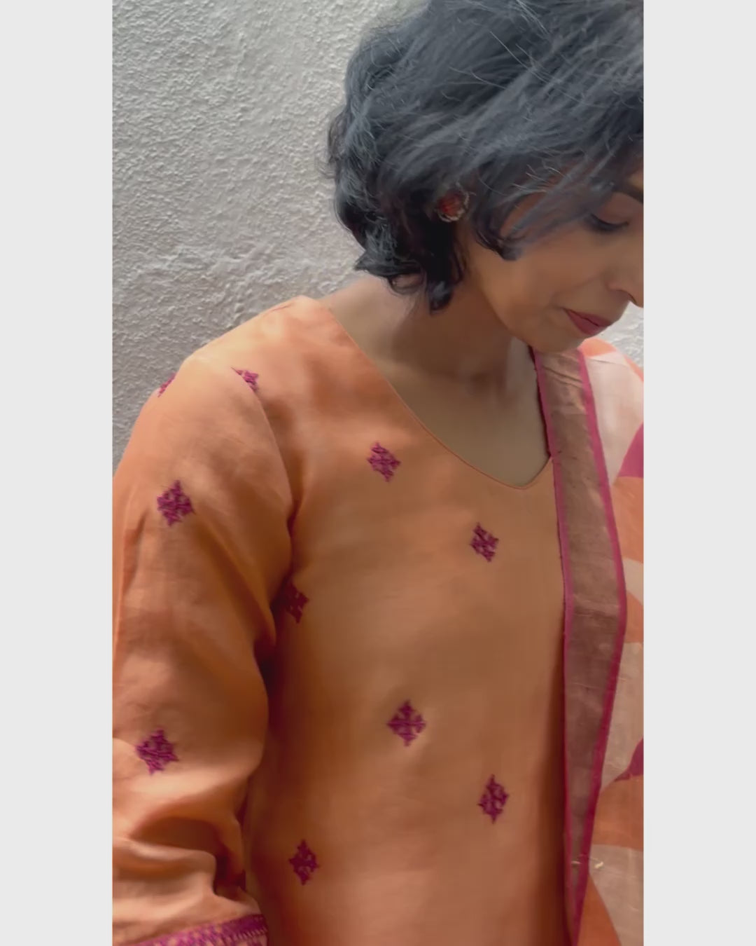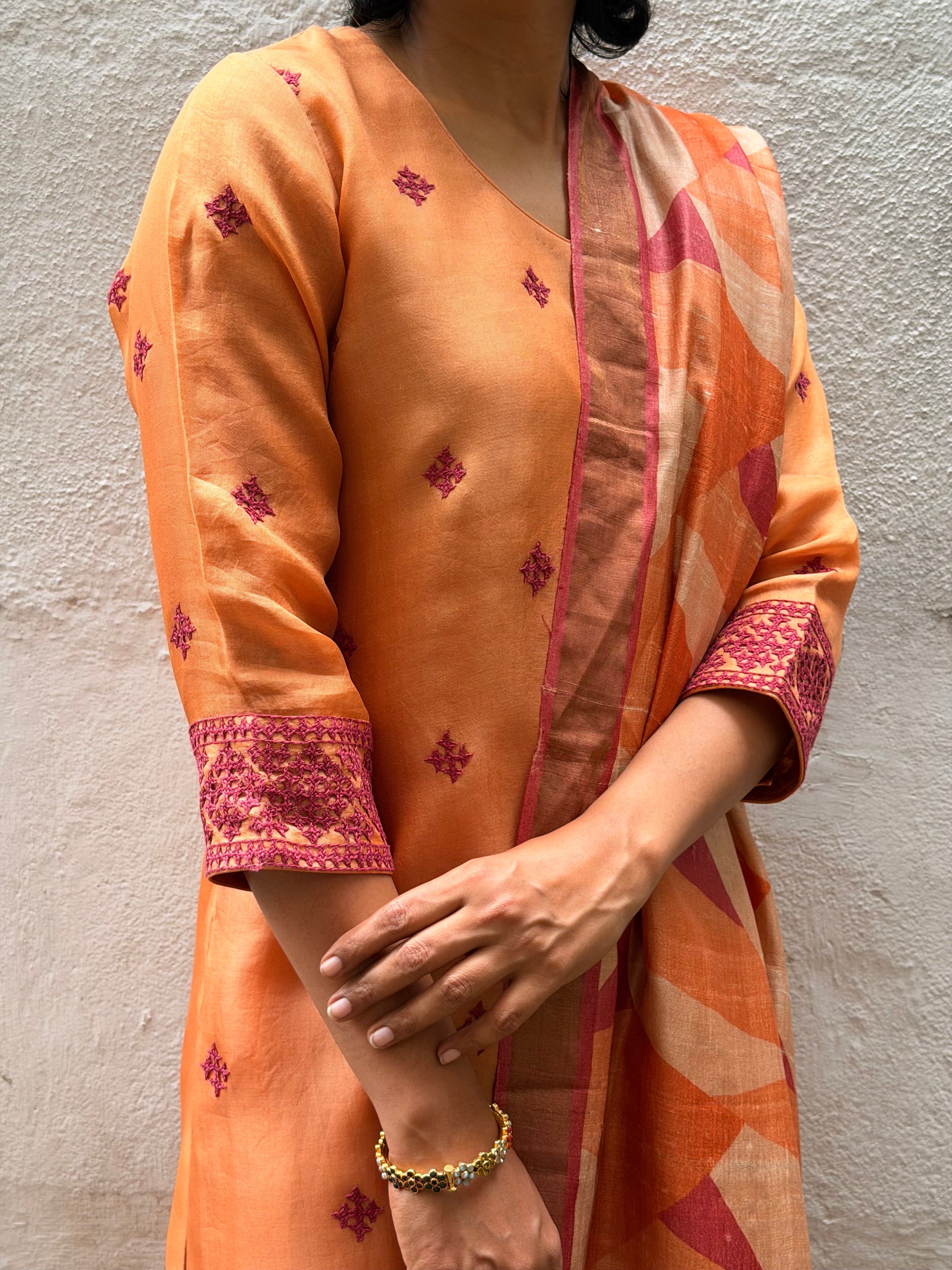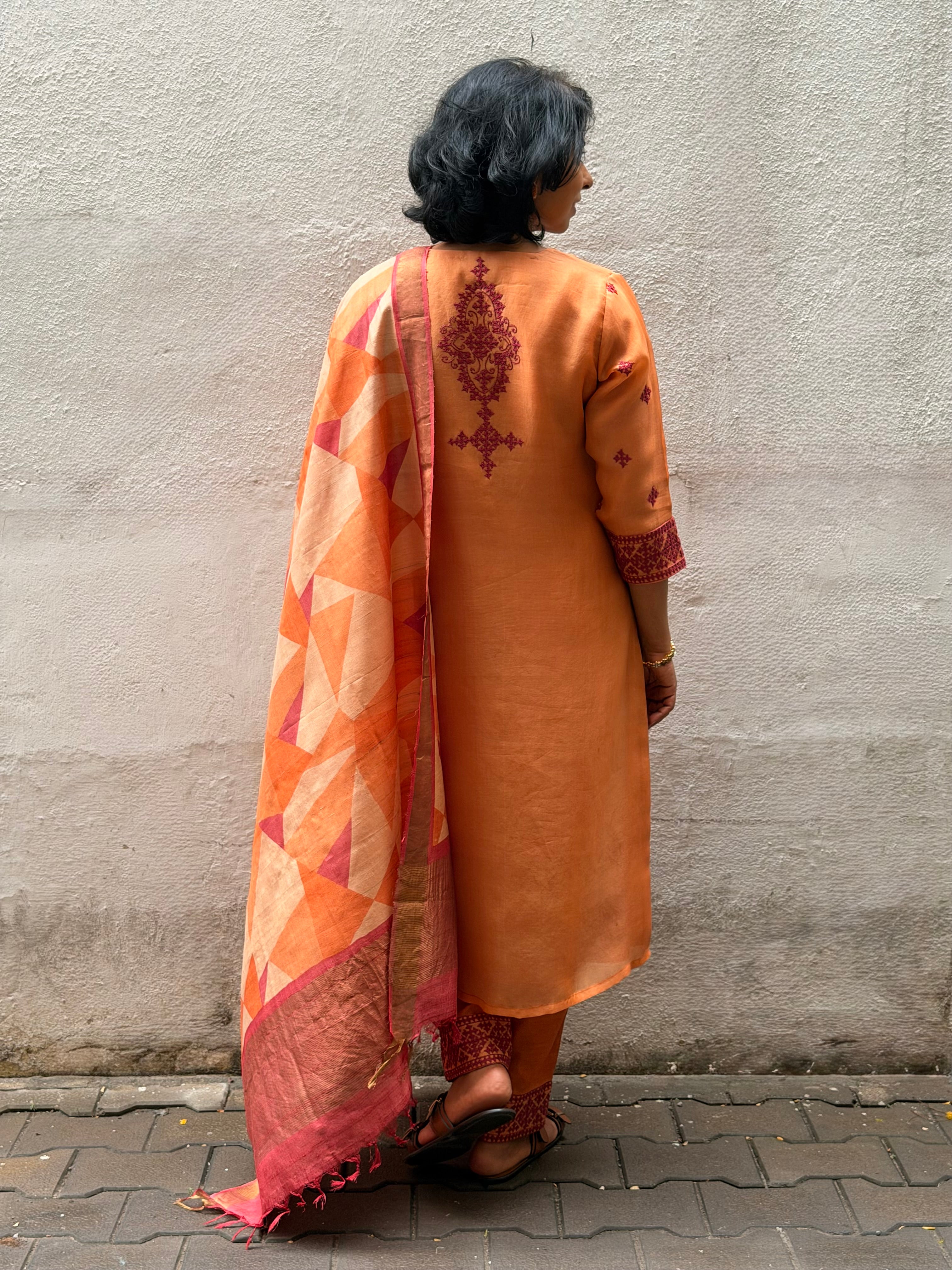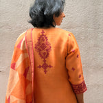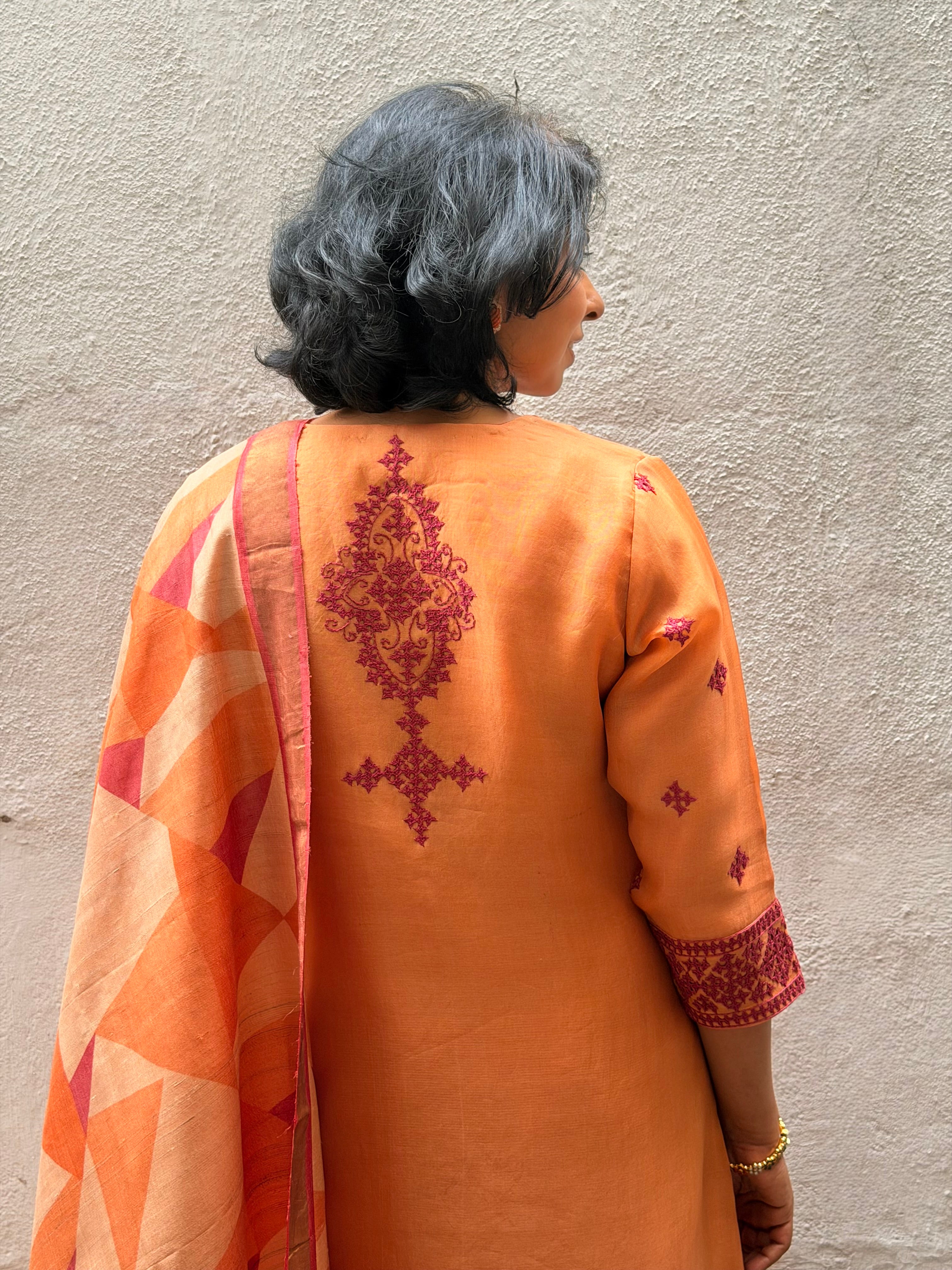 - Organza silk kurta set featuring rich Kutch embroidery in deep red on a coral-orange base.