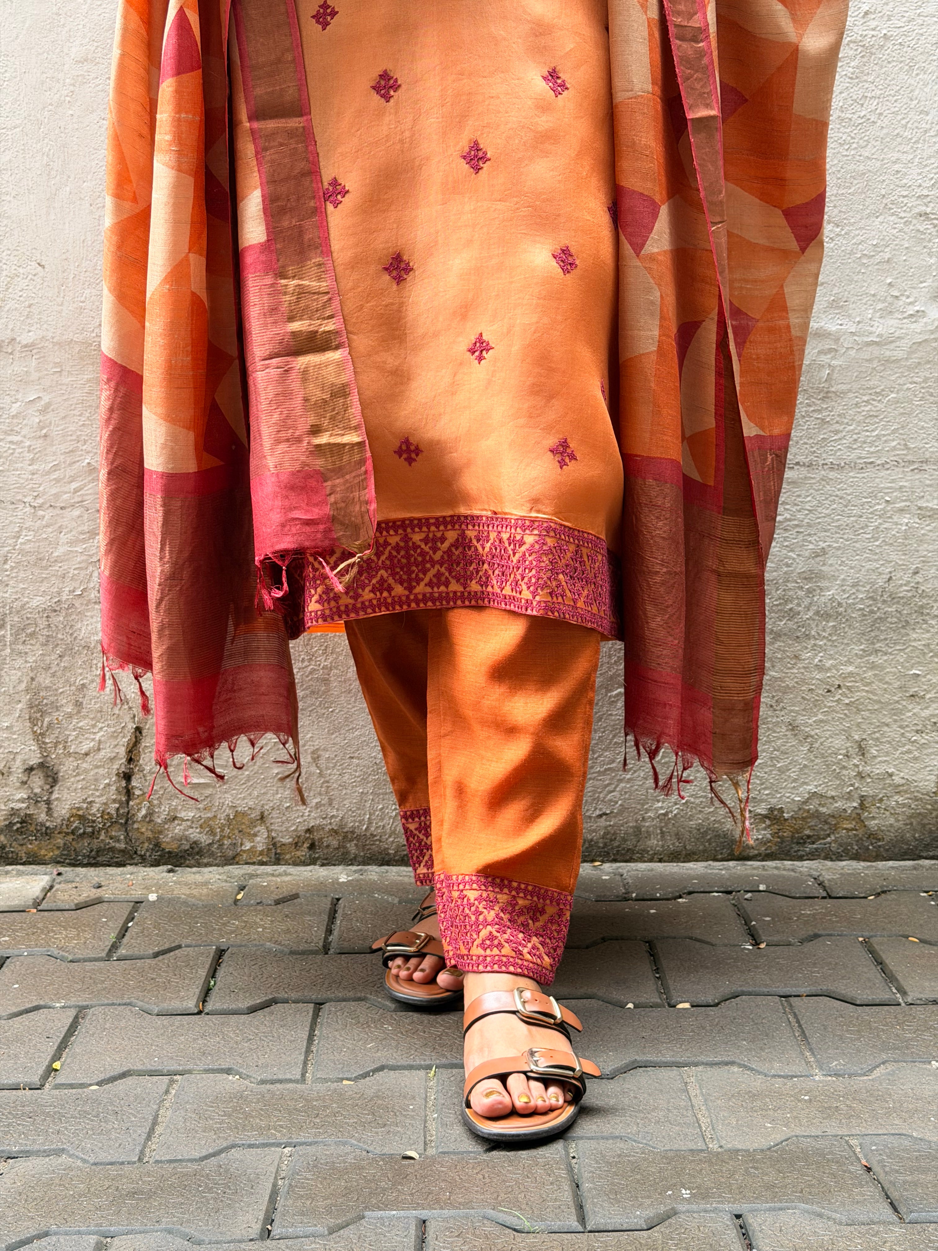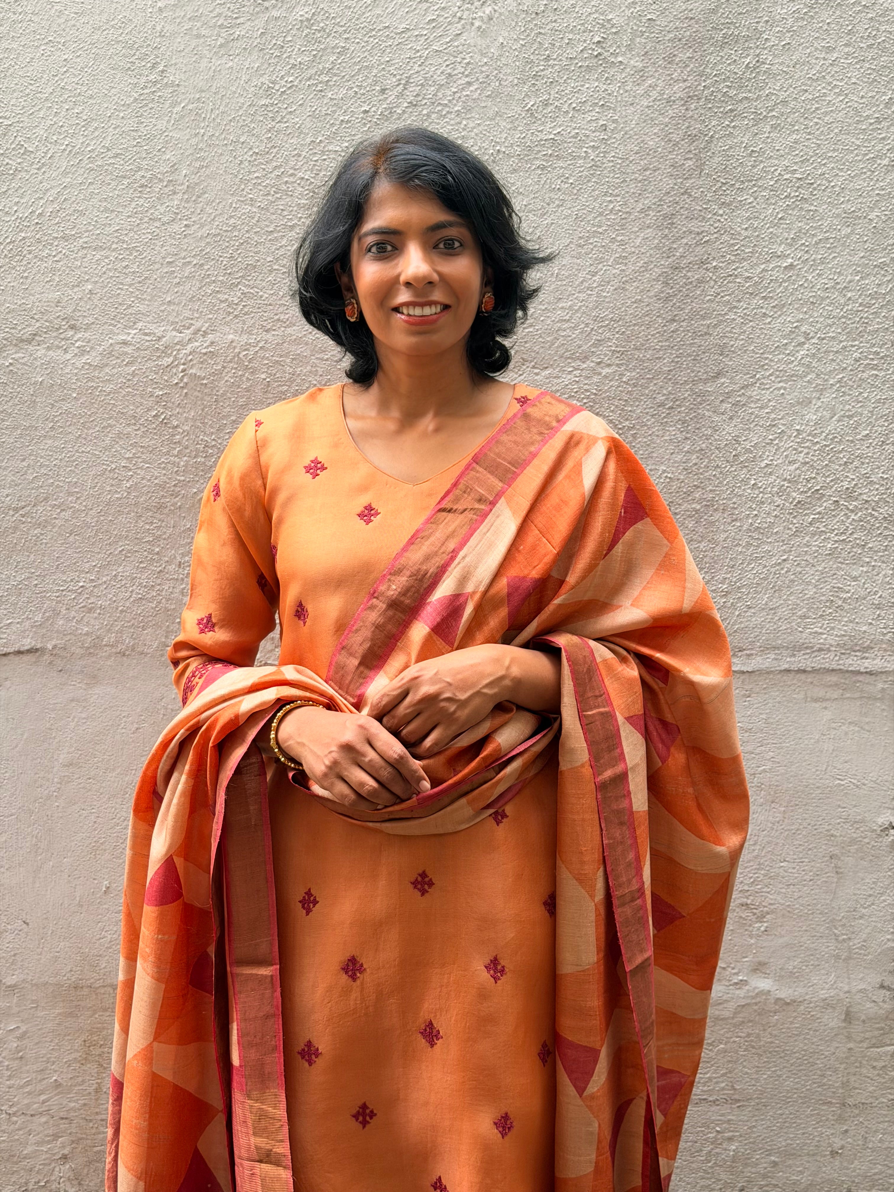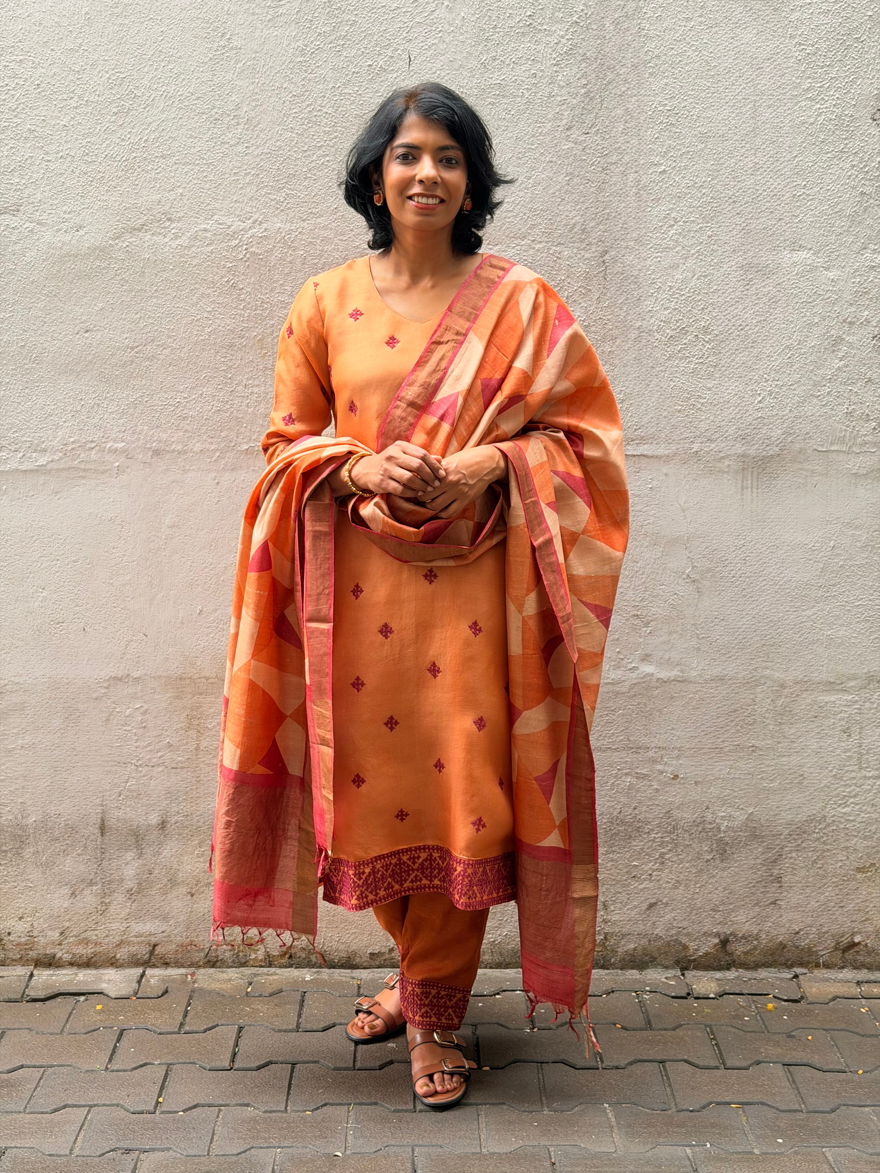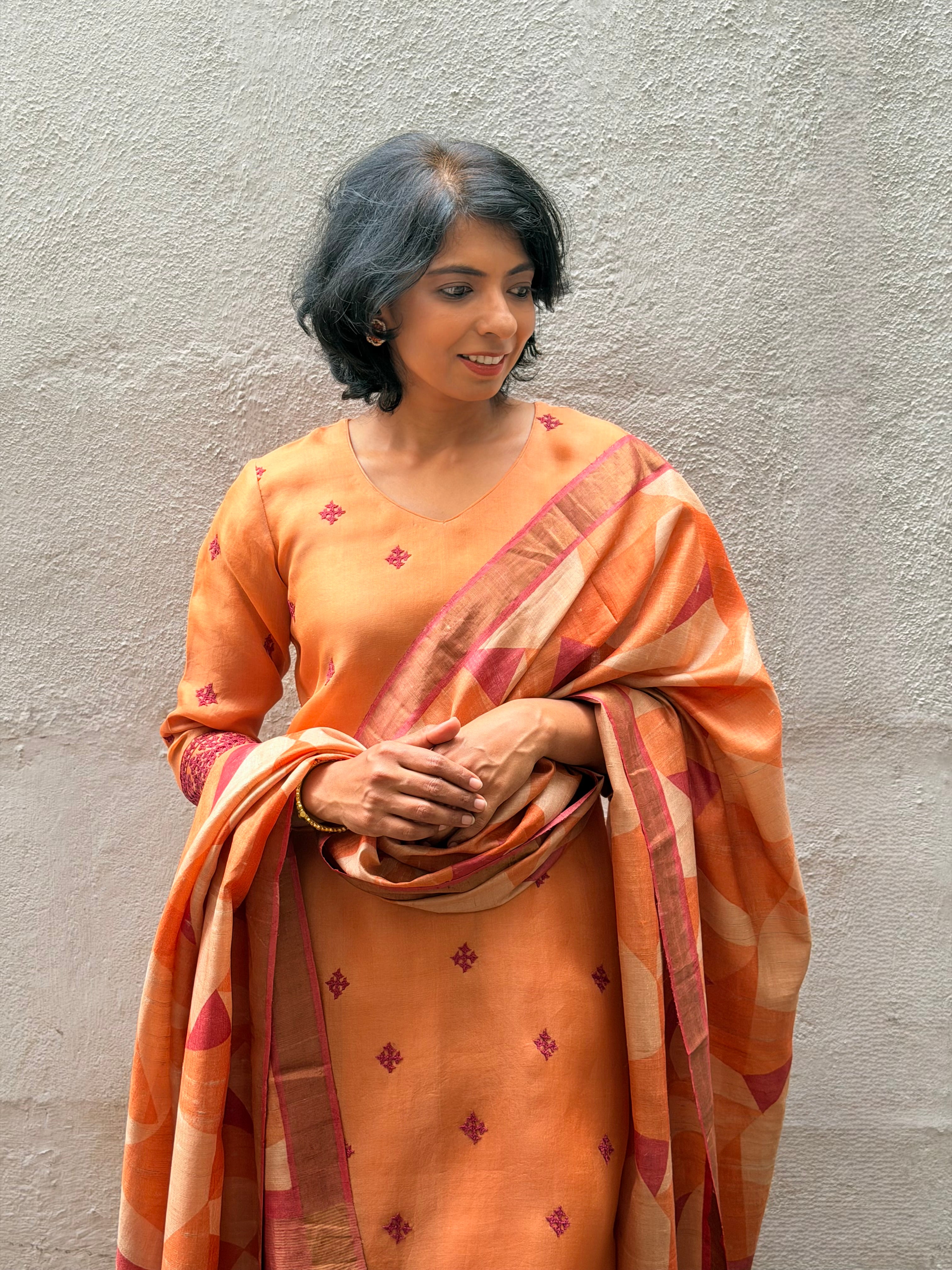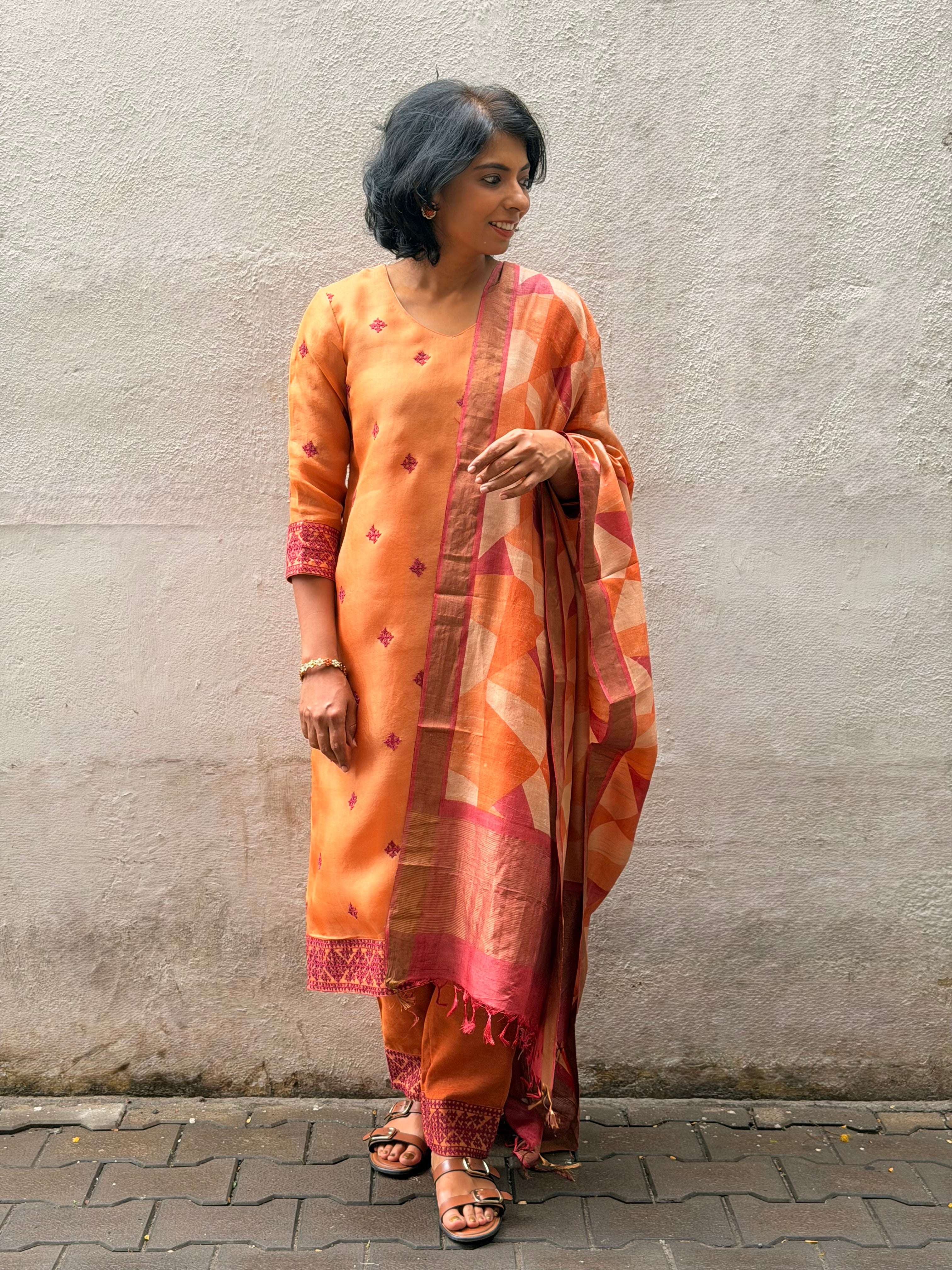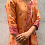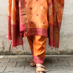 - Organza silk kurta set featuring rich Kutch embroidery in deep red on a coral-orange base.