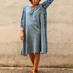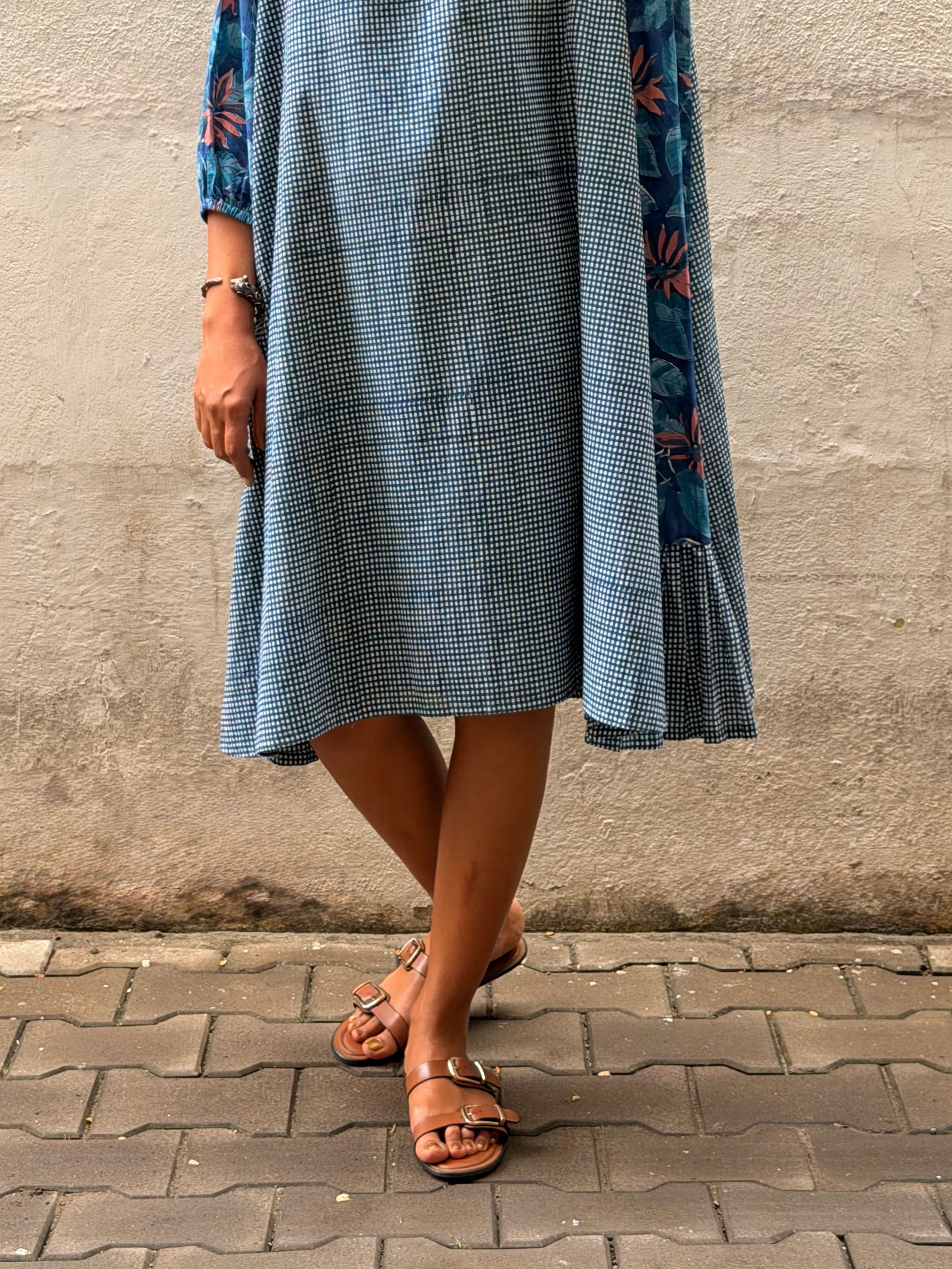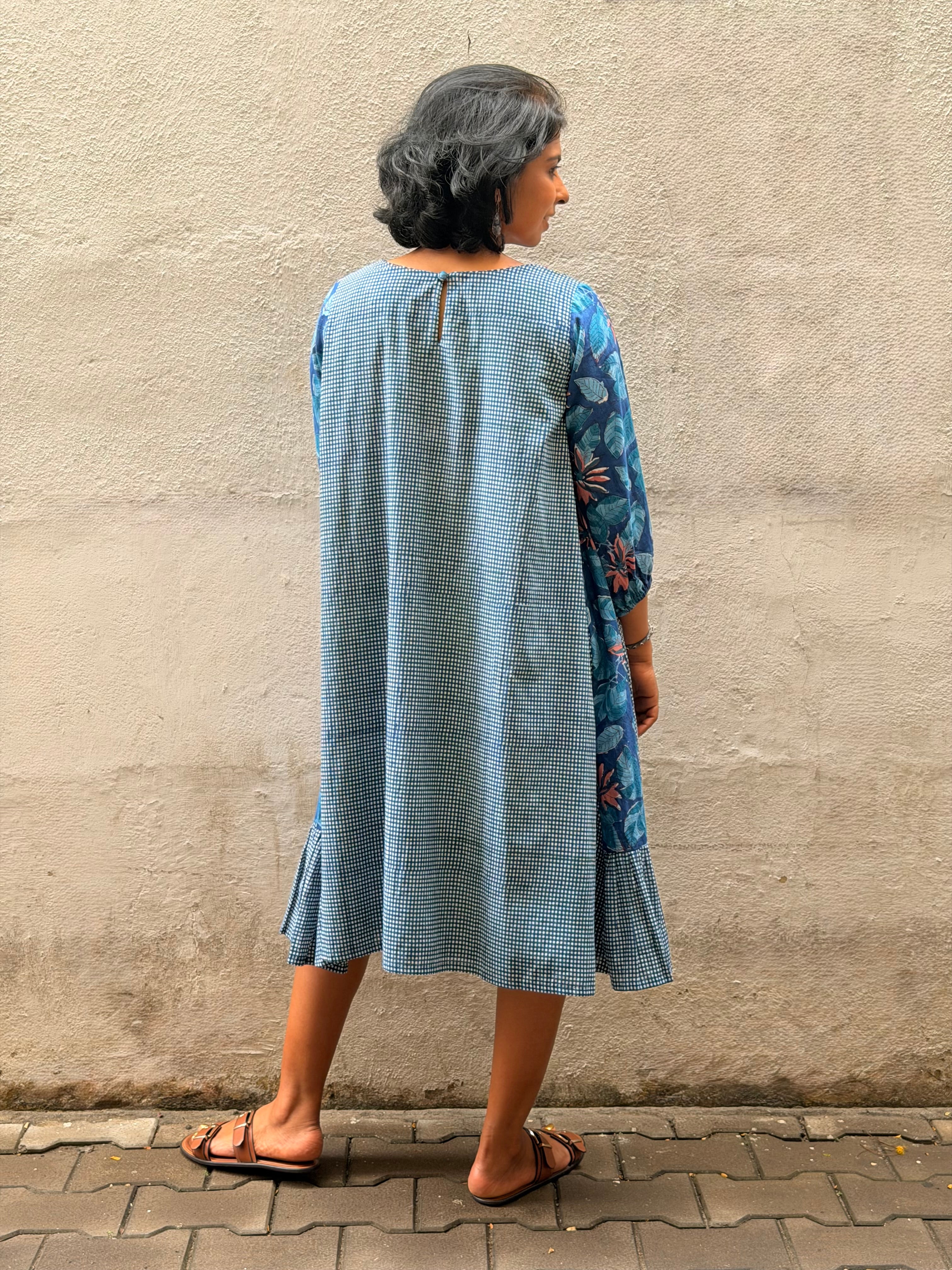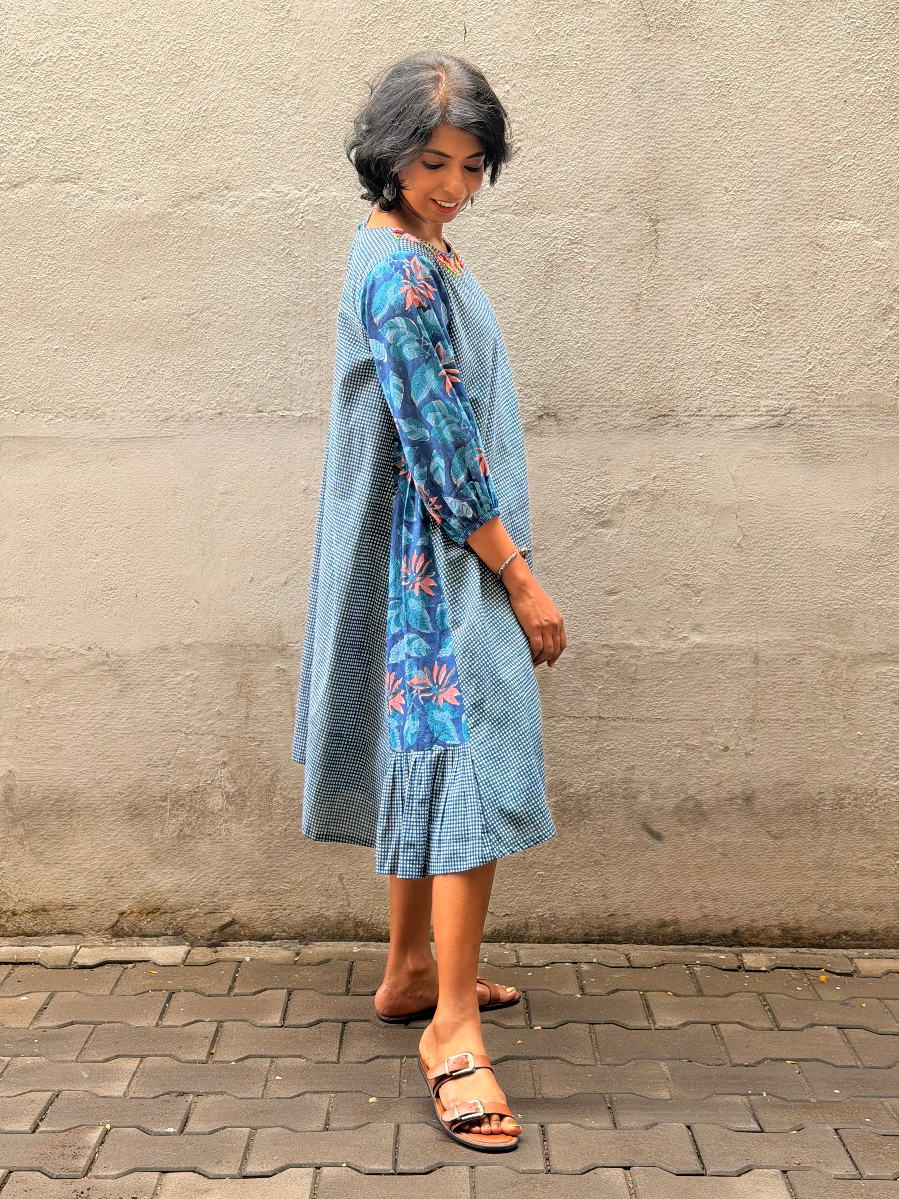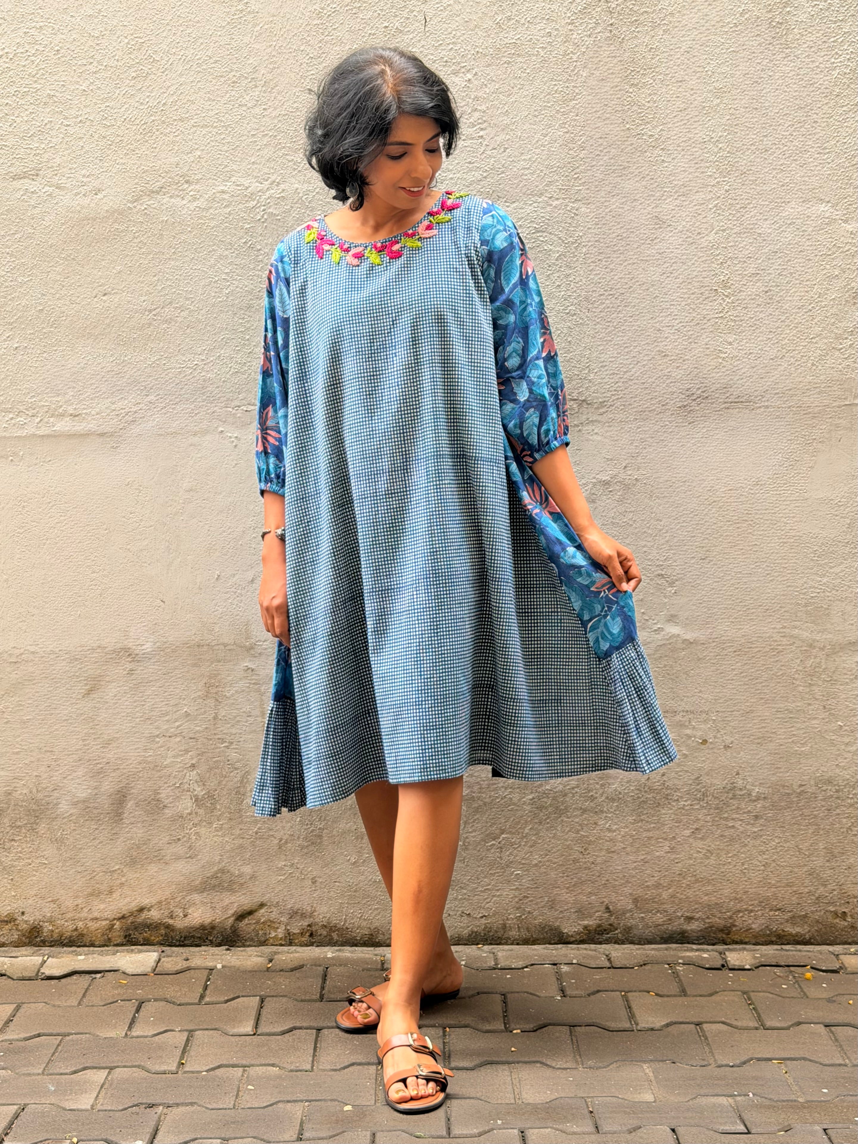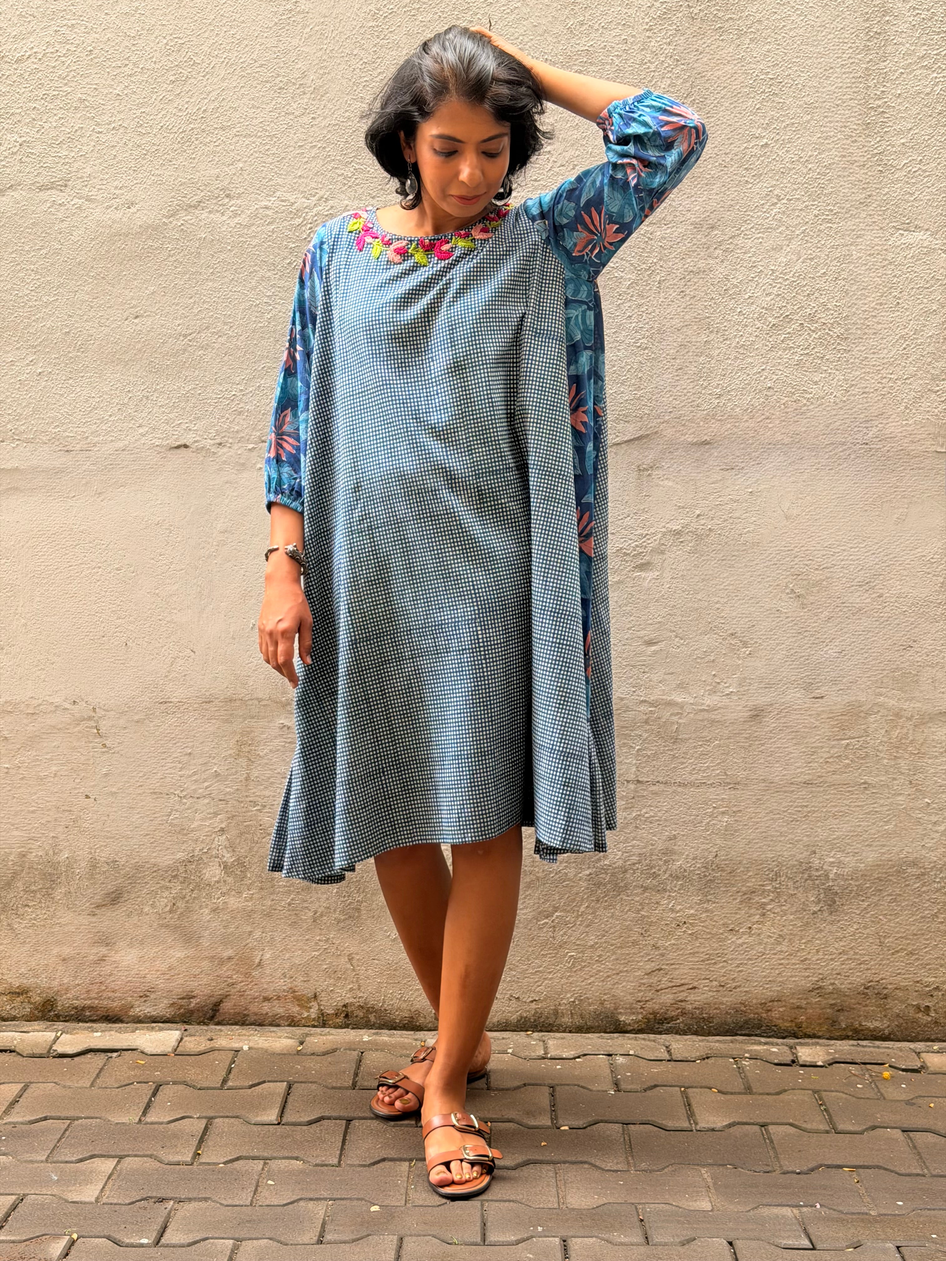 - Cotton one-piece dress crafted in blue and white micro checks.