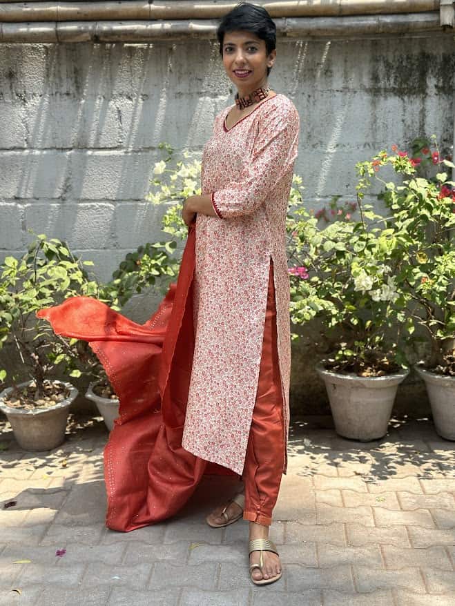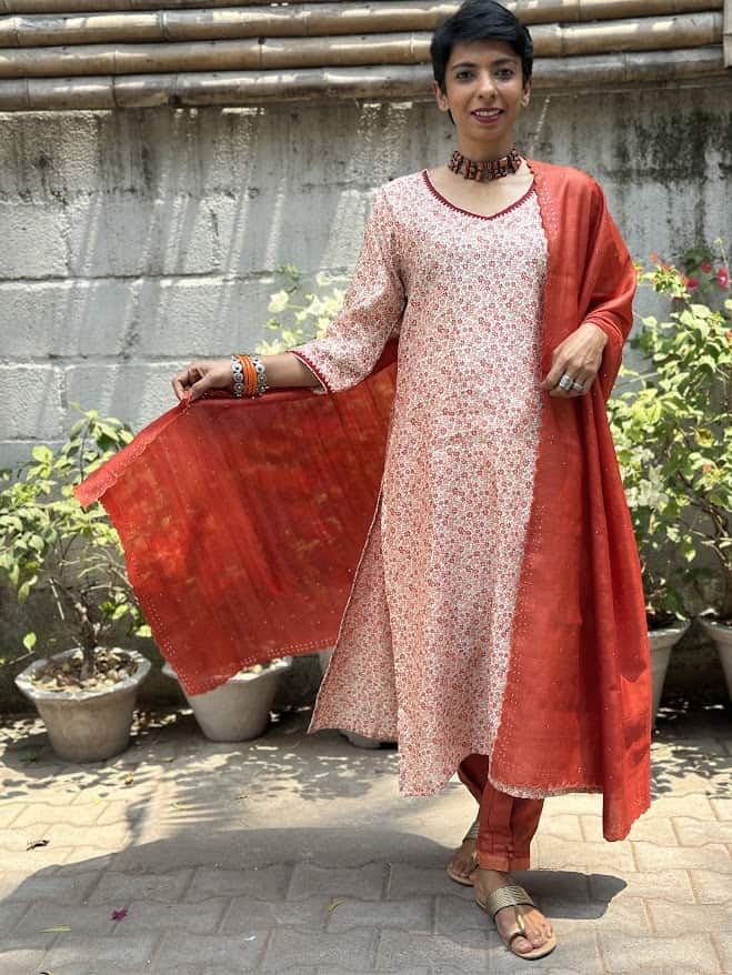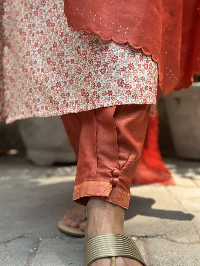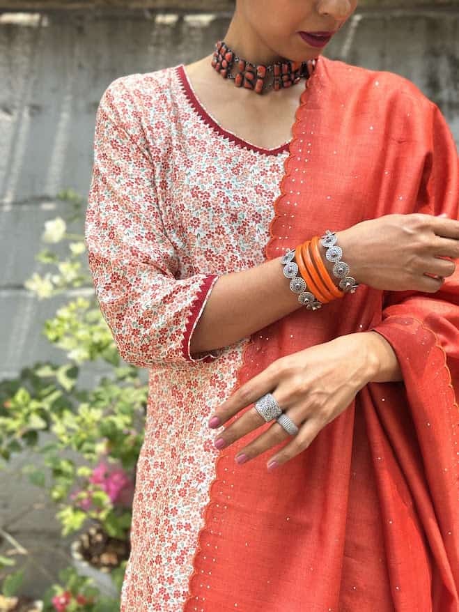 Welcome colours into your spring and summer wardrobe with this cream pure handloom silk kurta with pure zari woven butties and the cutest floral block printing in shades of orange. The lace detailing on the neckline and sleeves , is just the kind of of touch that makes the outfit what you would come to expect from Aavaranaa. Complete the look by pairing it with our chic orange tussar pants and a scalloped dupatta featuring mukaish work, and enjoy that spring in your step.