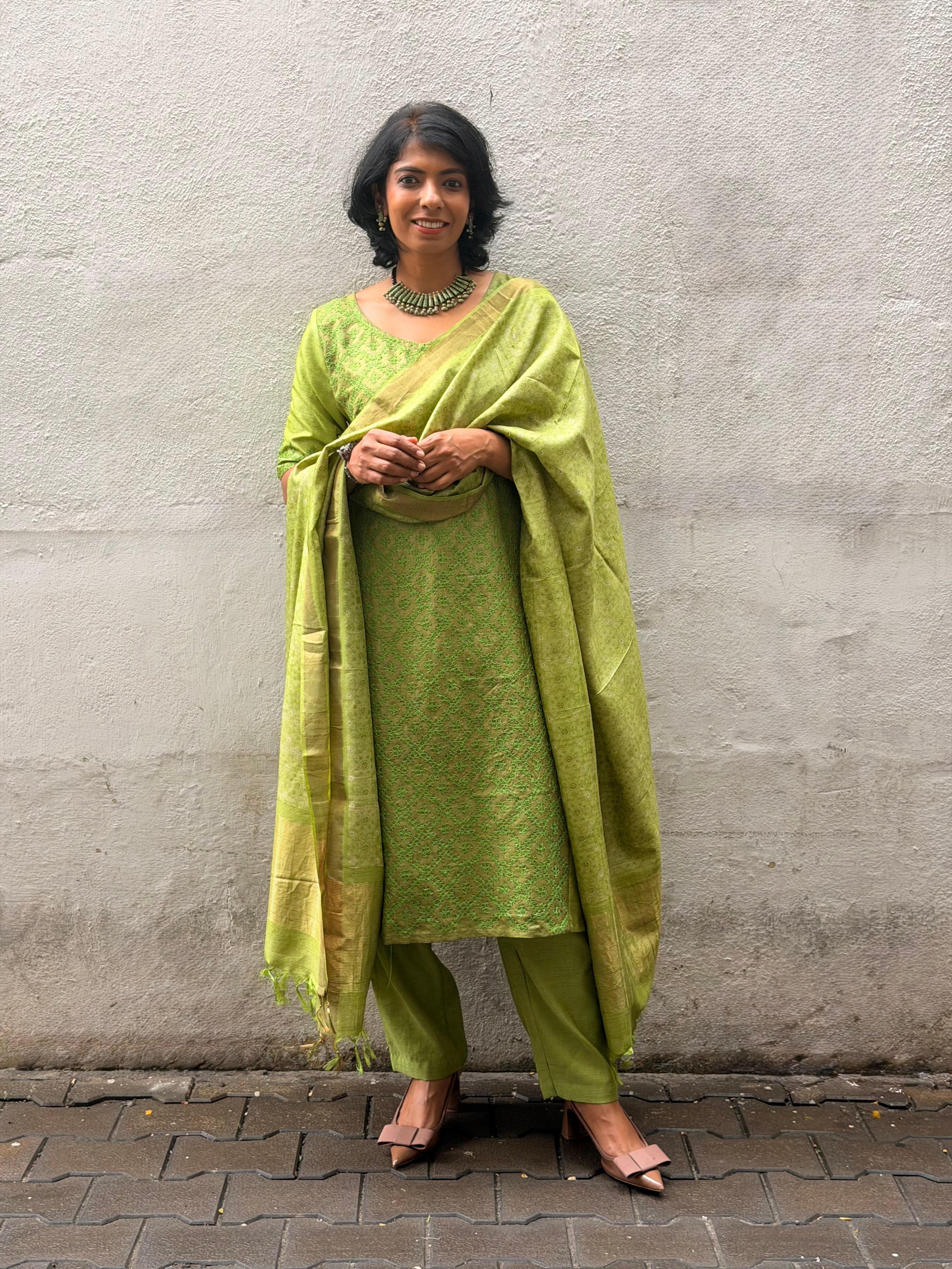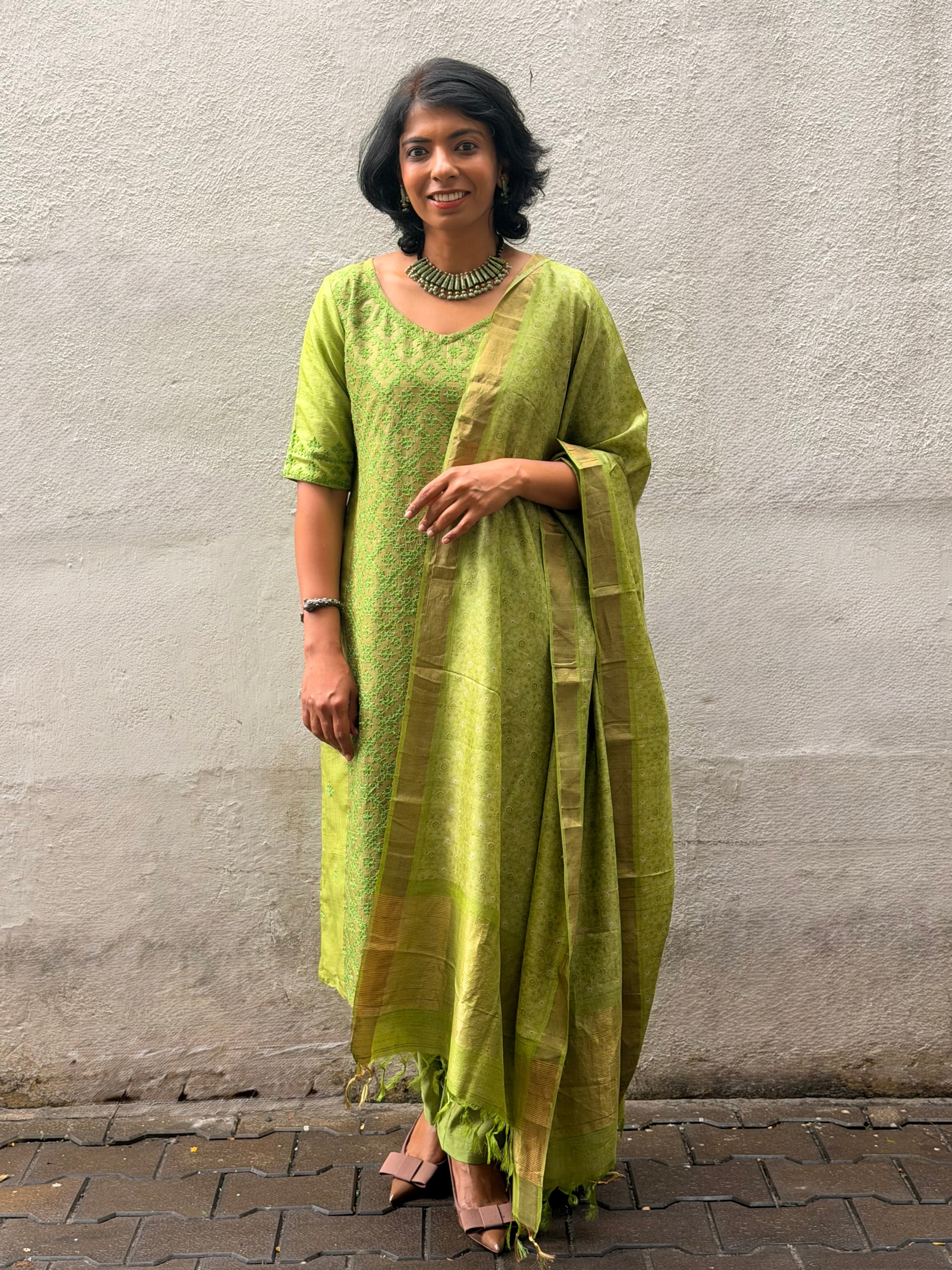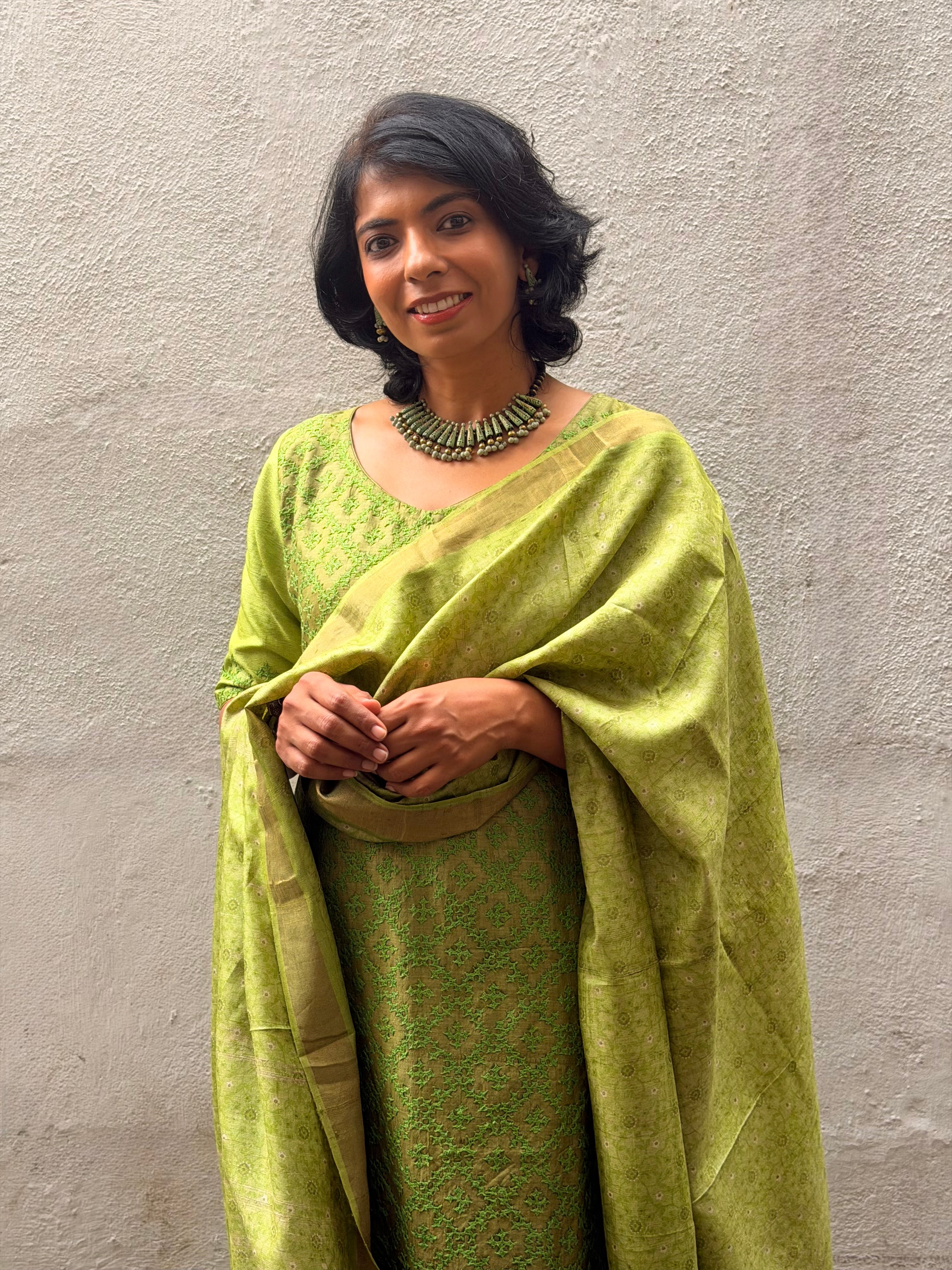 Tussar silk kurta set in elegant green tones with a subtle natural shimmer.