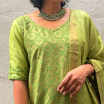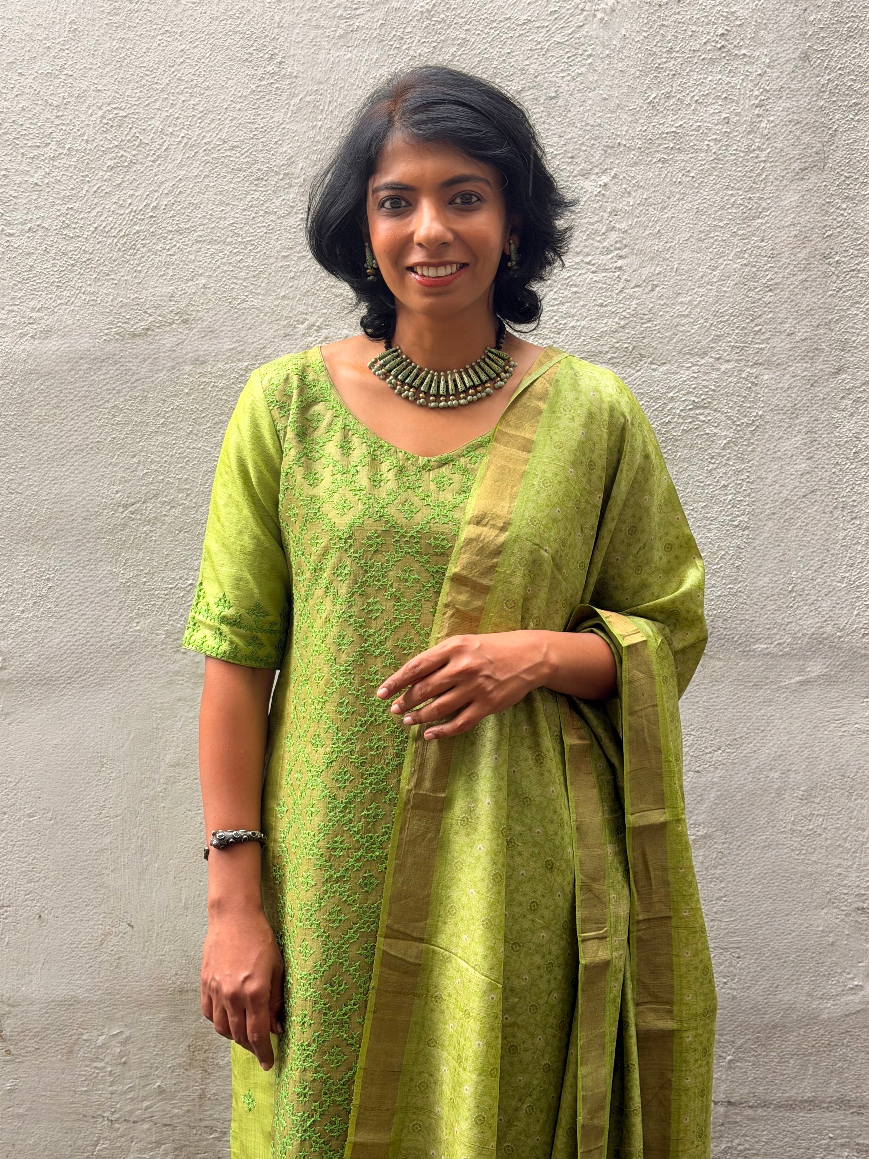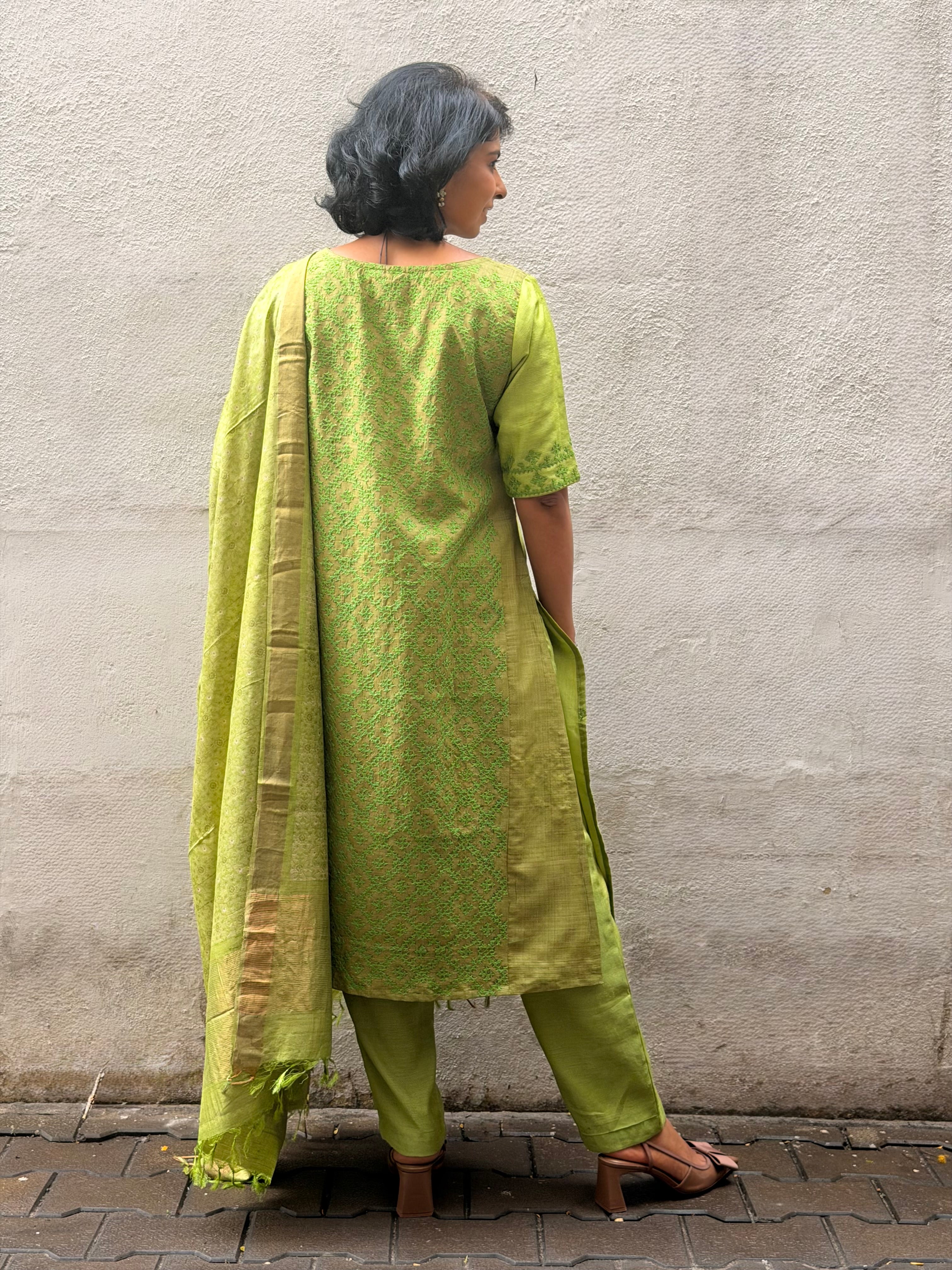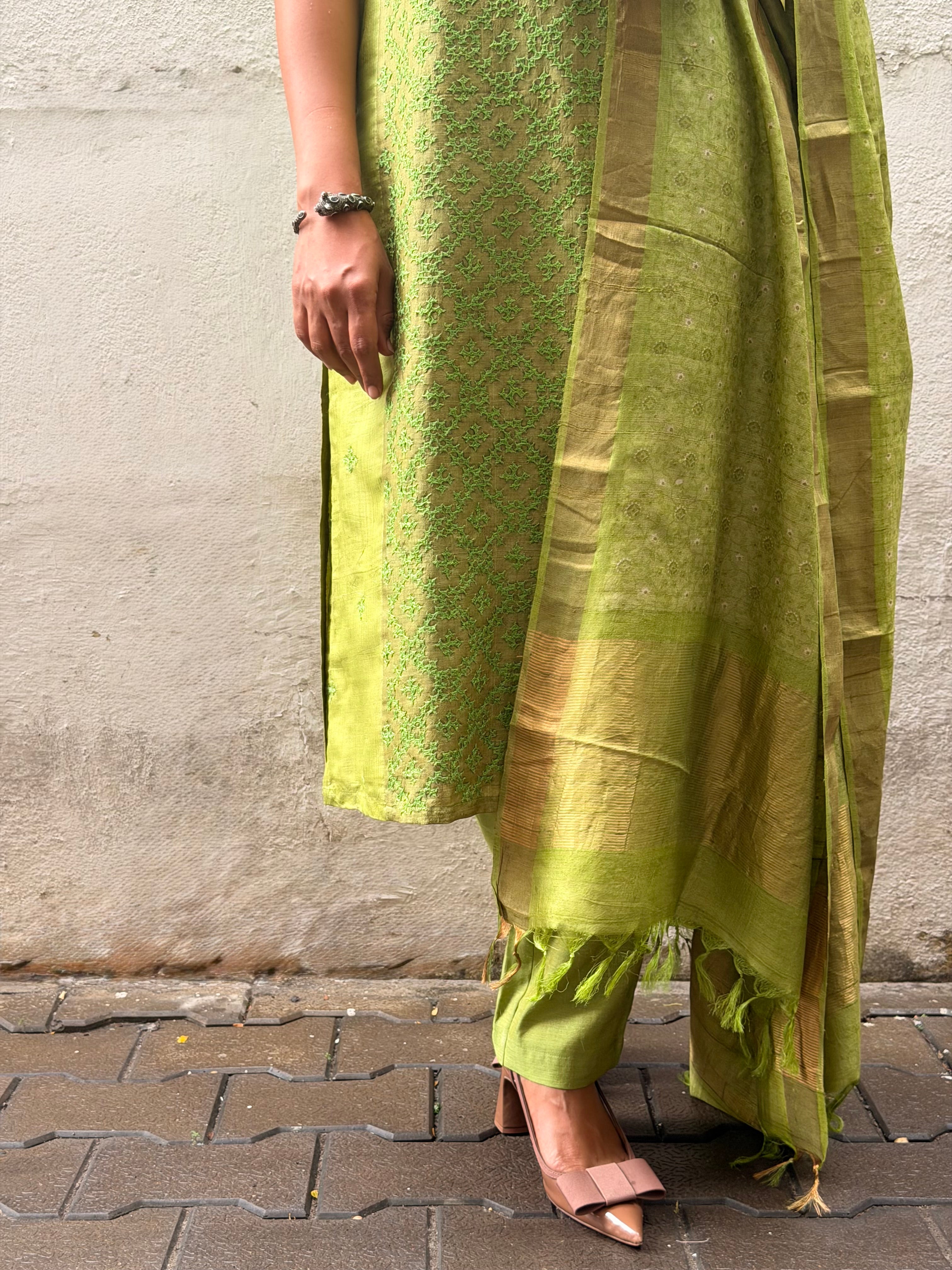 Tussar silk kurta set in elegant green tones with a subtle natural shimmer.
