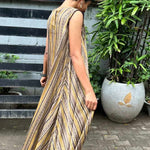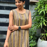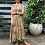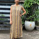 We consider this ensemble a one-piece wonder. A full-length sleeveless dress in brown and mustard, featuring hand-printed ajrakh patterns. The cut is designed to be both comfortable and stylish, and needless to say, universally flattering. It opens in the back and has a soft cotton slip. Now just plan that vacation you have always wanted to take because this outfit deserves it .With an open back and a soft cotton slip, this outfit is the perfect excuse to plan that vacation you've always wanted – it truly deserves it. Model is wearing an XS