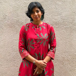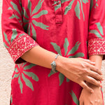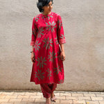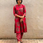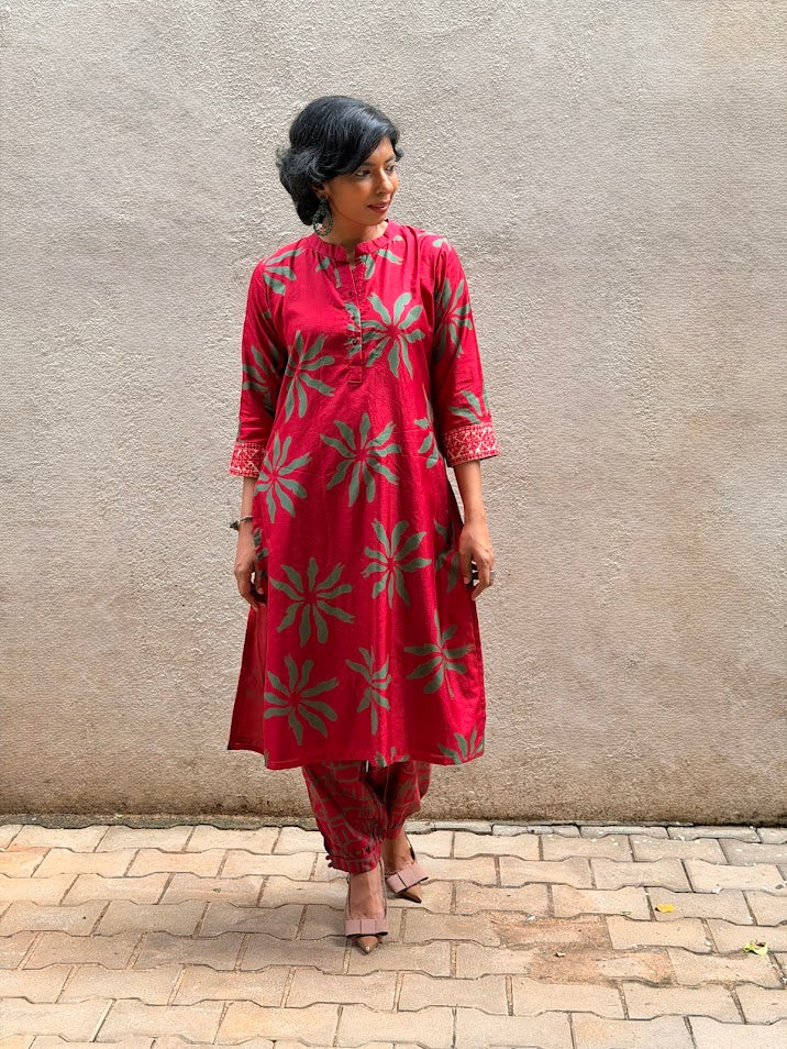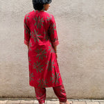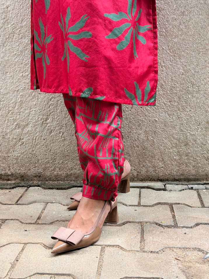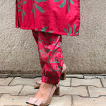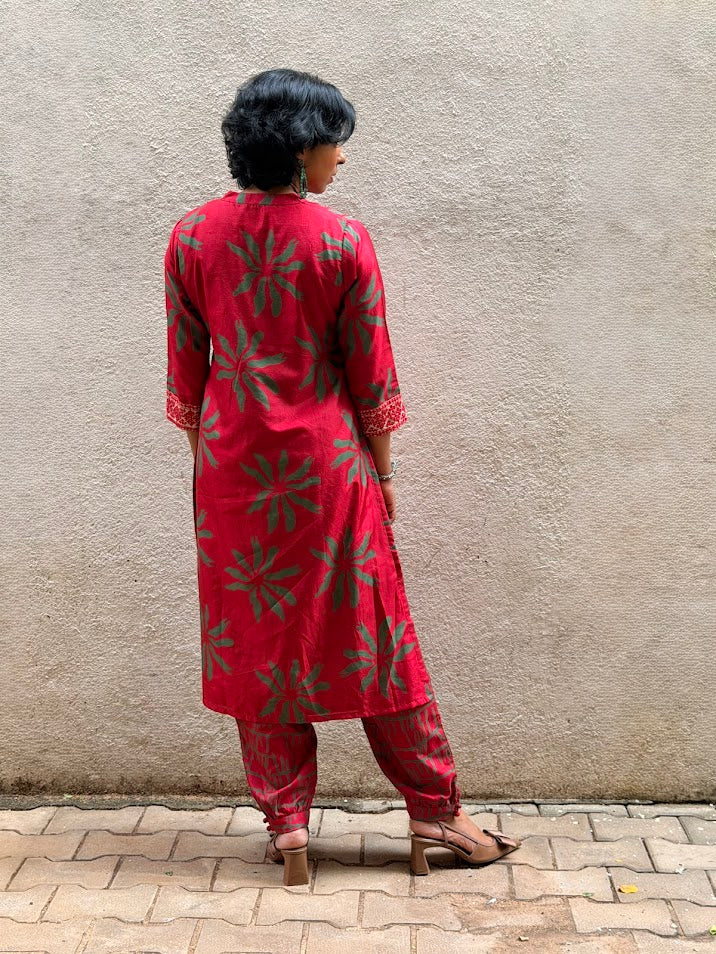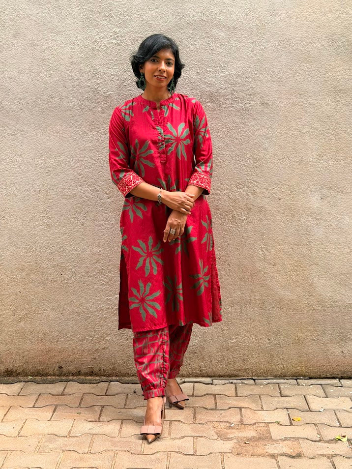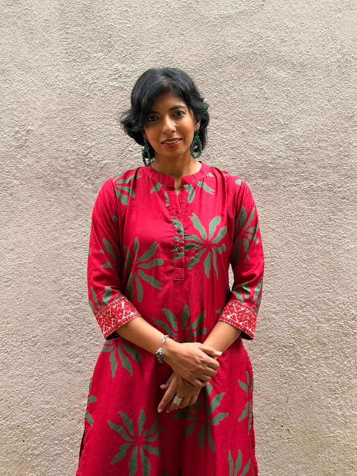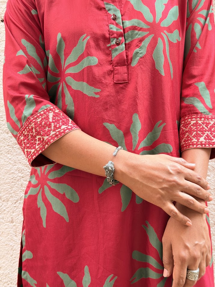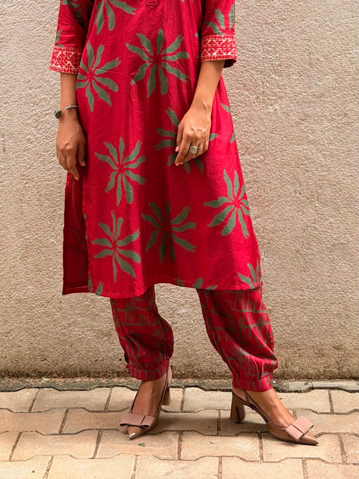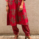 - Red silk kurta with green floral prints for a bold and festive colour‑story.