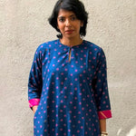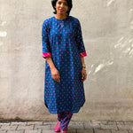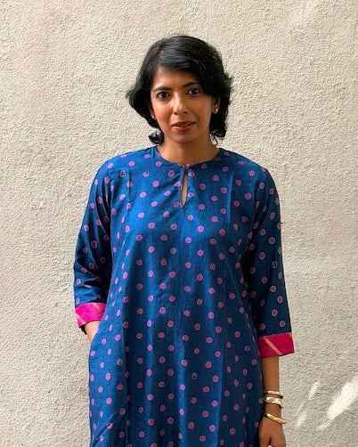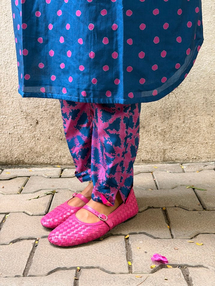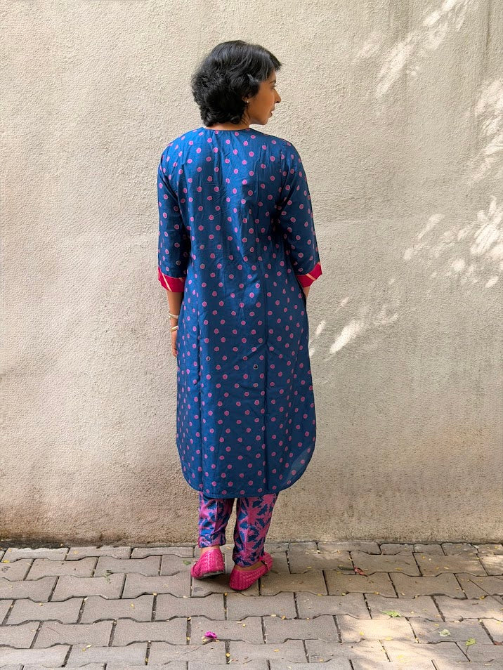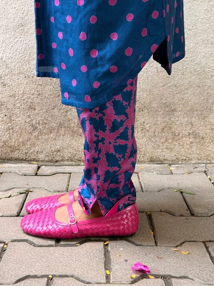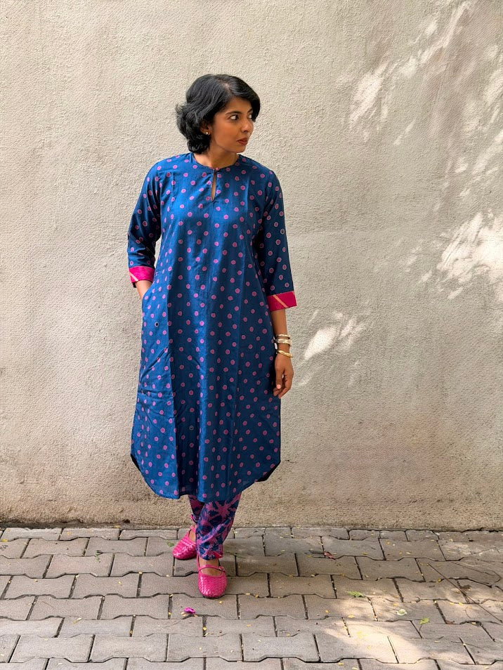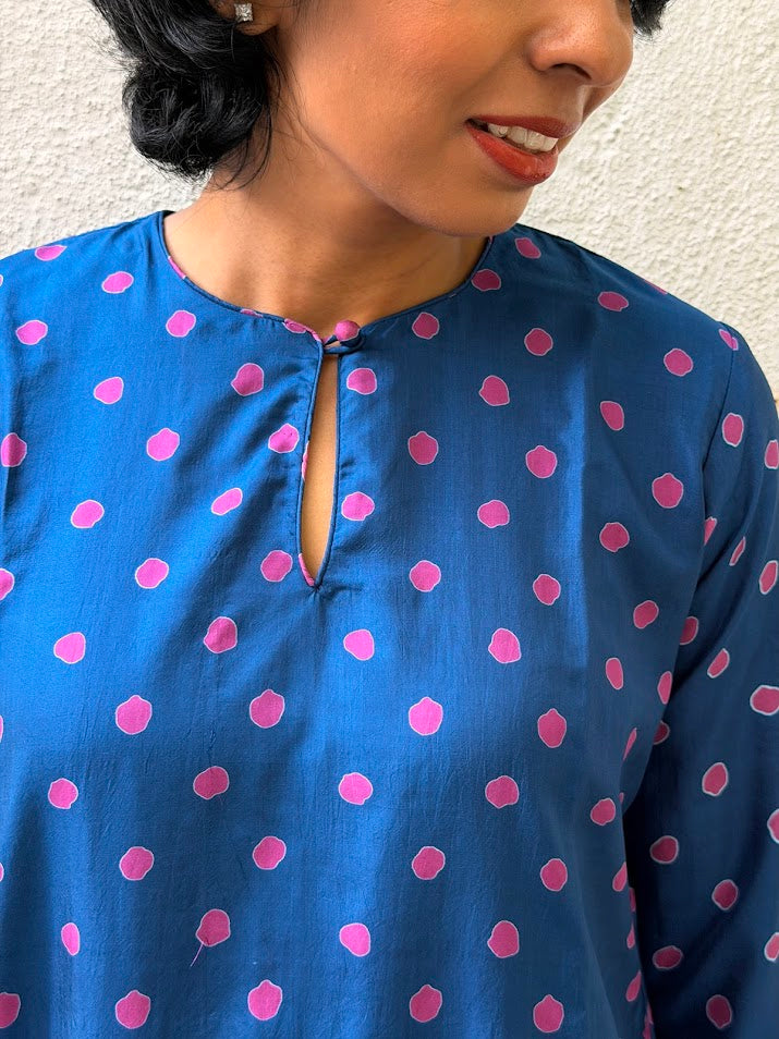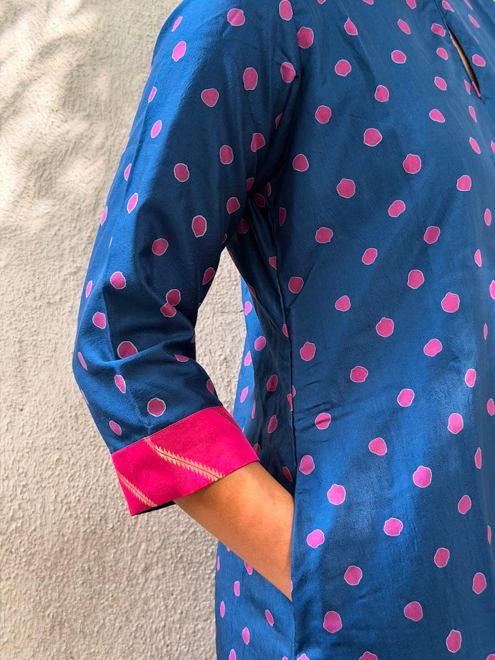 Premium blue silk fabric with pink dot motif throughout for a refined yet vibrant look.