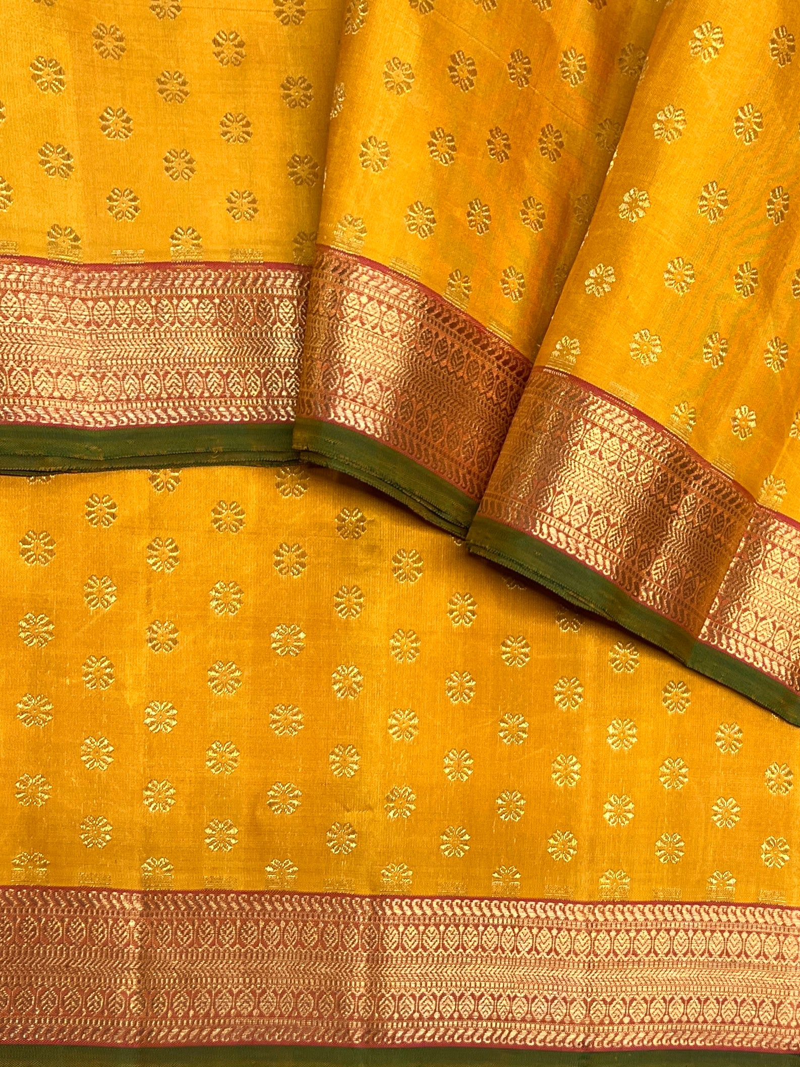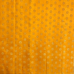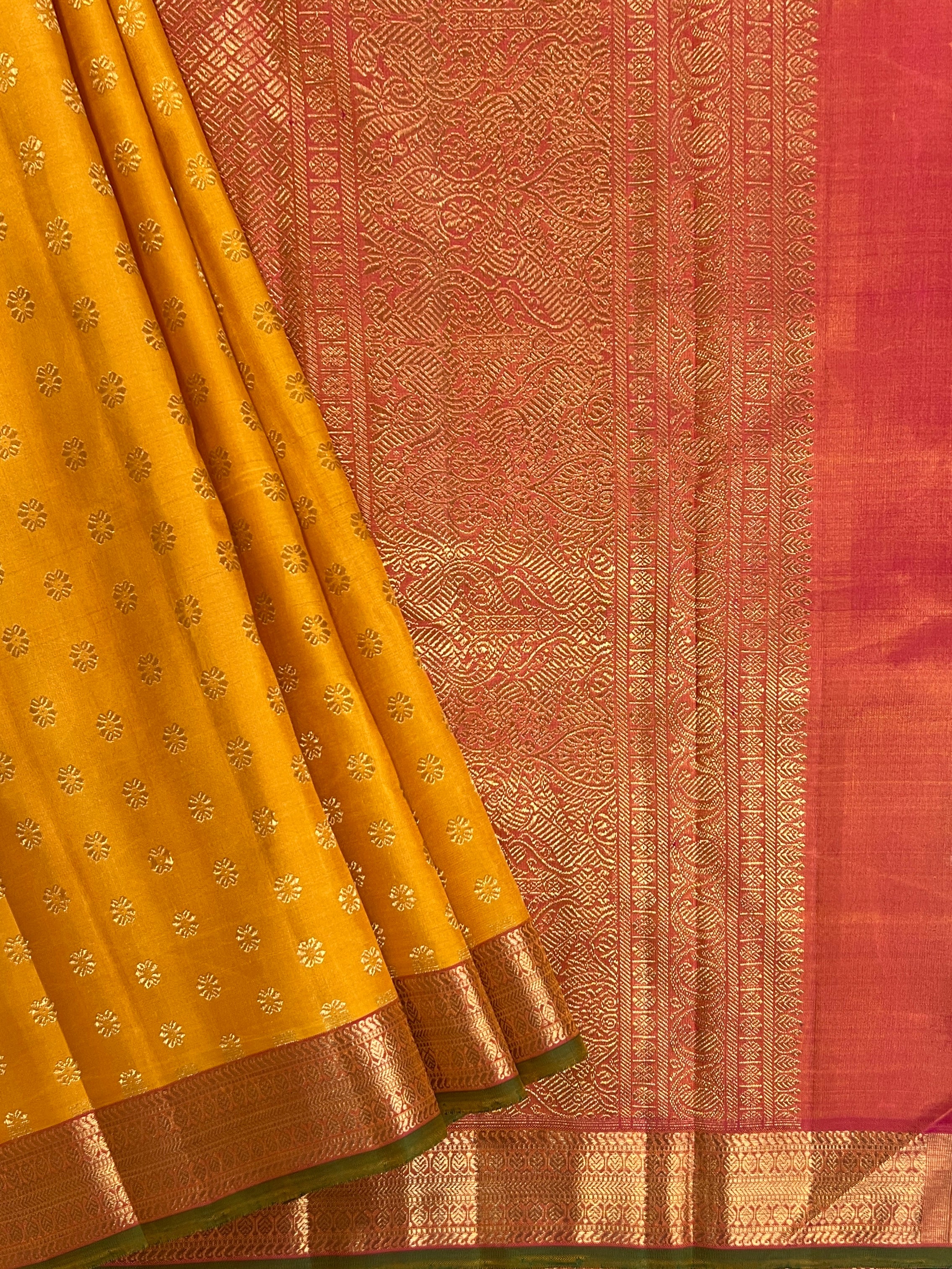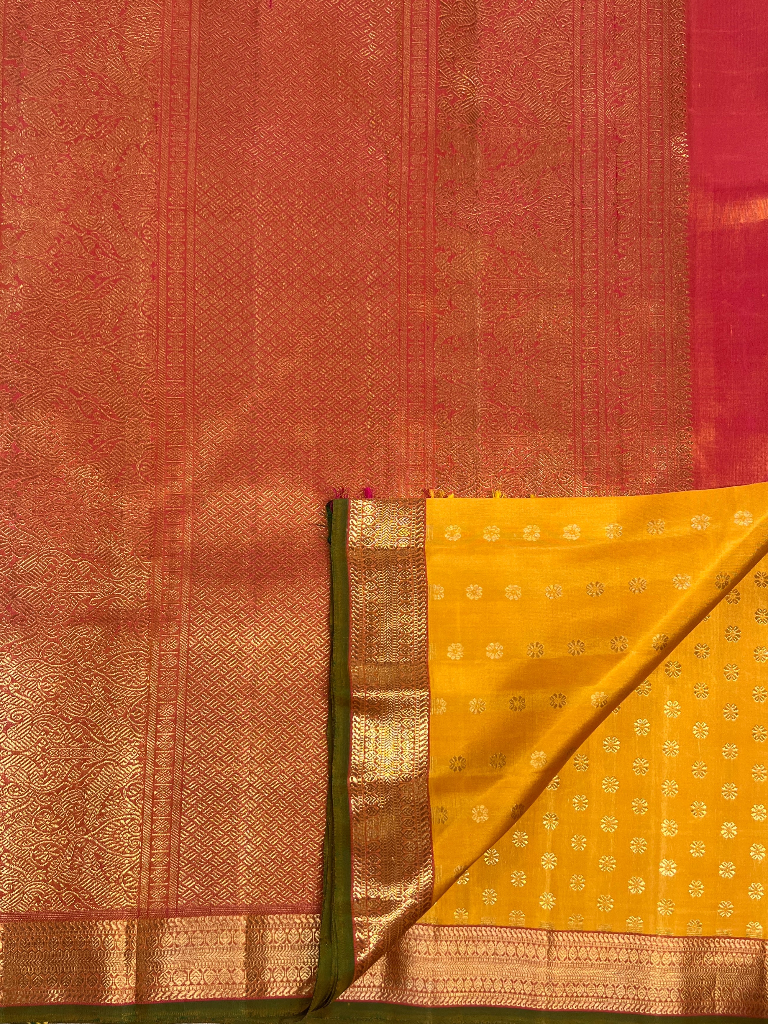 - An auspicious yellow shade contrasting with peachy pink and green selvage.