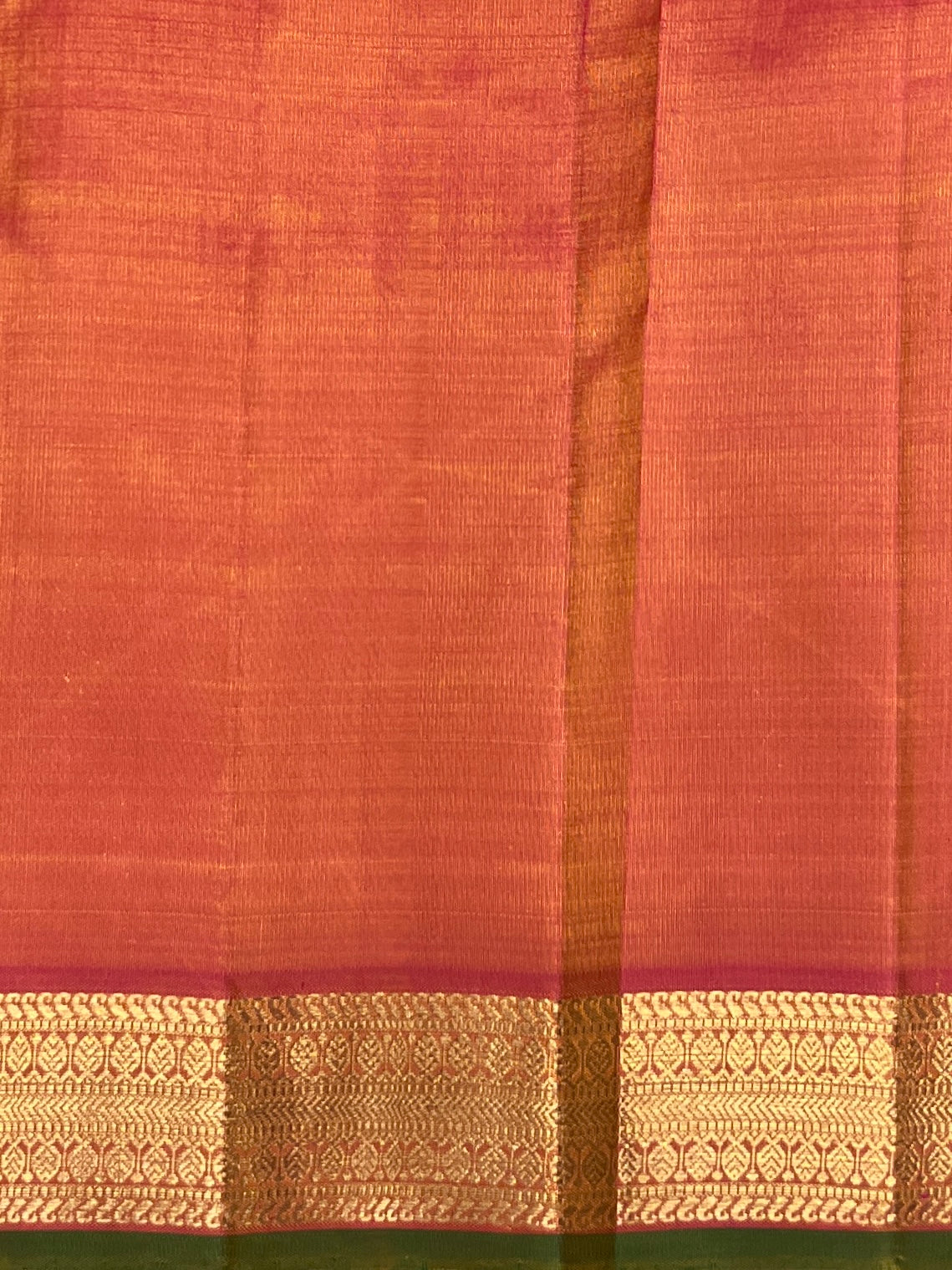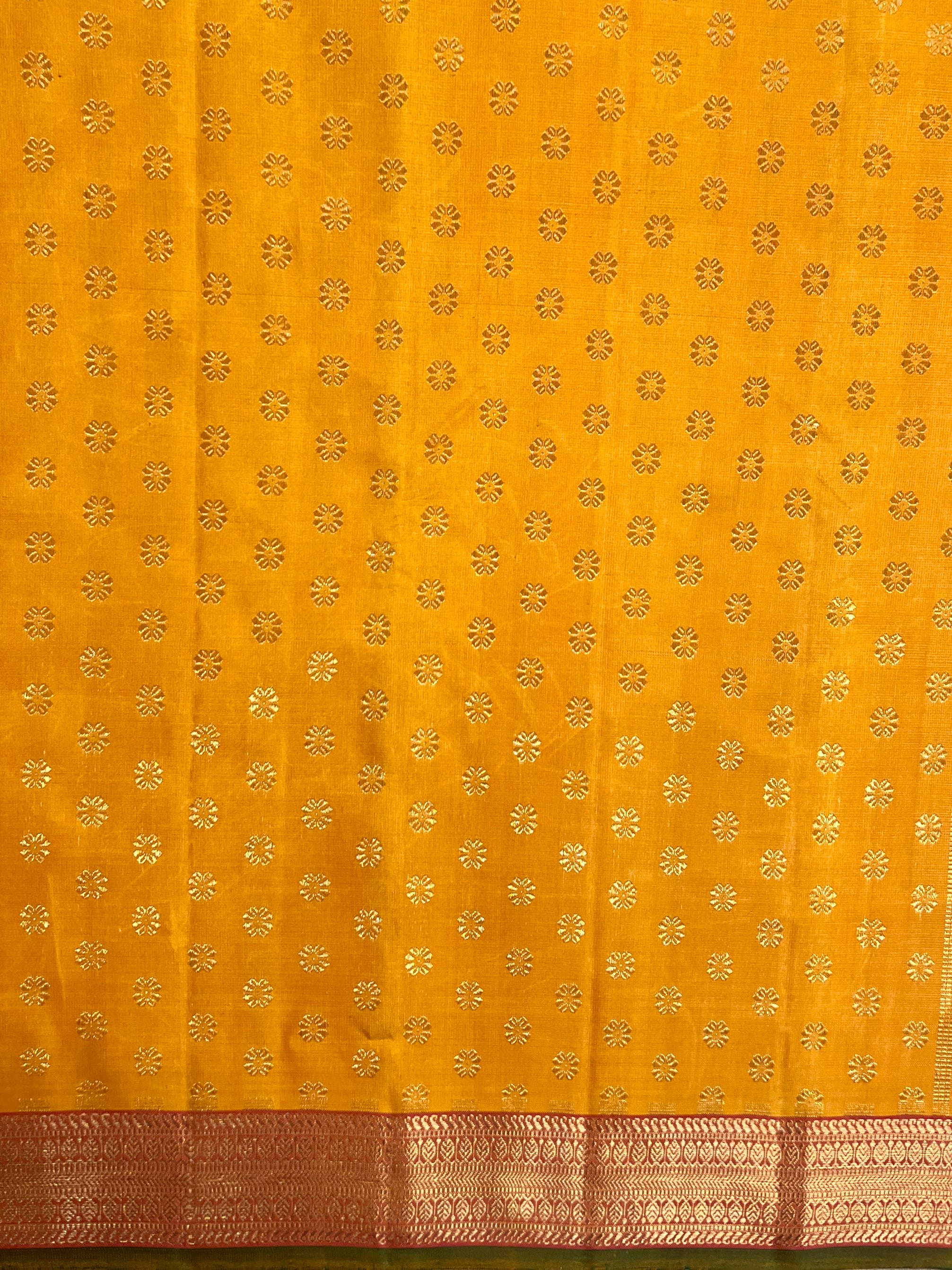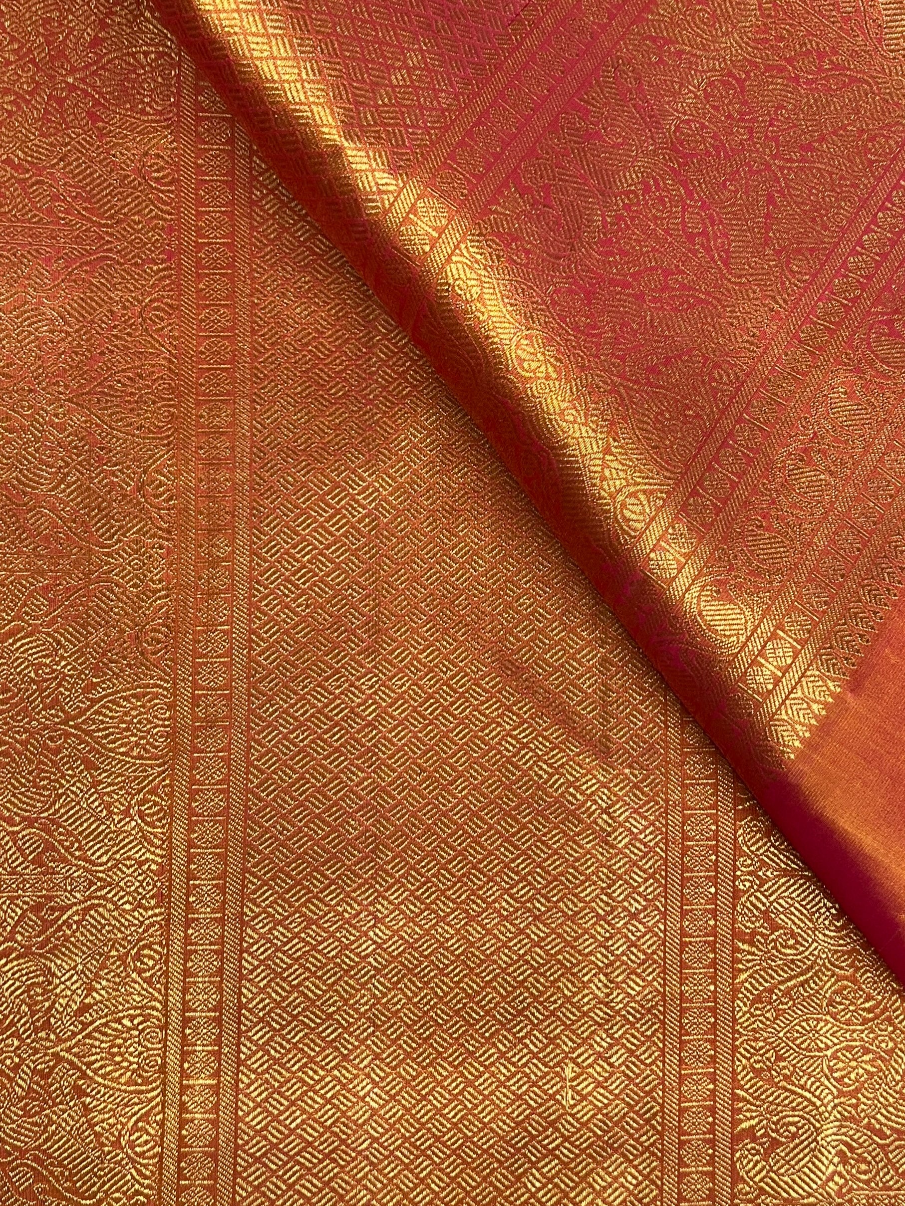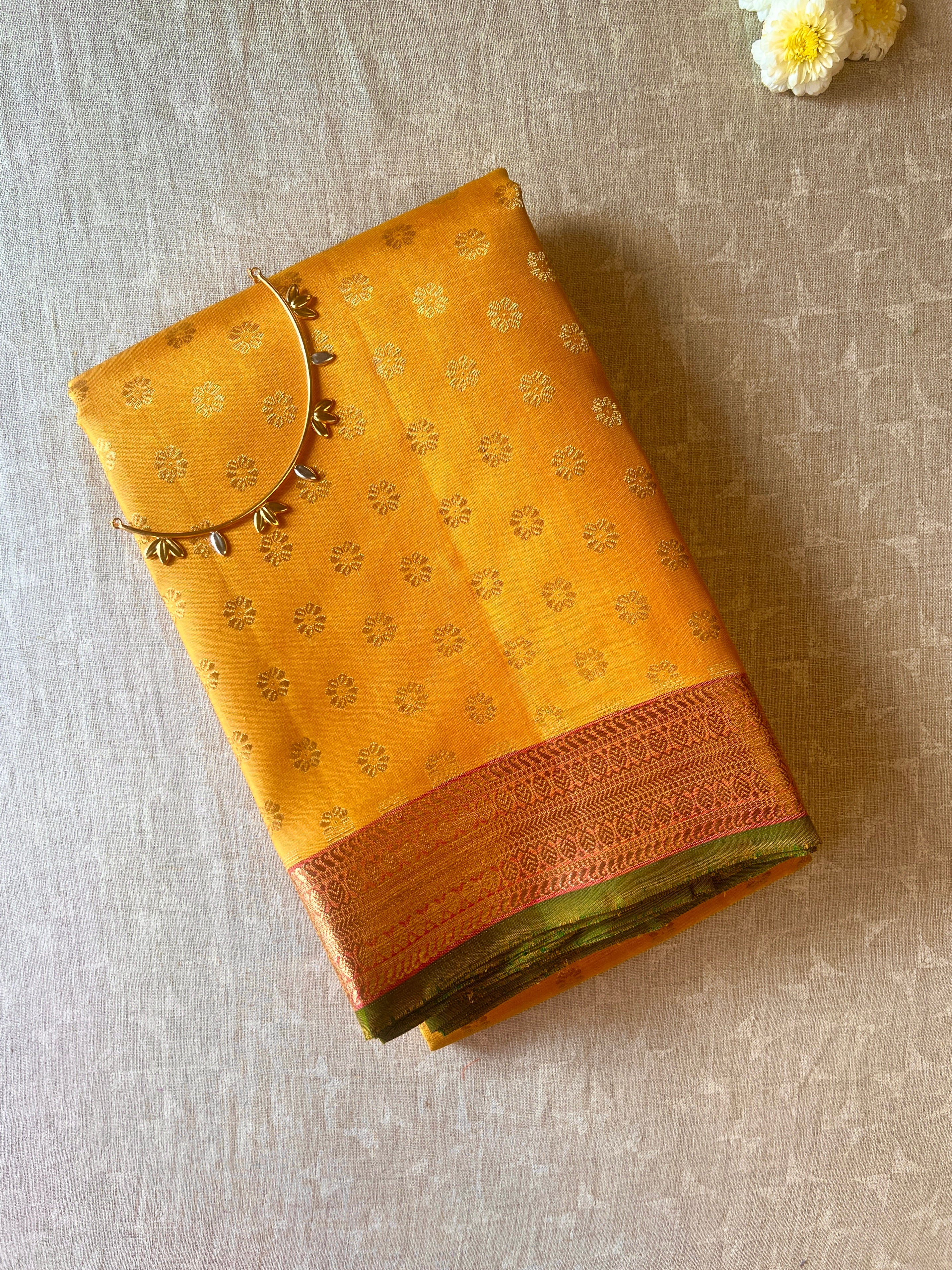 - Handwoven in the fines of silks in Kanchipuram.