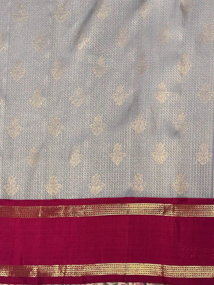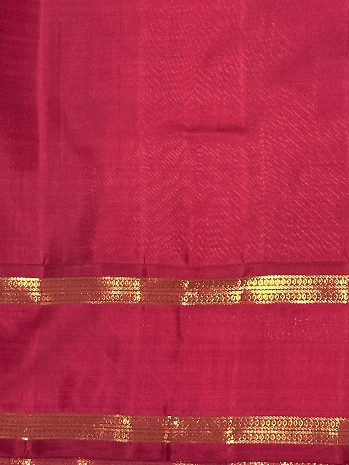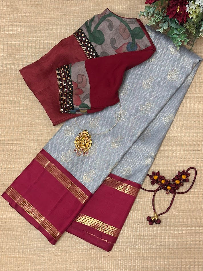• Contrast blouse and pallu richly woven with Zari, adding depth and traditional elegance.