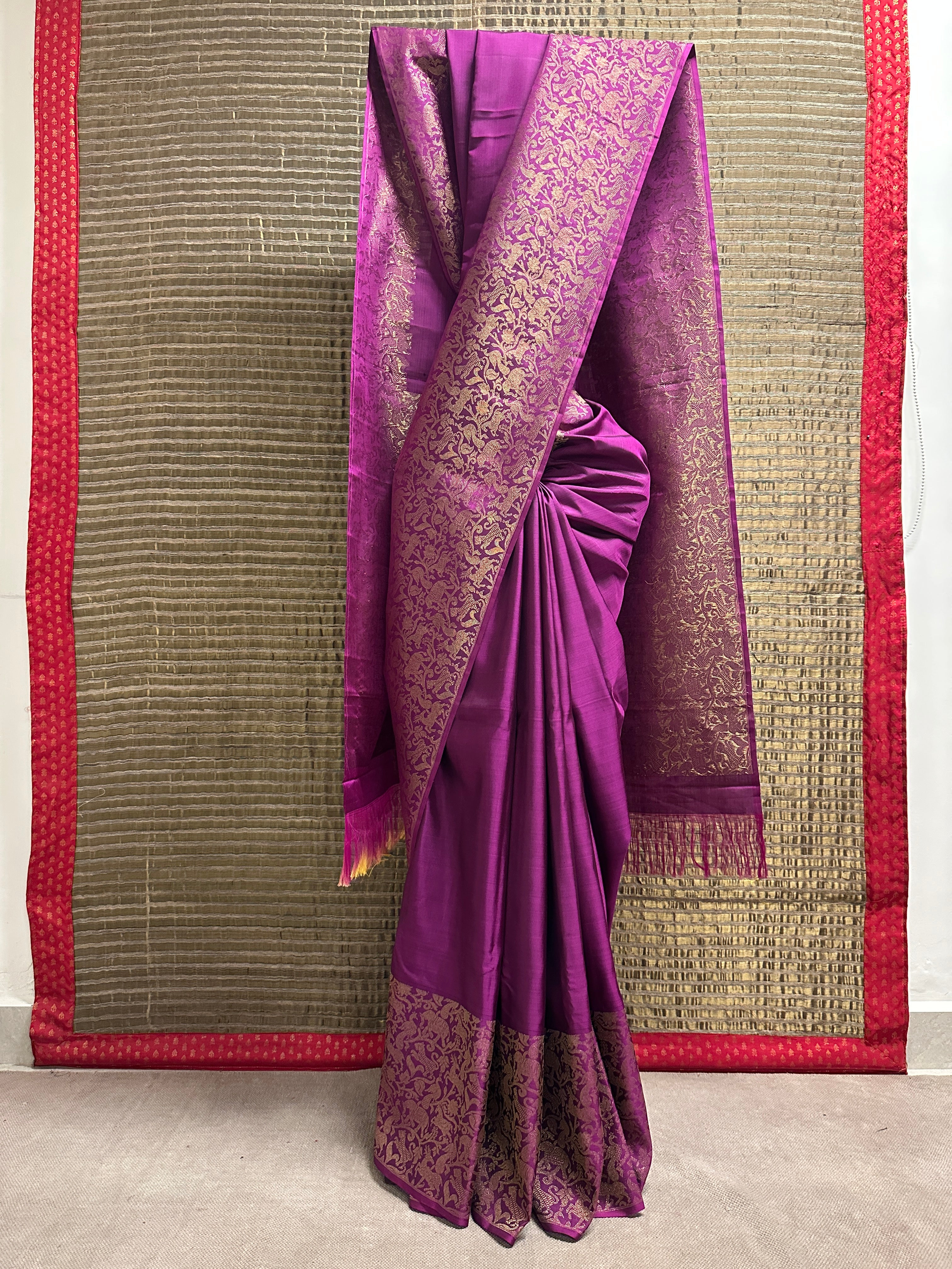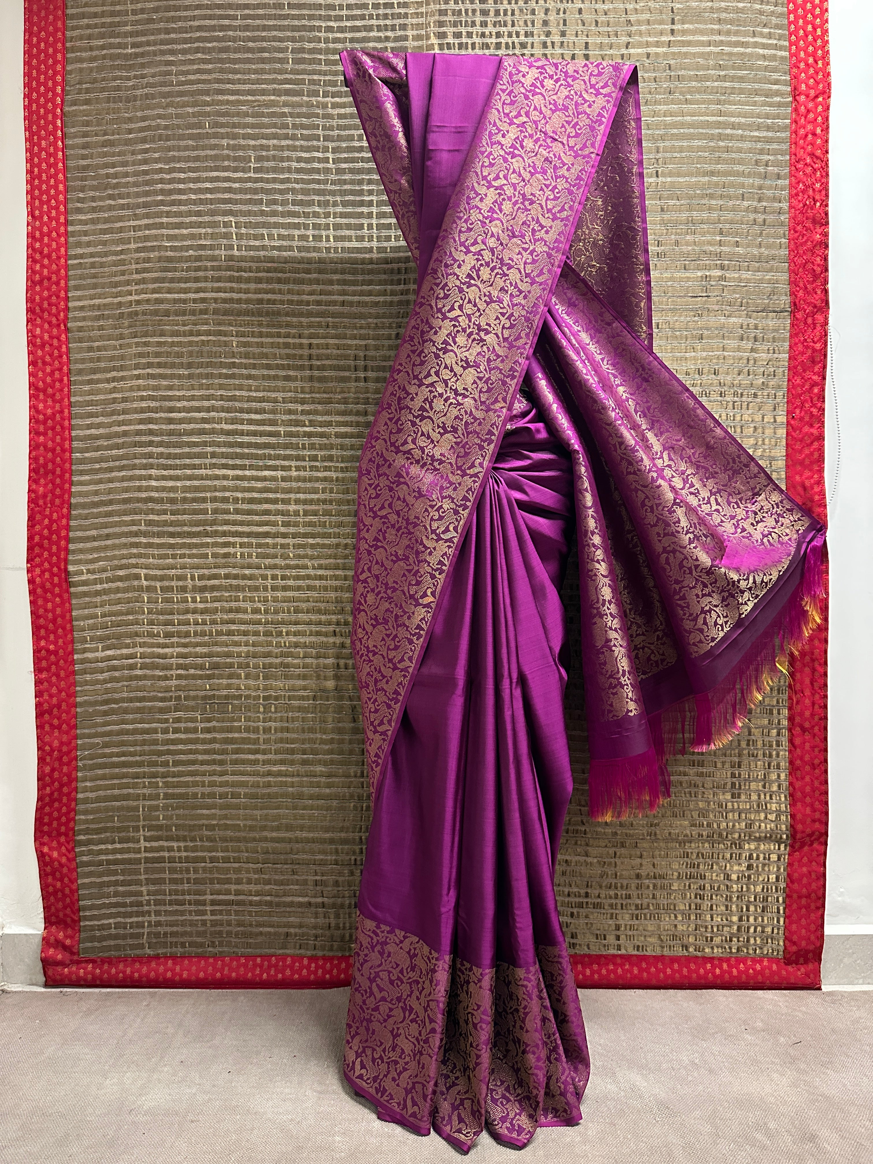 • Grand Vanasingaram pallu intricately woven with motifs of flora and fauna.