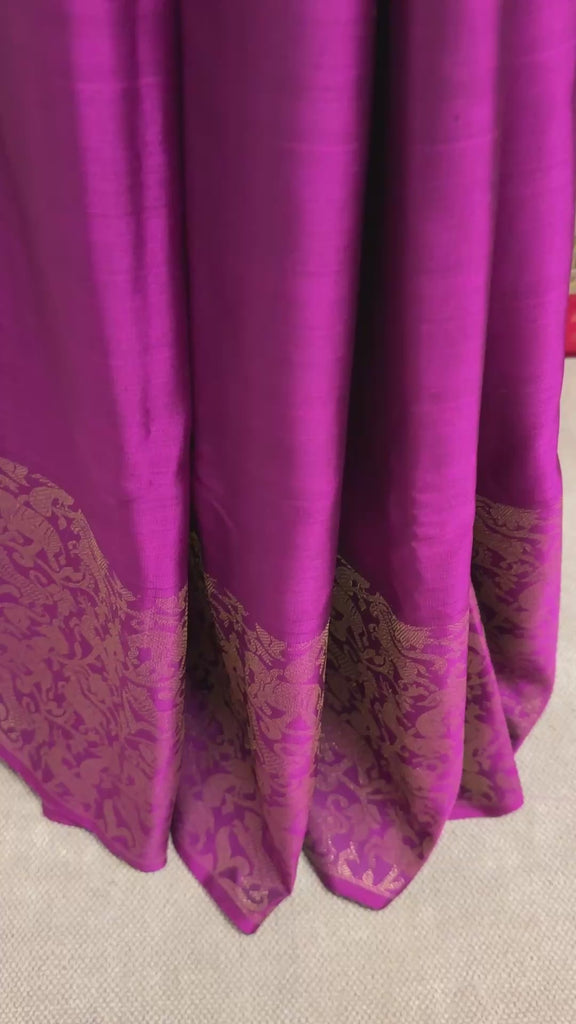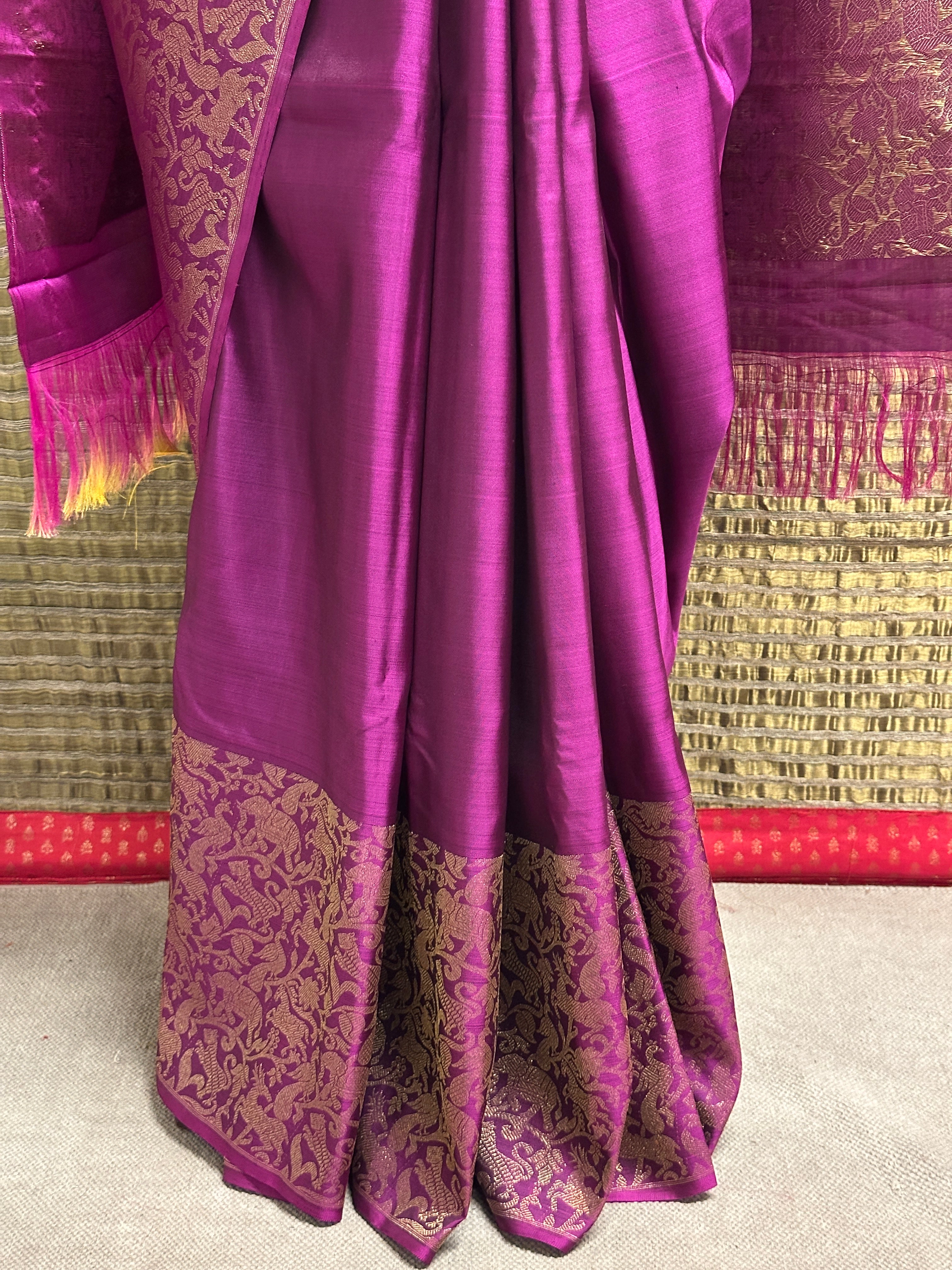 • Features a stunning Vana Singaram border with one side long and the other side short for a traditional yet striking silhouette.