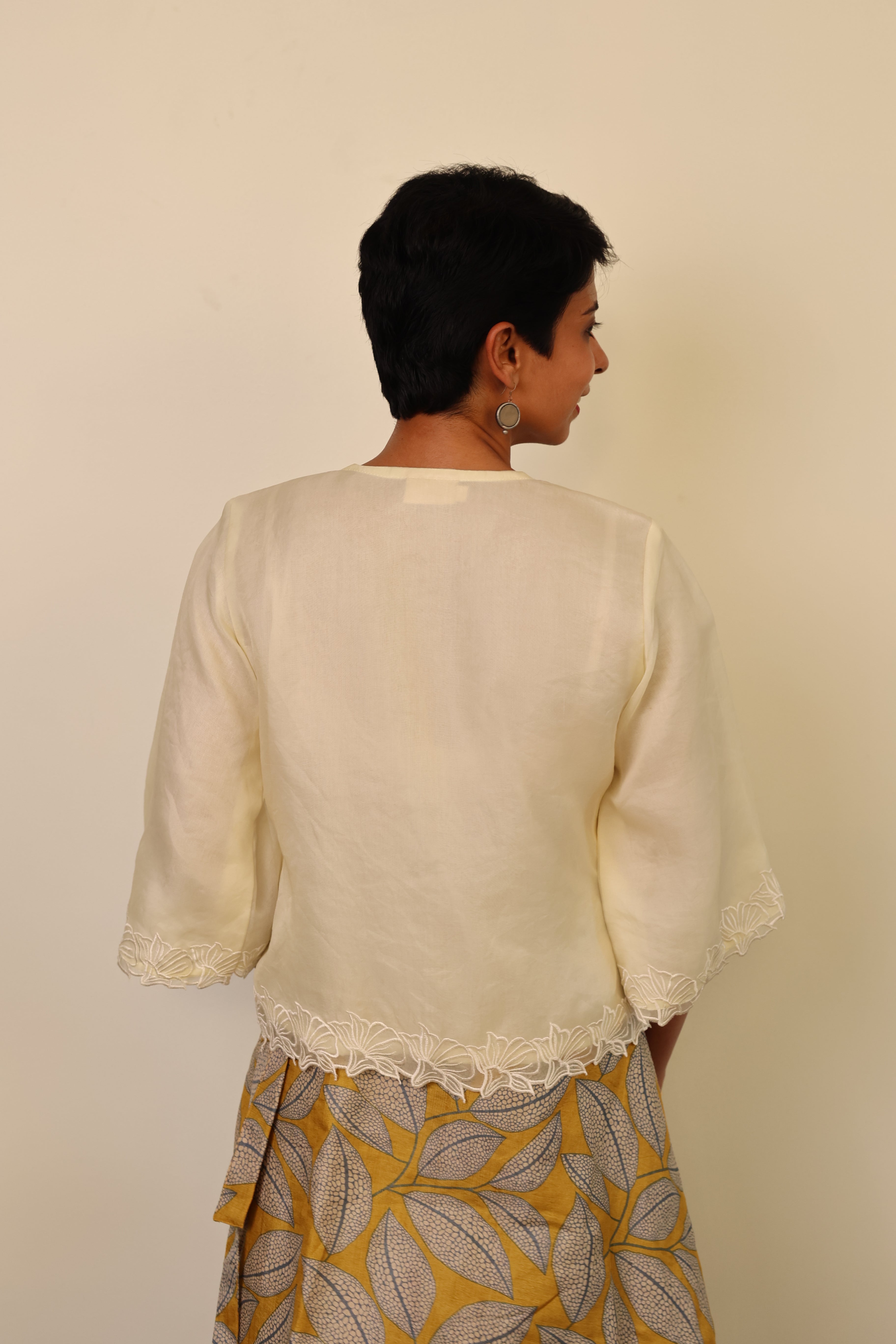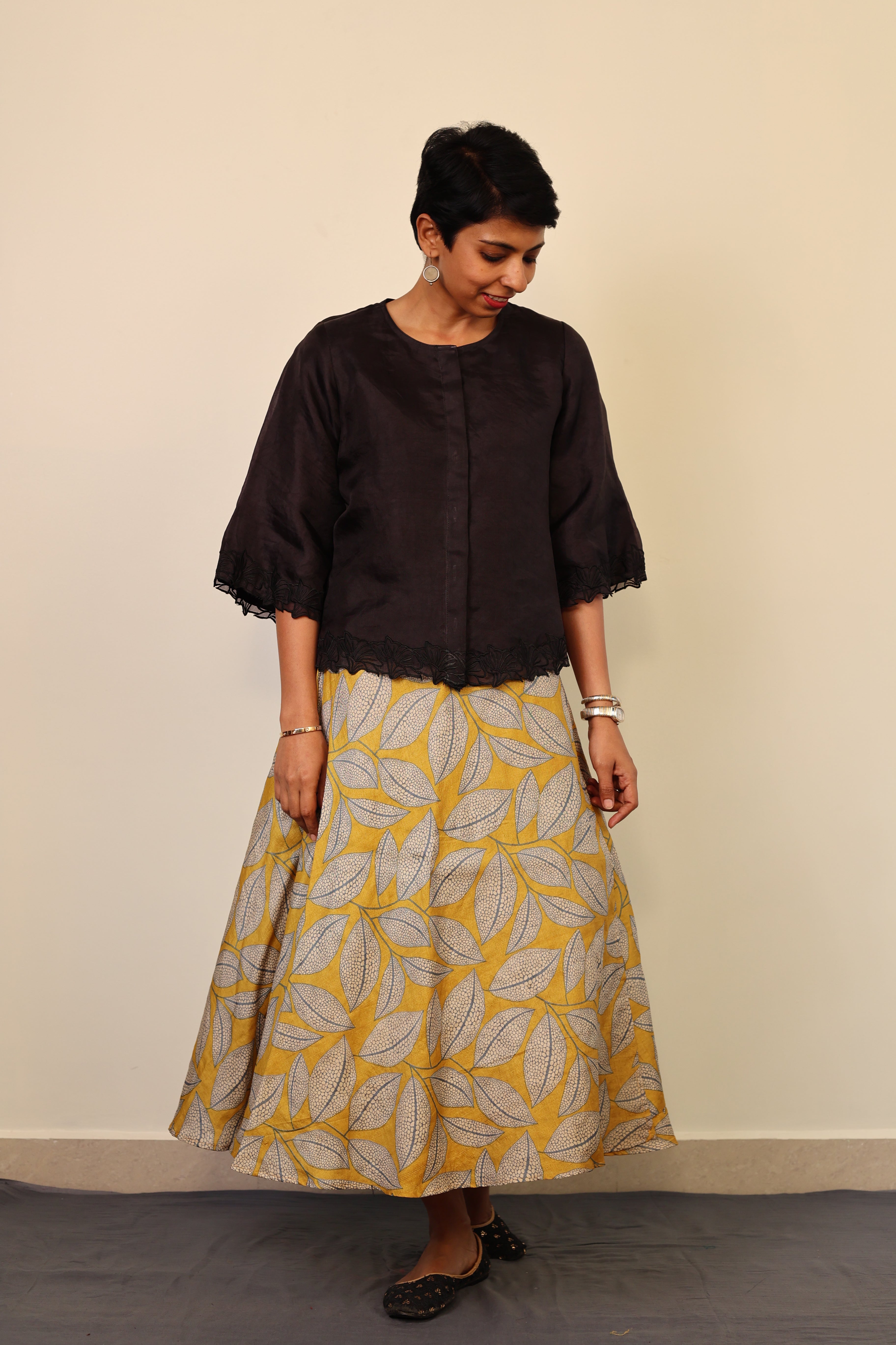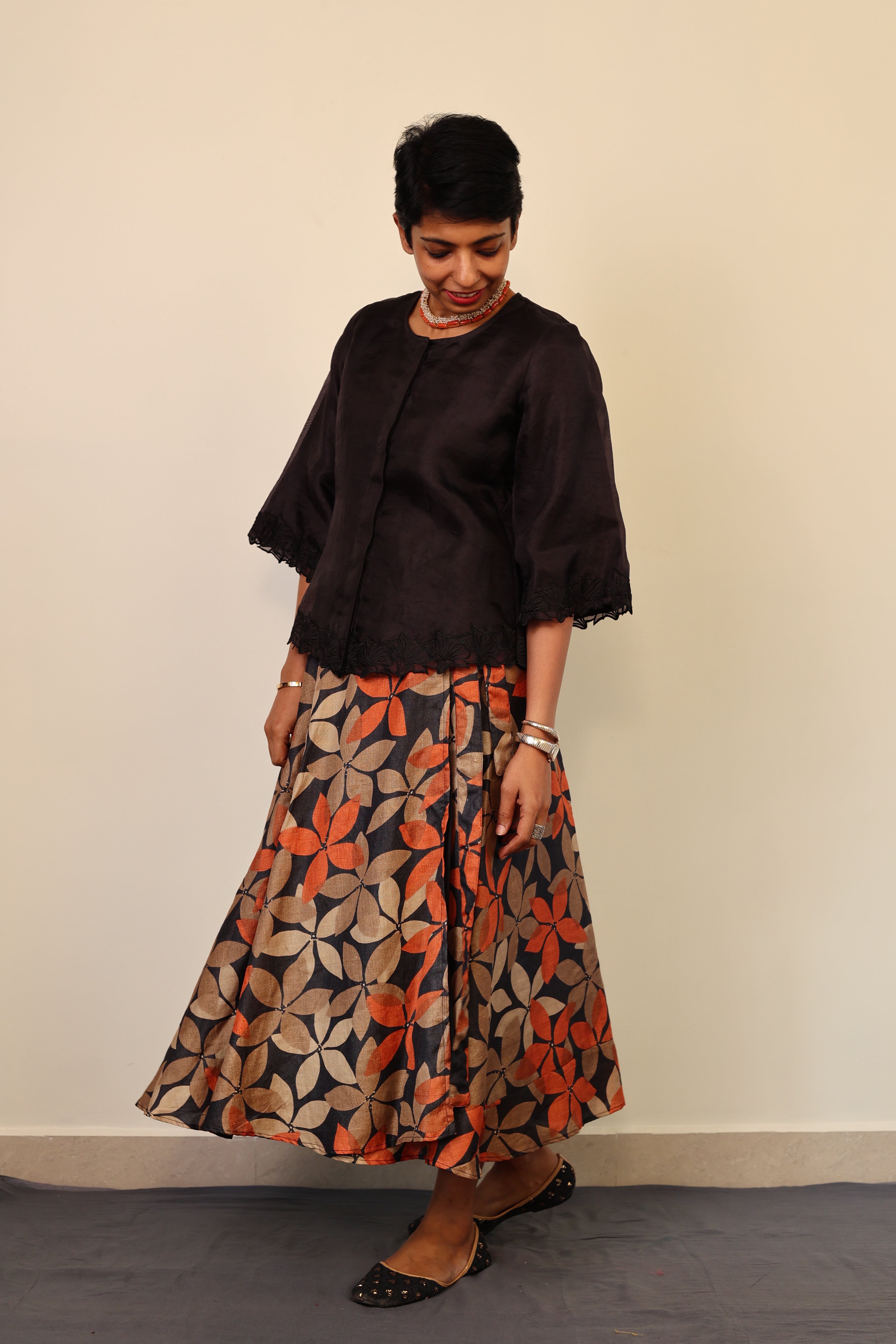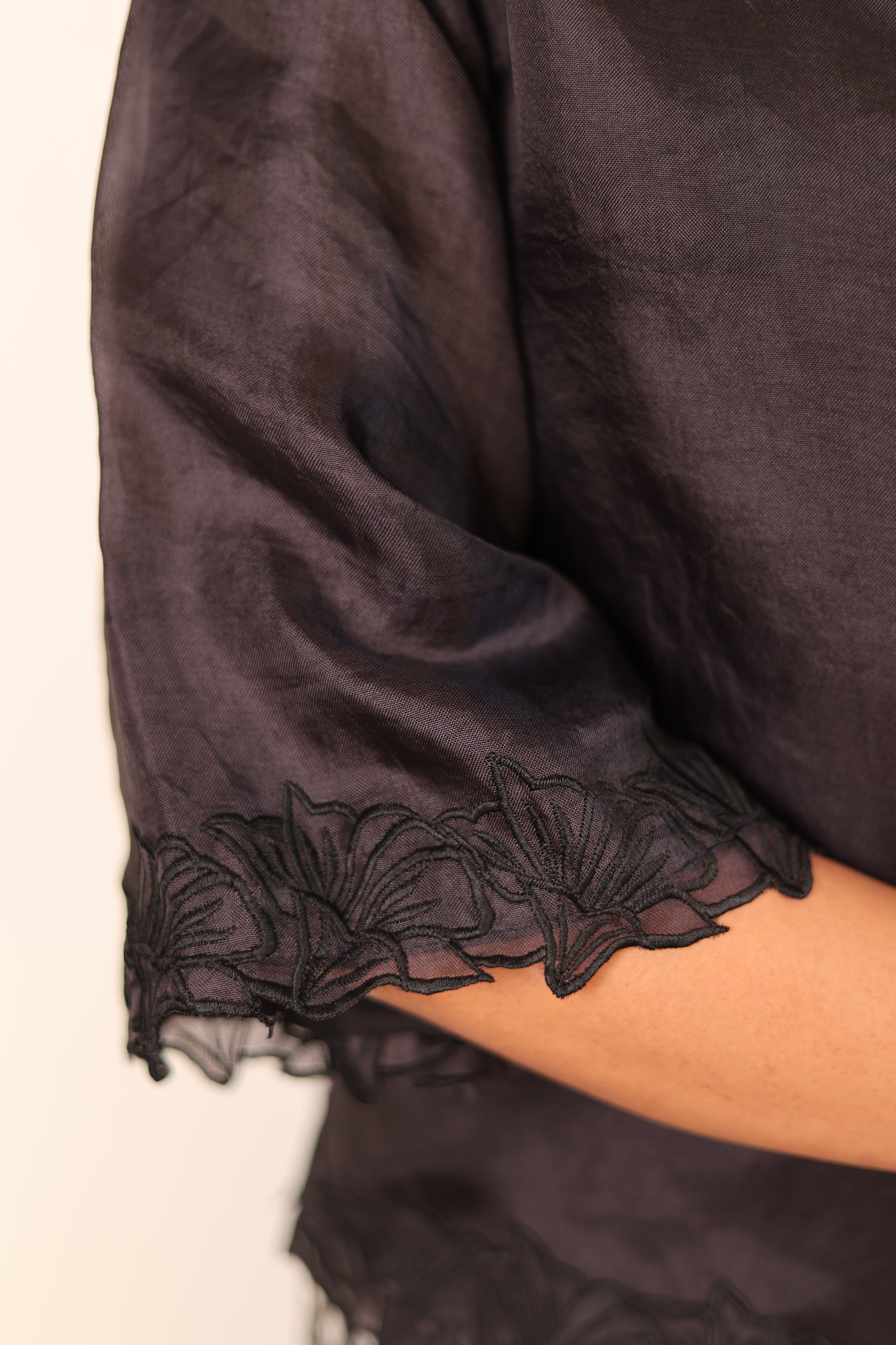 - Floral embroidery on the hemline and sleeves