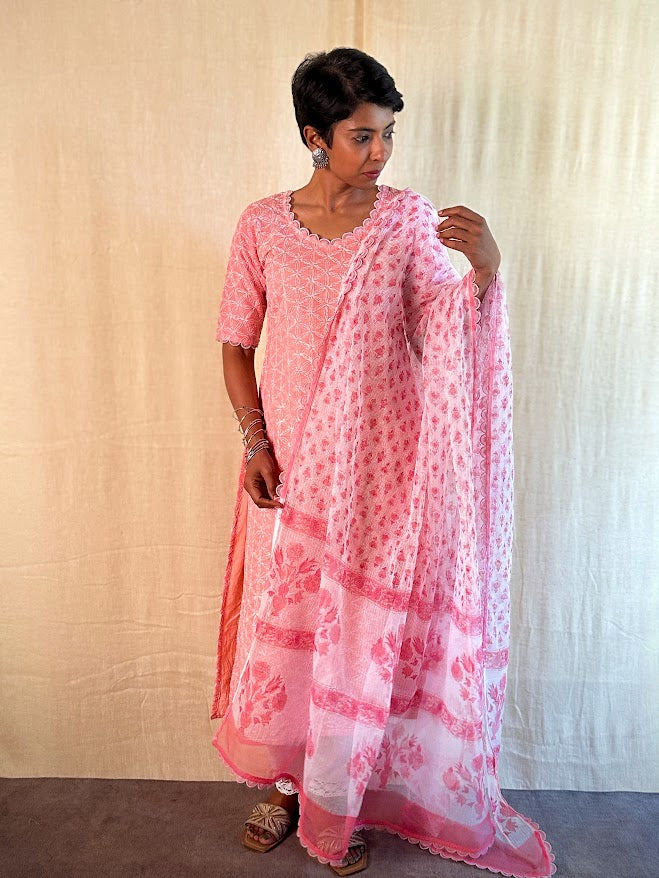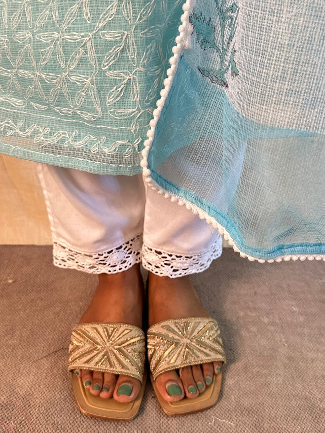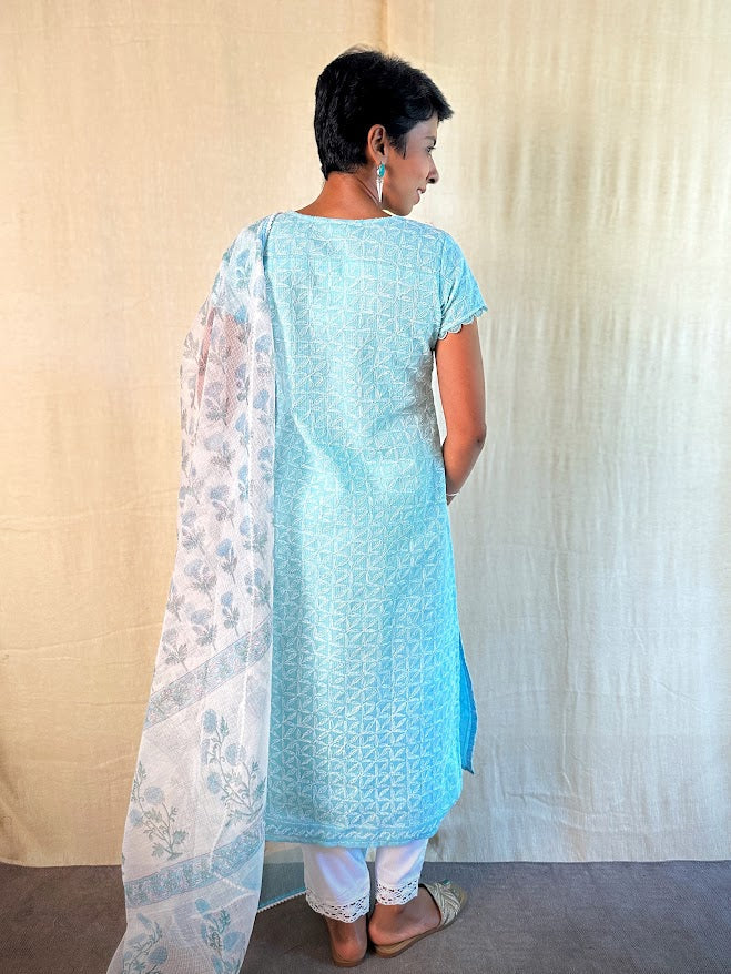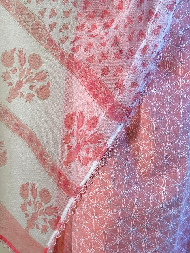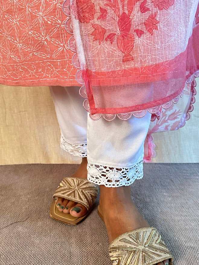 Hand embroidered chikankari work Soft kota doriya base Handprinted kota doriya dupatta Plain white soft cotton bottom with lace detailing Three piece set Gentle handwash only