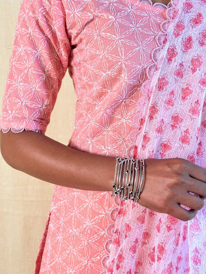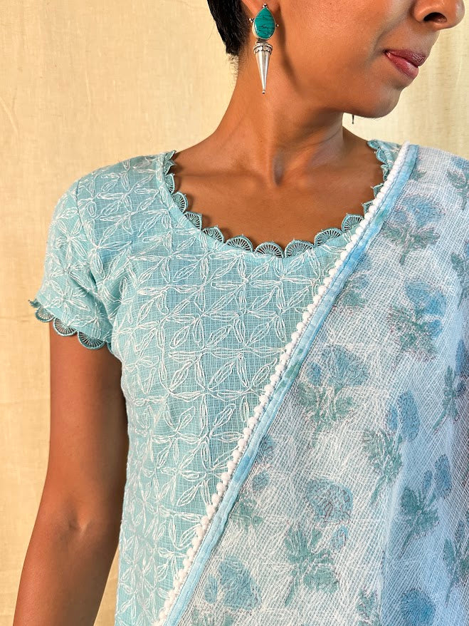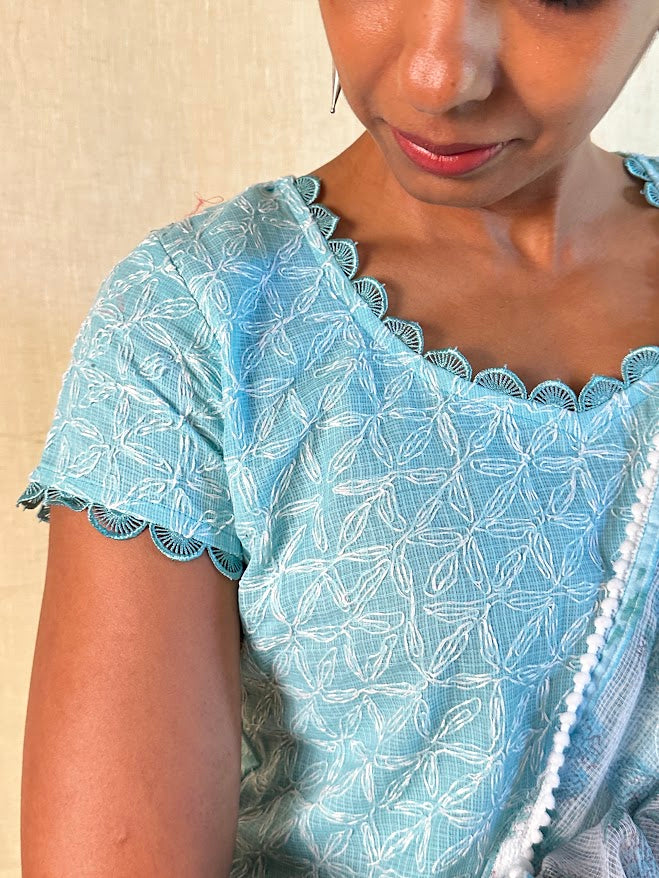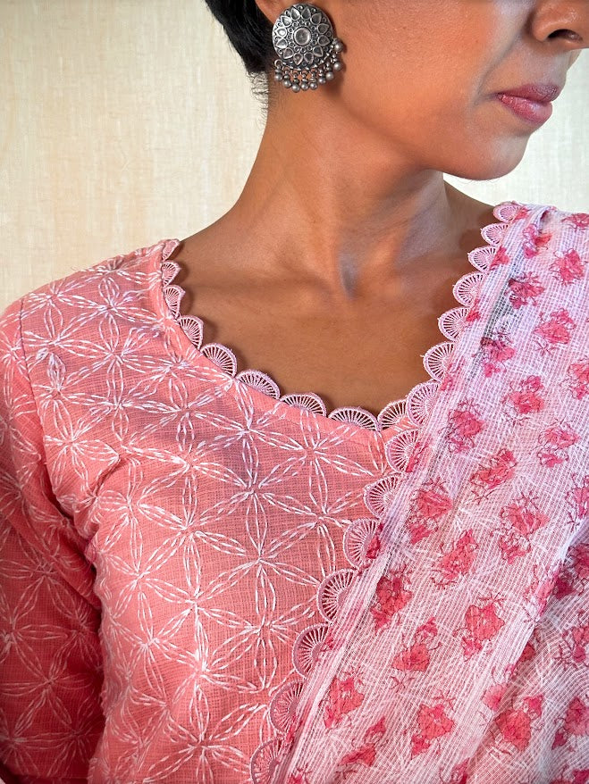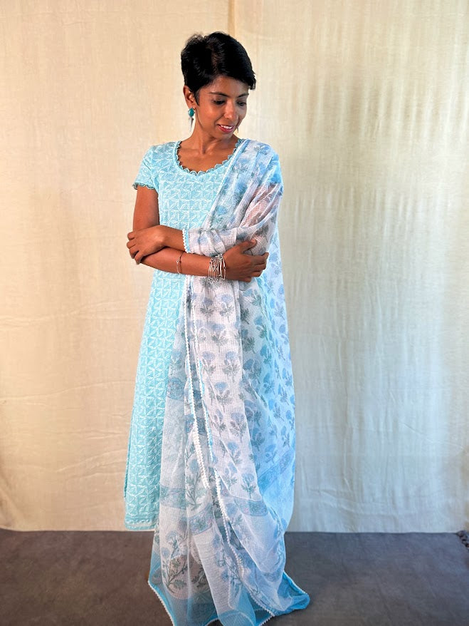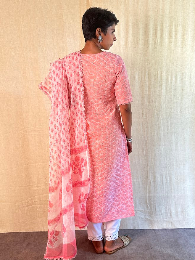 Hand embroidered chikankari work Soft kota doriya base Handprinted kota doriya dupatta Plain white soft cotton bottom with lace detailing Three piece set Gentle handwash only