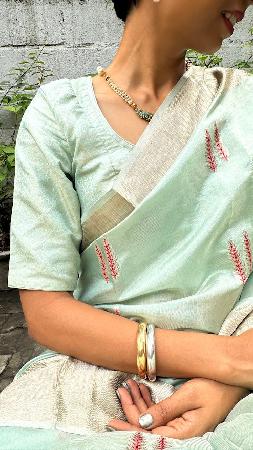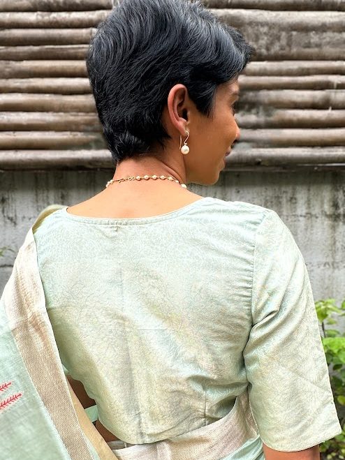 A lovely pastel addition to our range of versatile and stylish blouses is this powder blue silk brocade blouse. It has antique zari work all over which is highlighted with the high neck back. With a low round neck at the front and a front-opening design, it elevates the functionality of your wardrobe ensuring it works effortlessly for you.