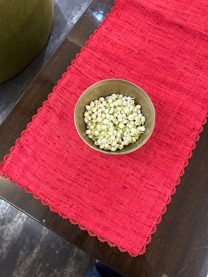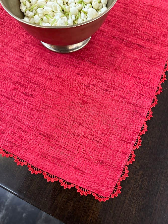 Red linen table runner with hand crafted lace edging.Wash care : Gentle hand wash / Dry clean onlyLength : 72 "Width : 16"