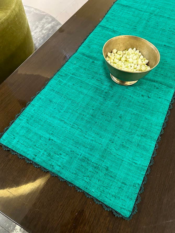 Teal linen table runner with hand crafted lace edging.Wash care : Gentle hand wash / Dry clean onlyLength : 72 "Width : 16"
