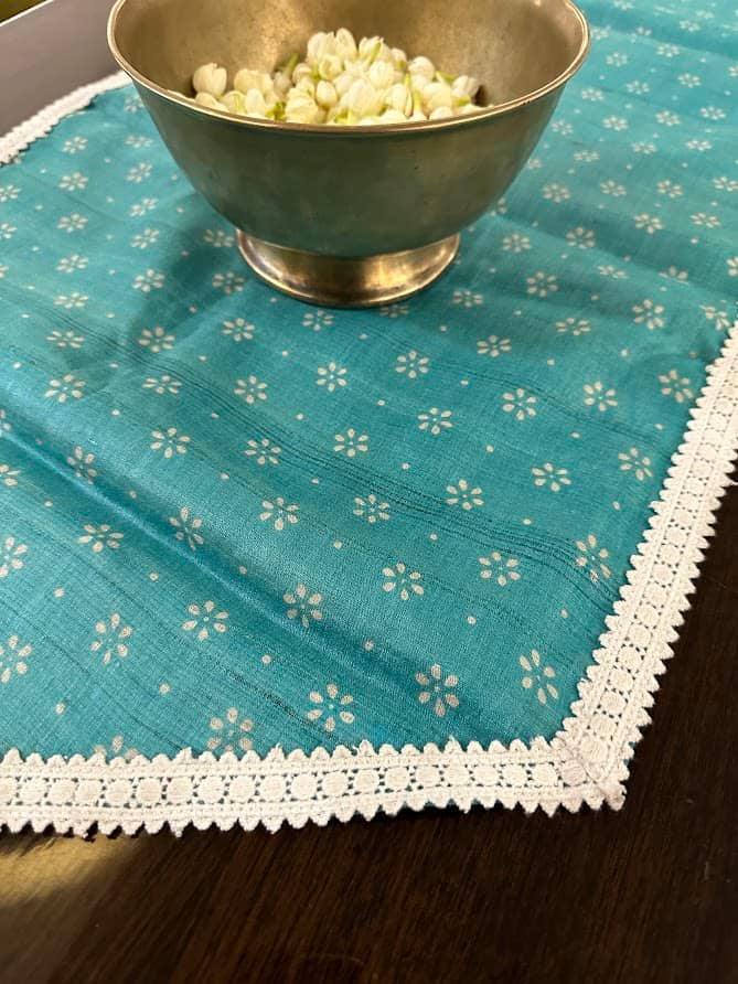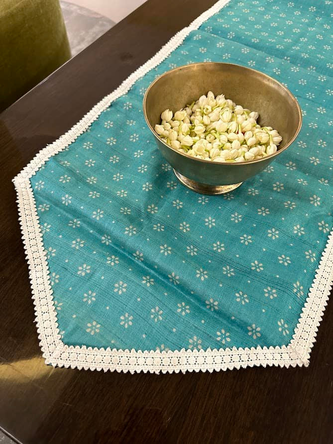 Turquoise silk table runner with hand crafted lace edging.Wash care : Gentle hand wash / Dry clean onlyLength : 72 "Width : 16"