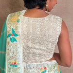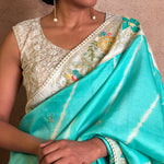 Beige tussar silk blouse with delicate white Chikankari hand embroidery.
