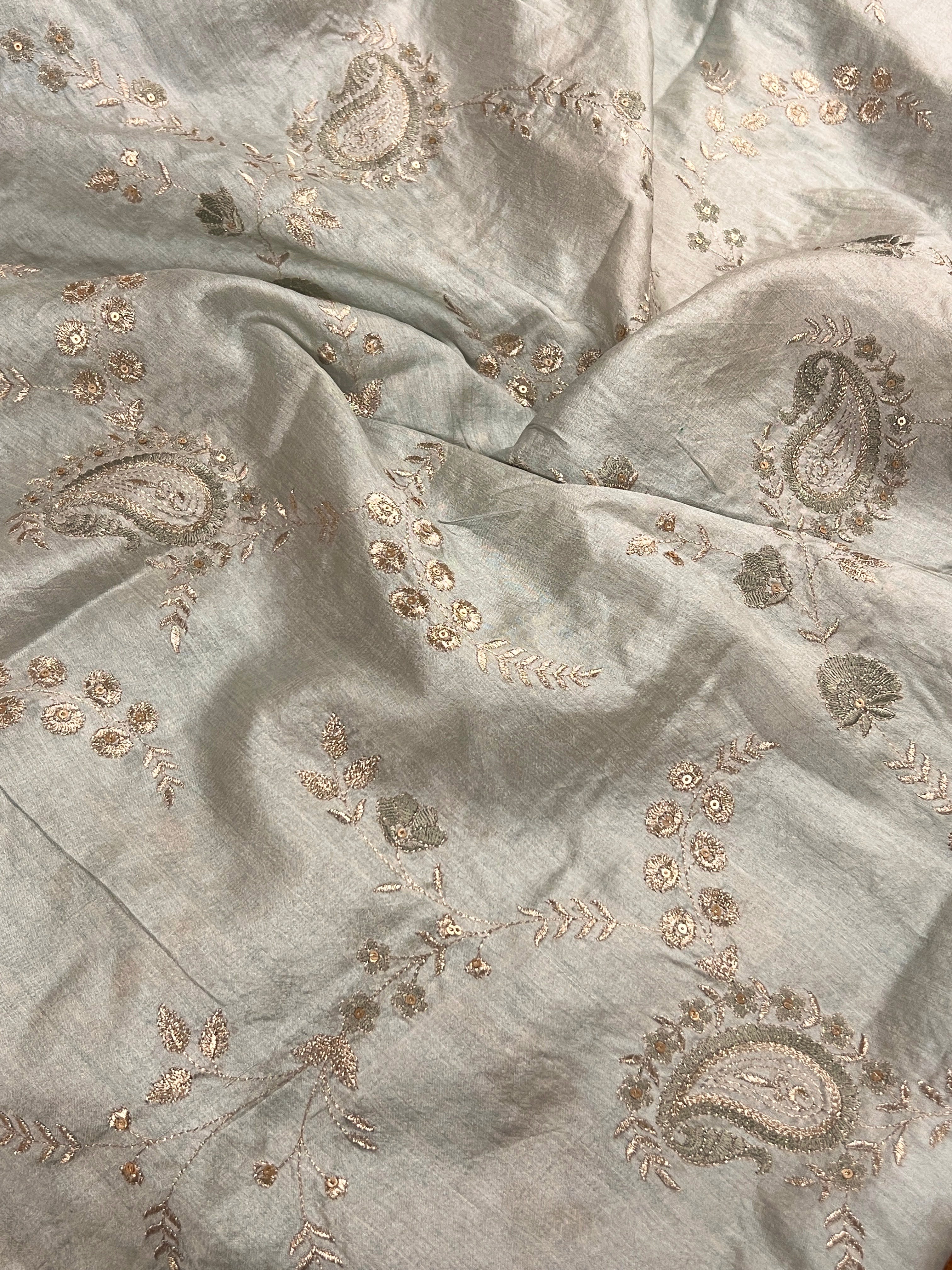 Pale blue embroidered tussar fabric